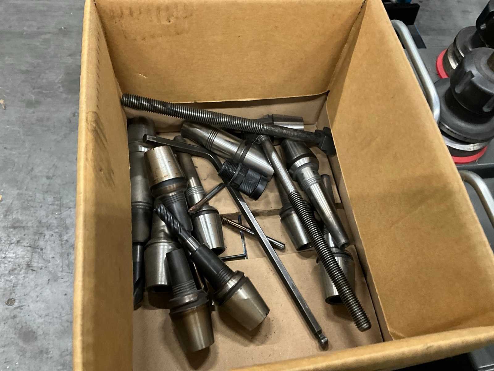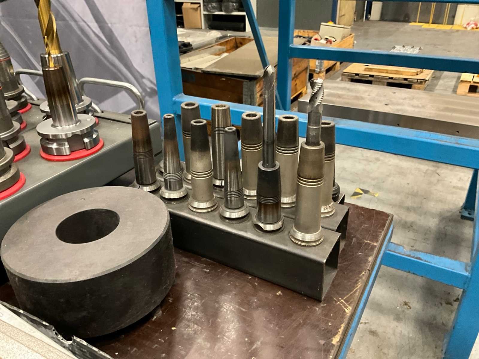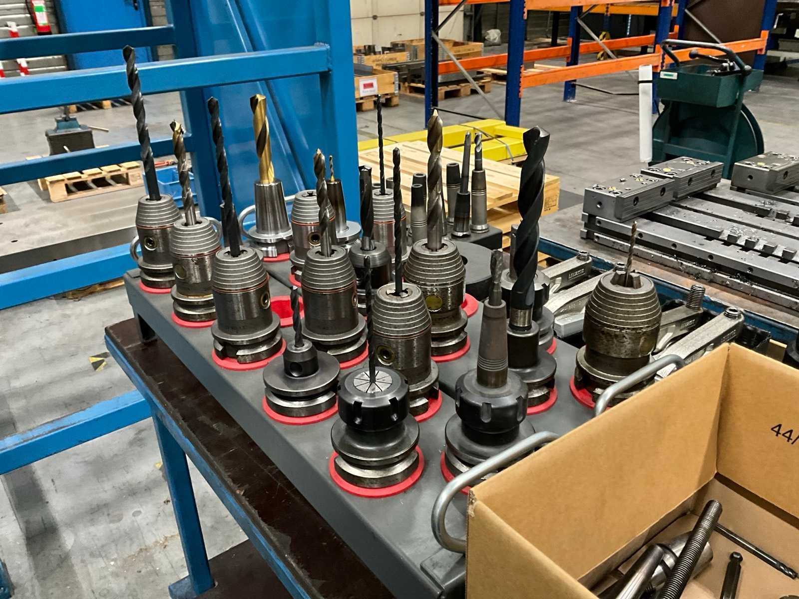 Profielstaal; staal boven en onderblad; inclusief 18 diverse gereedschapshouders BT40; diverse opspangereedschappen; tafel afmeting 900x600x900 mm;