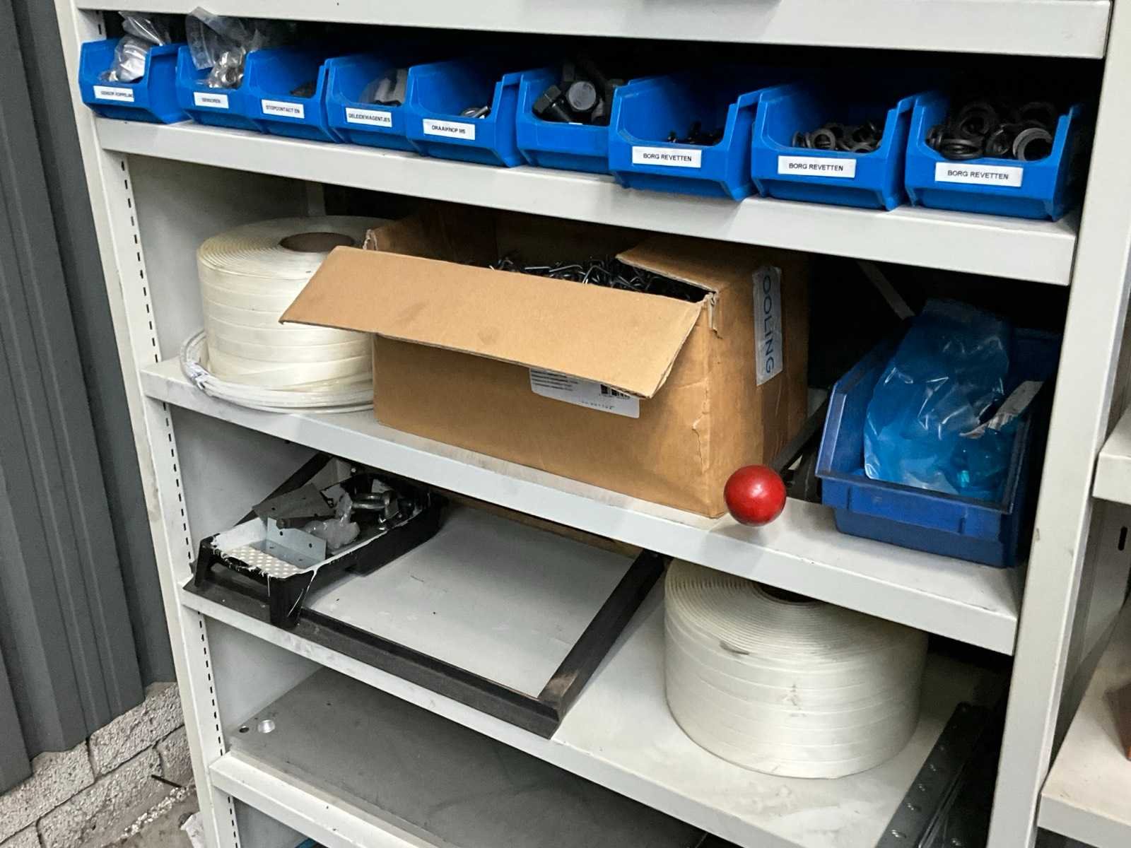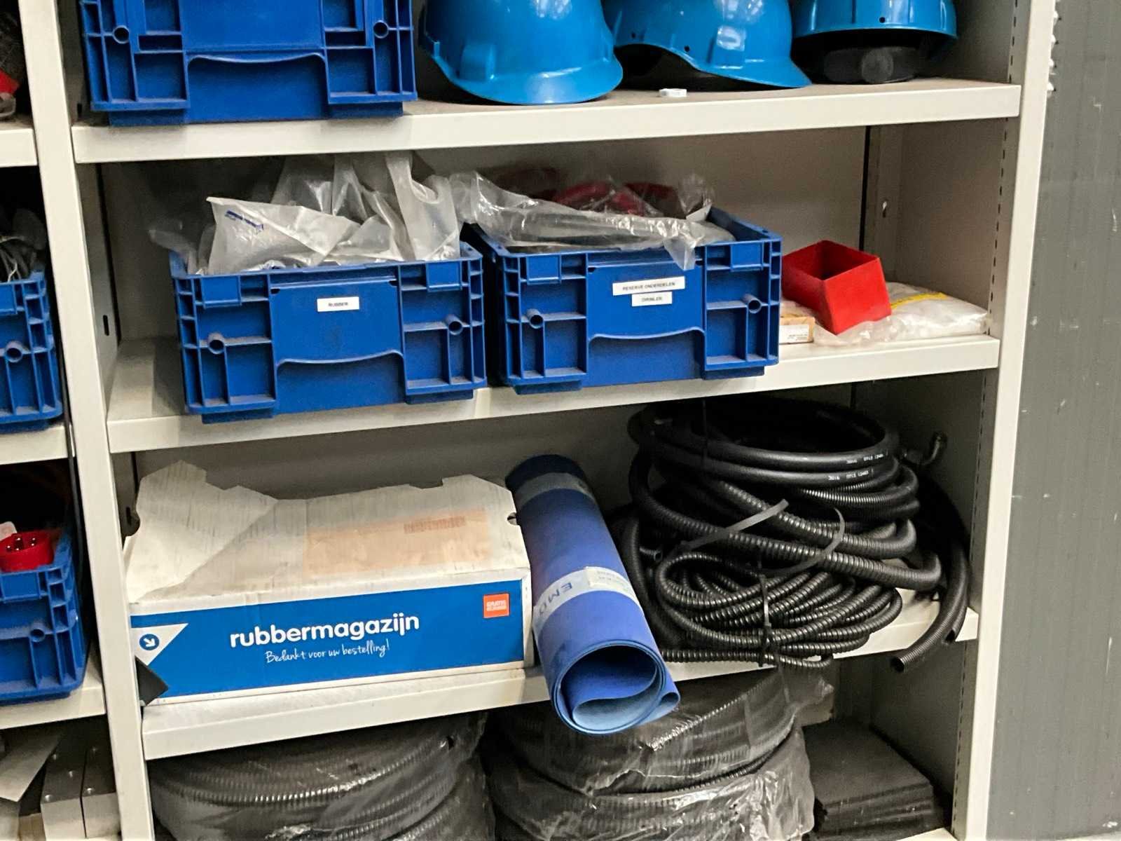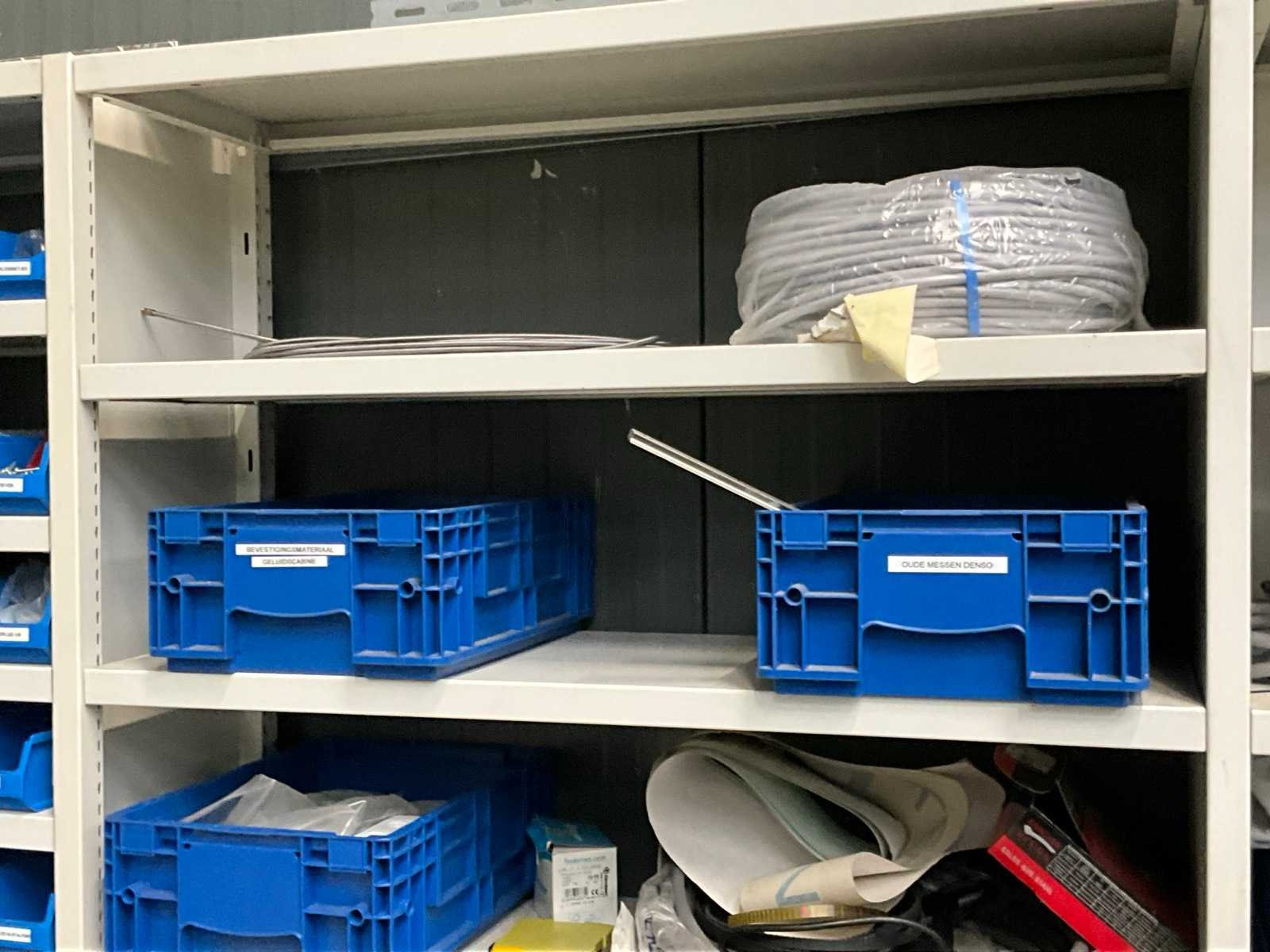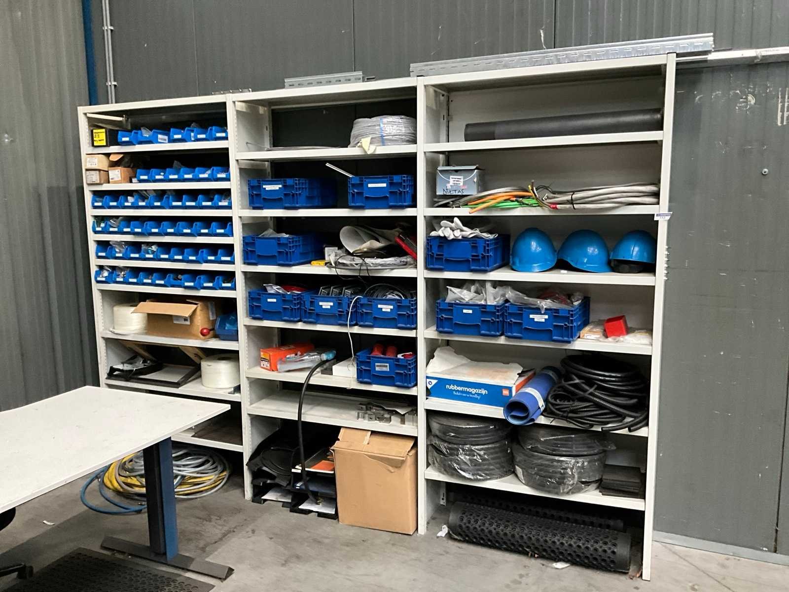 Staal? 3 secties; 4x staander afmeting 350x2120 mm; 28x staal legbord afmeting 970x350 mm; inclusief inhoud waaronder veiligheidshelmen; kunststof voorraad grijpbakjes; nippels; koppelingen; borg revetten; zelftappers; flexbuis;