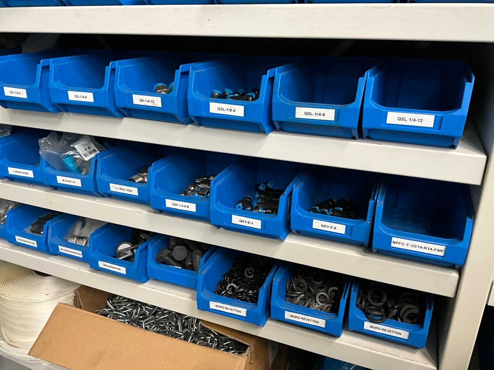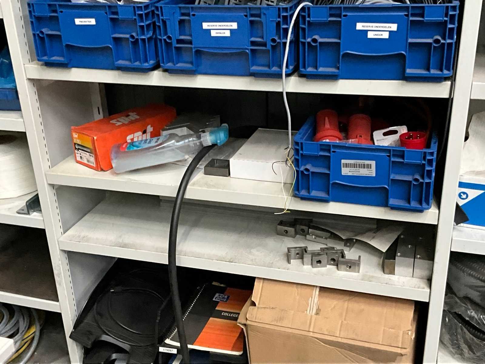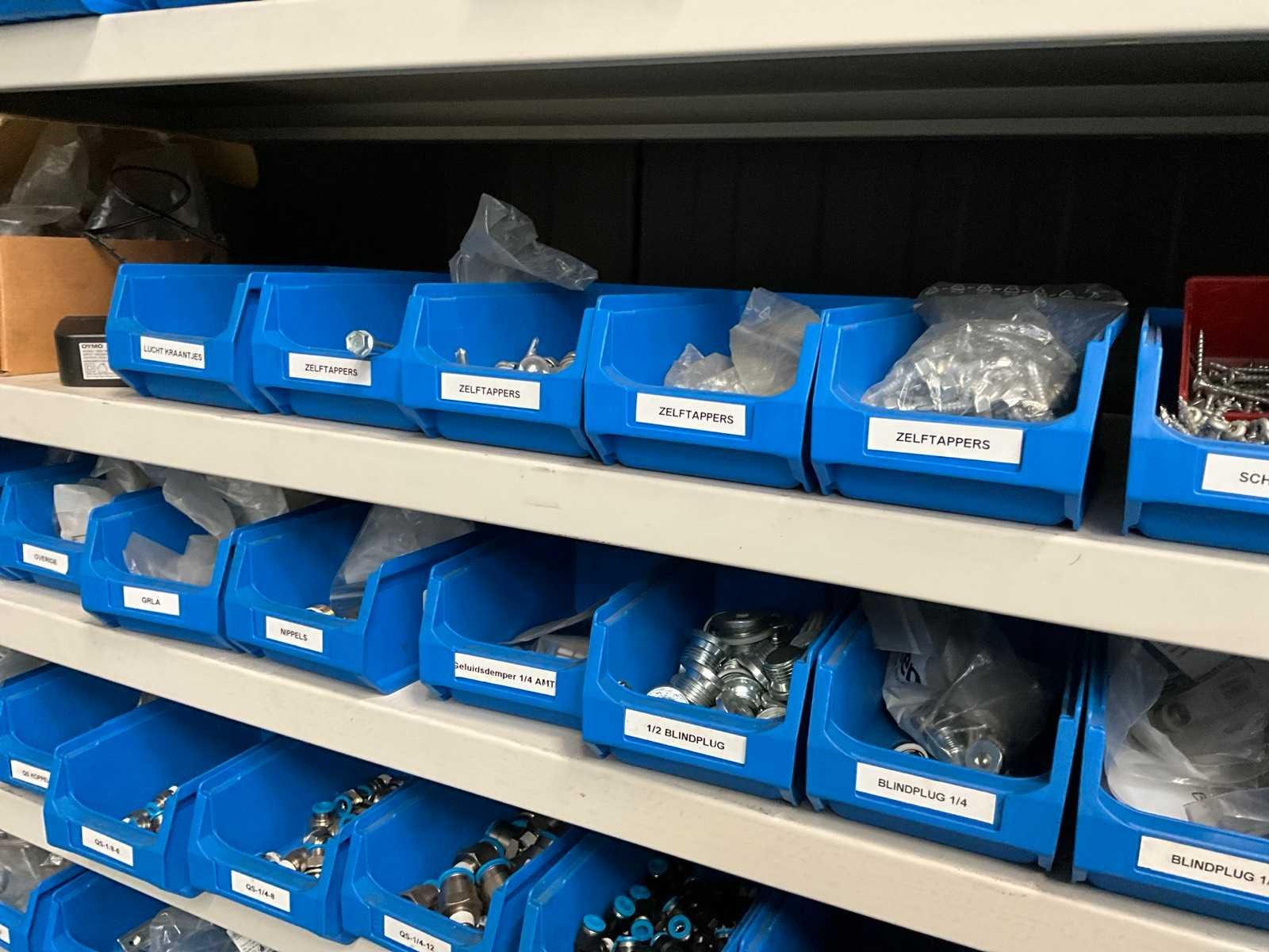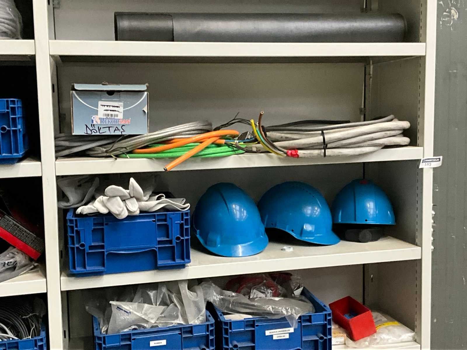 Staal? 3 secties; 4x staander afmeting 350x2120 mm; 28x staal legbord afmeting 970x350 mm; inclusief inhoud waaronder veiligheidshelmen; kunststof voorraad grijpbakjes; nippels; koppelingen; borg revetten; zelftappers; flexbuis;