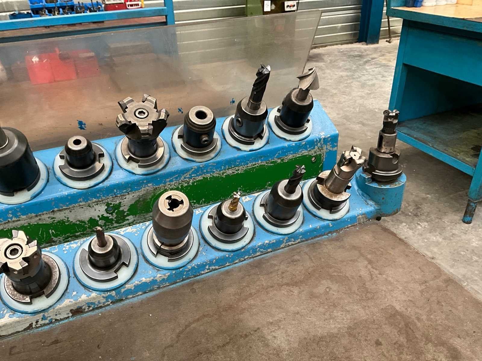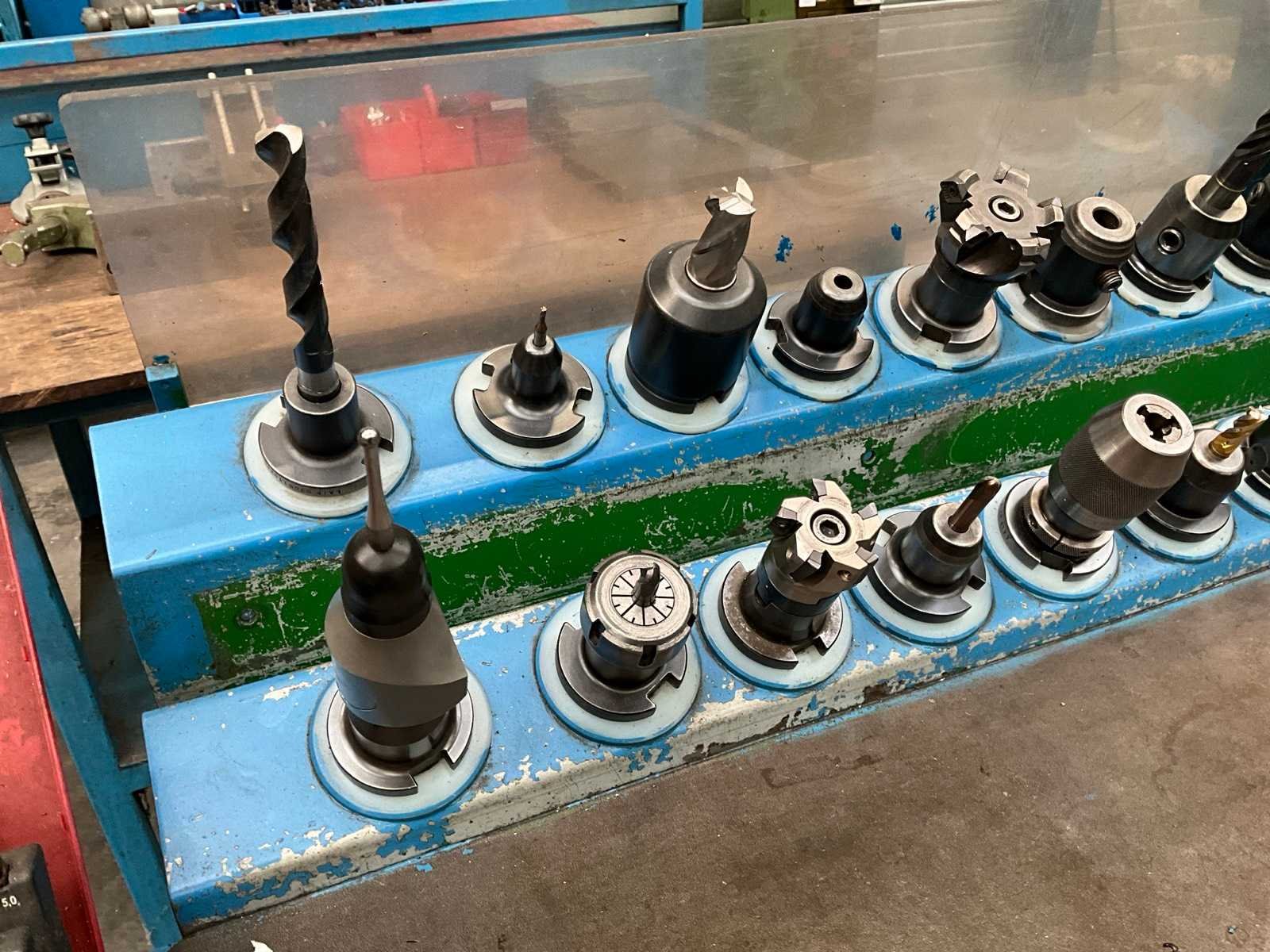 Voorzien van staal tafelblad; staal onderlegbord; voorzien van Record bankschroef bekbreedte 125 mm; inclusief 16 gereedschapshouders BT40 waarvan voorzien van diverse boren; Lengte: 100cm Breedte: 100cm Hoogte: 110cm