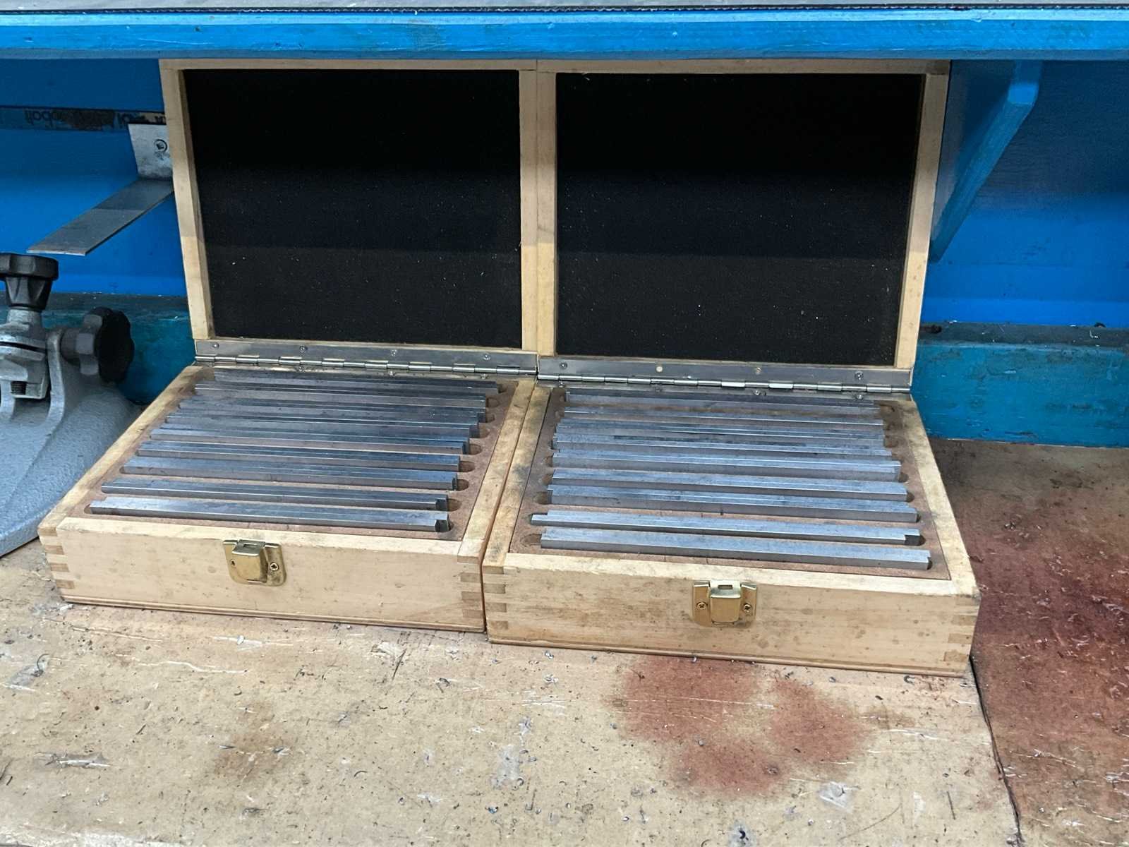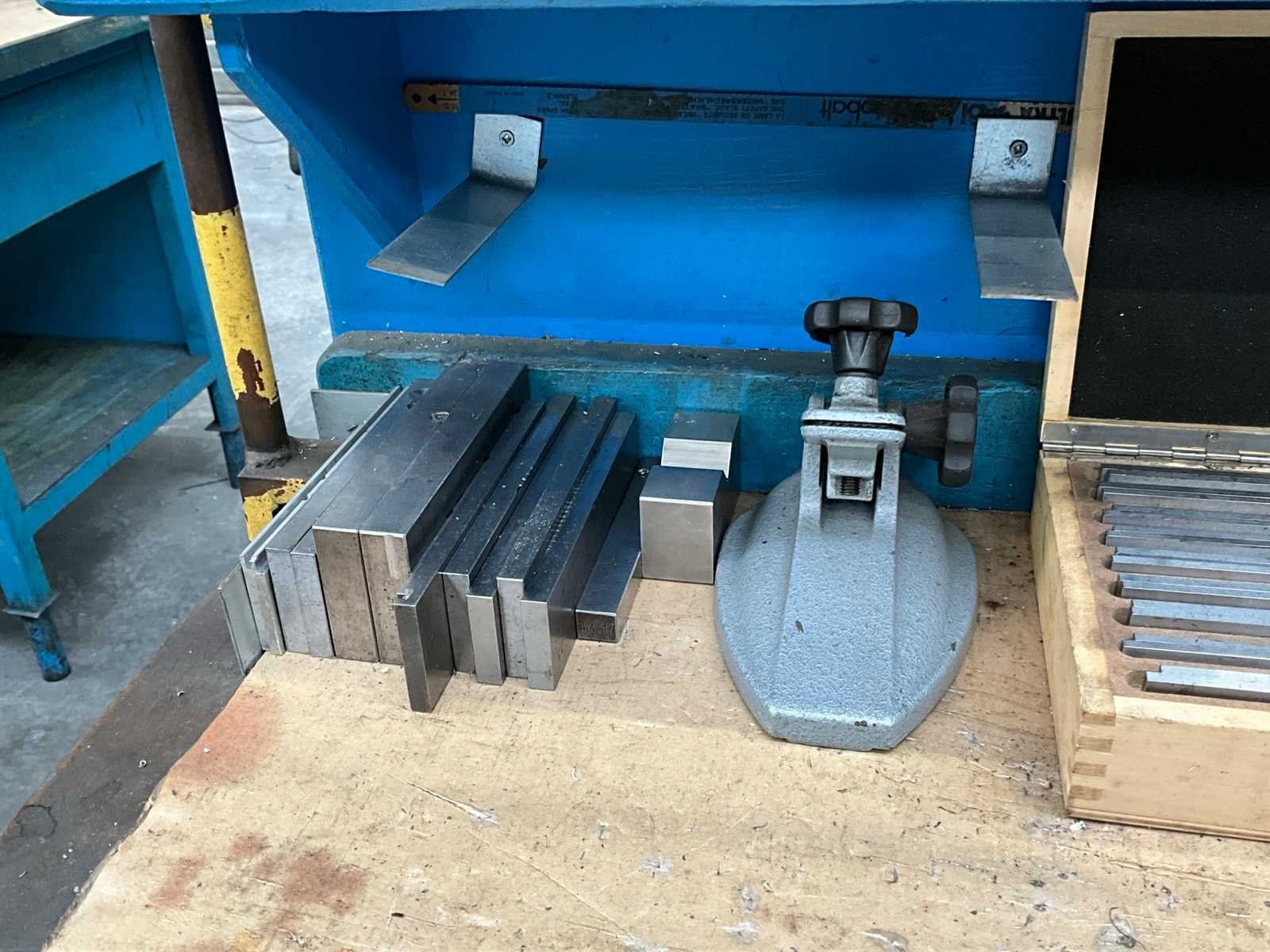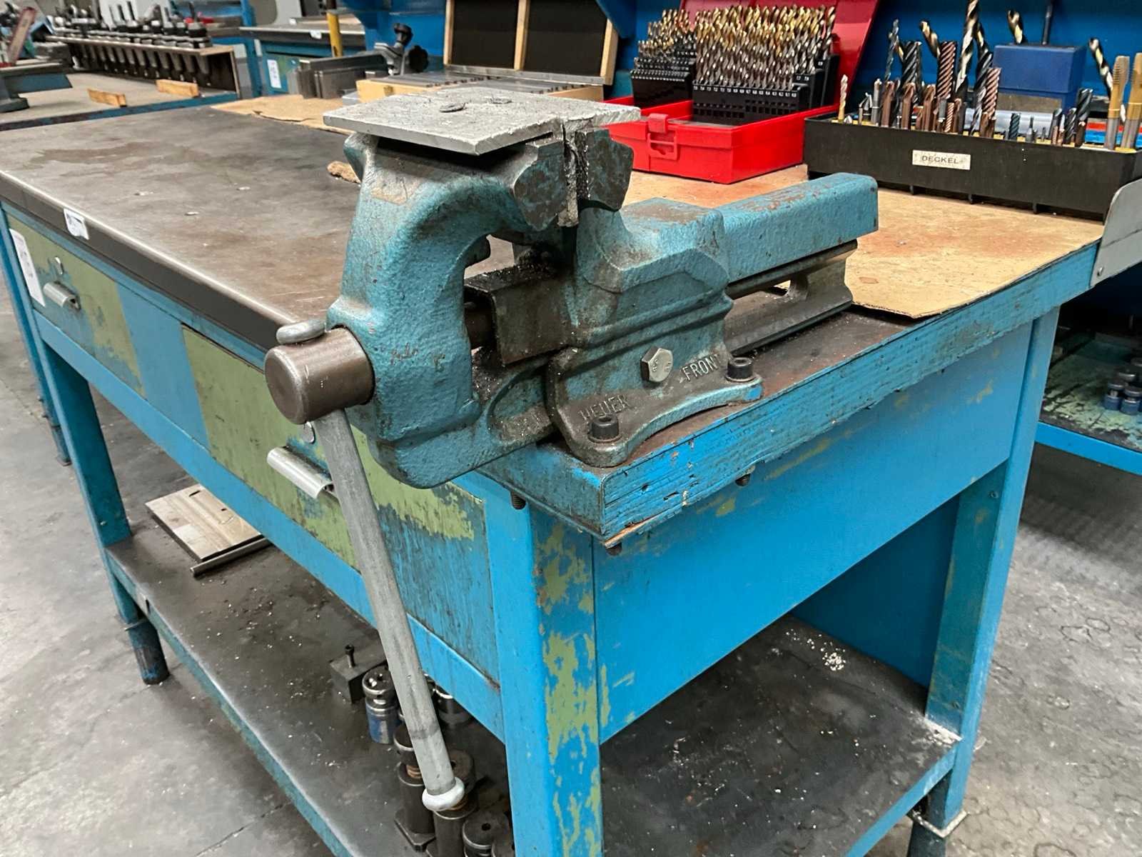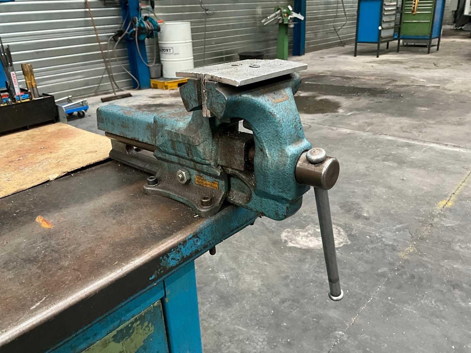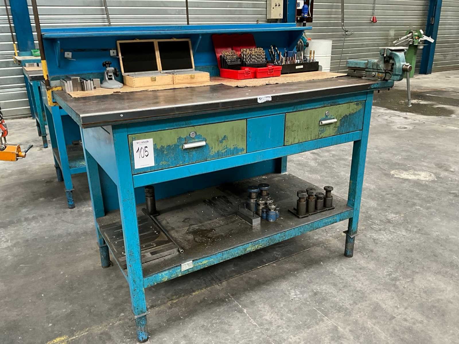 Voorzien van staal bekleed tafelblad; 2x lade; onderlegbord; voorzien van bankschroef bekbreedte 120 mm; diverse inhoud waaronder opspan gereedschappen; handgereedschappen; boren; Lengte: 150cm Breedte: 78cm Hoogte: 130cm