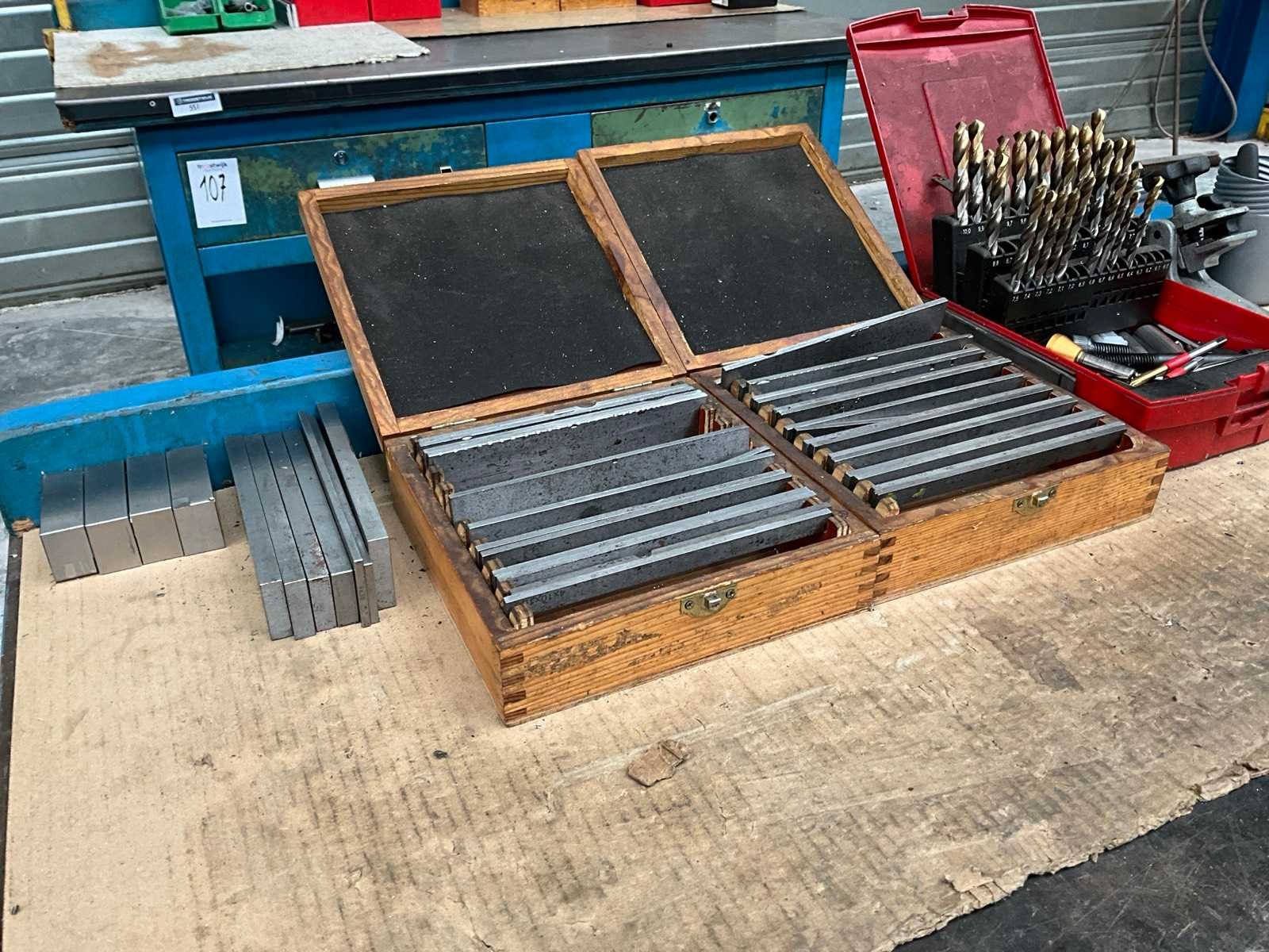 Voorzien van staal bekleed tafelblad; 2x lade; onderlegbord; diverse inhoud waaronder opspan gereedschappen; handgereedschappen; Lengte: 150cm Breedte: 78cm Hoogte: 105cm