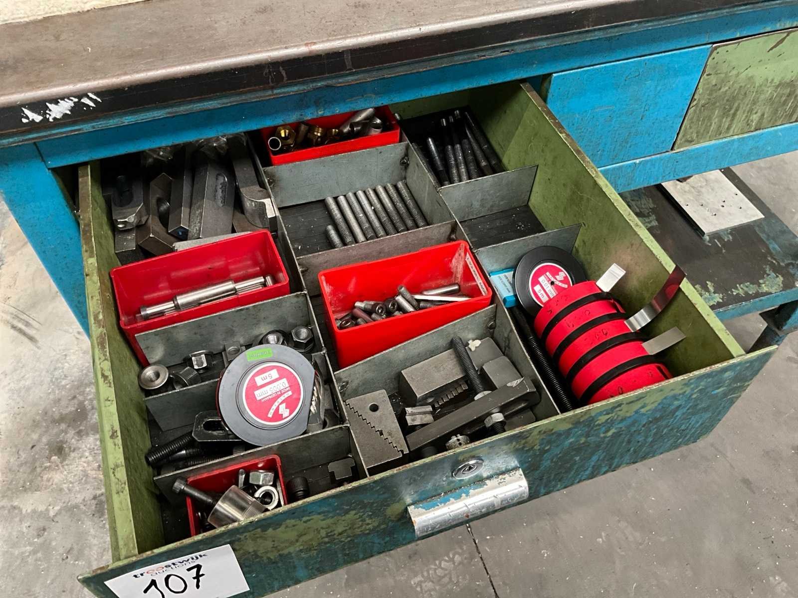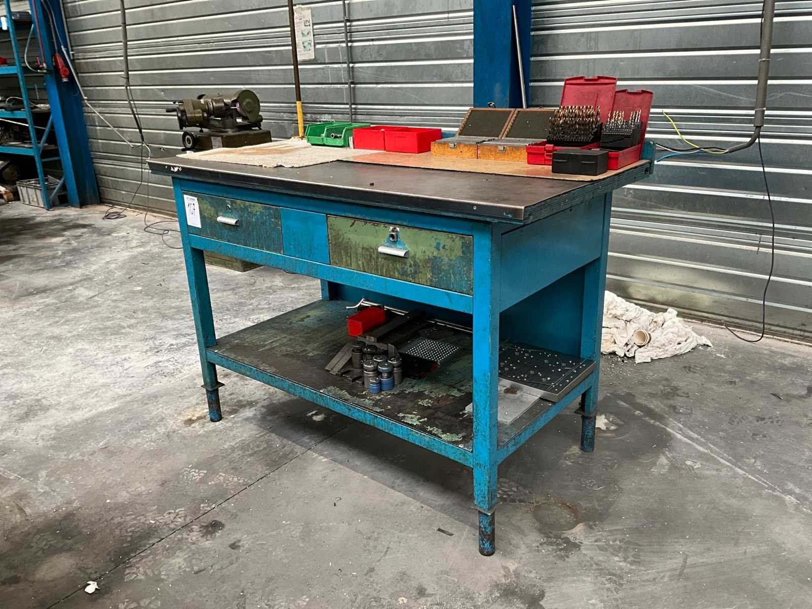 Voorzien van staal bekleed tafelblad; 2x lade; onderlegbord; diverse inhoud waaronder opspan gereedschappen; handgereedschappen; boren; Lengte: 150cm Breedte: 78cm Hoogte: 105cm