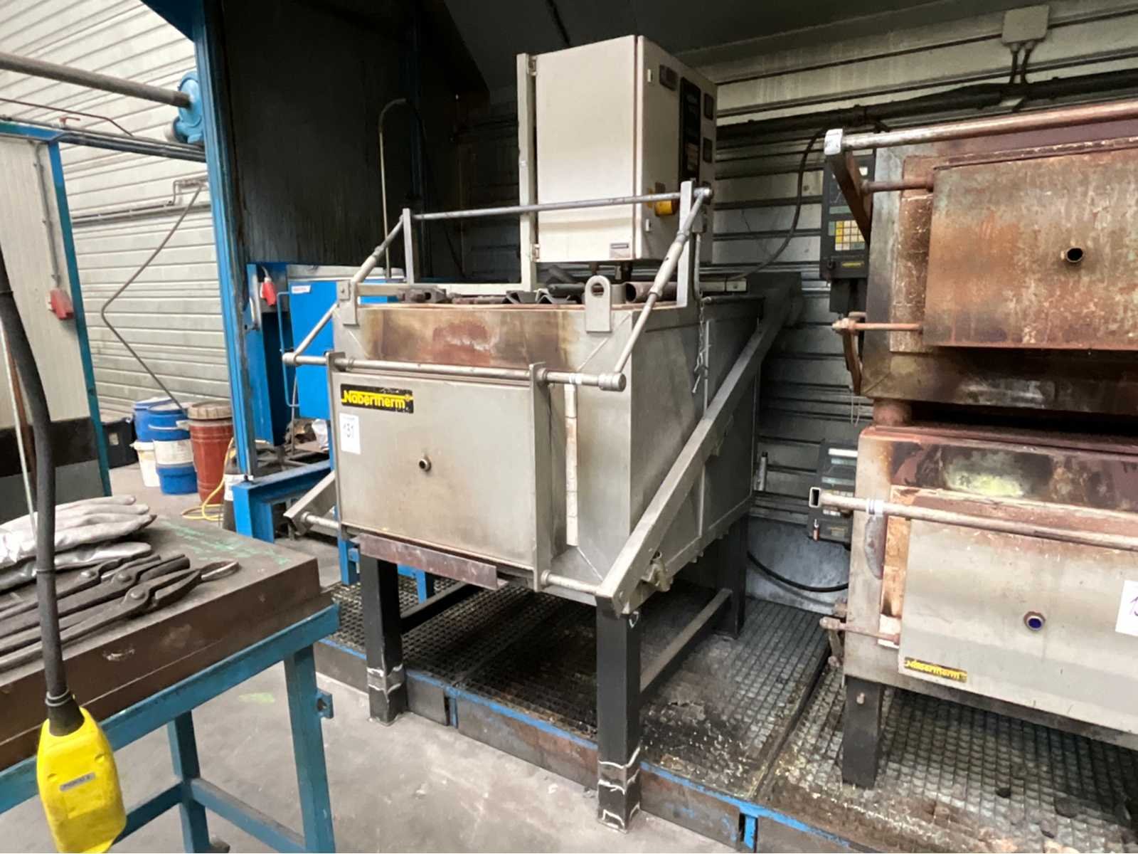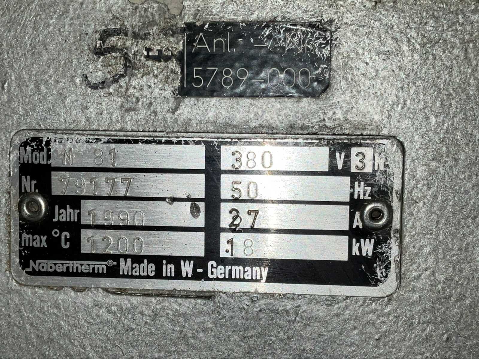 1x liftbare frontdeur; inclusief diverse hulpstukken op de oven; voorzien van elektro sturingskast tiptoets bediening; inclusief materiaalwagen voorzien van zware staalplaat afmeting circa 855x525x140 mm; totaal,afmeting van de materiaalwagen circa 1050x600x1000 mm; Merk: Nabertherm Type: N81 Bouwjaar: 1990 Serienummer: 79177 Kamer afmeting l: 500mm Kamer afmeting b: 850mm Kamer afmeting h: 250mm Temperatuurbereik max.: 1200°c Aansluiting: 400V Totale afmeting L: 1200mm Totale afmeting Breedte: 1700mm Totale afmeting Hoogte: 2100mm