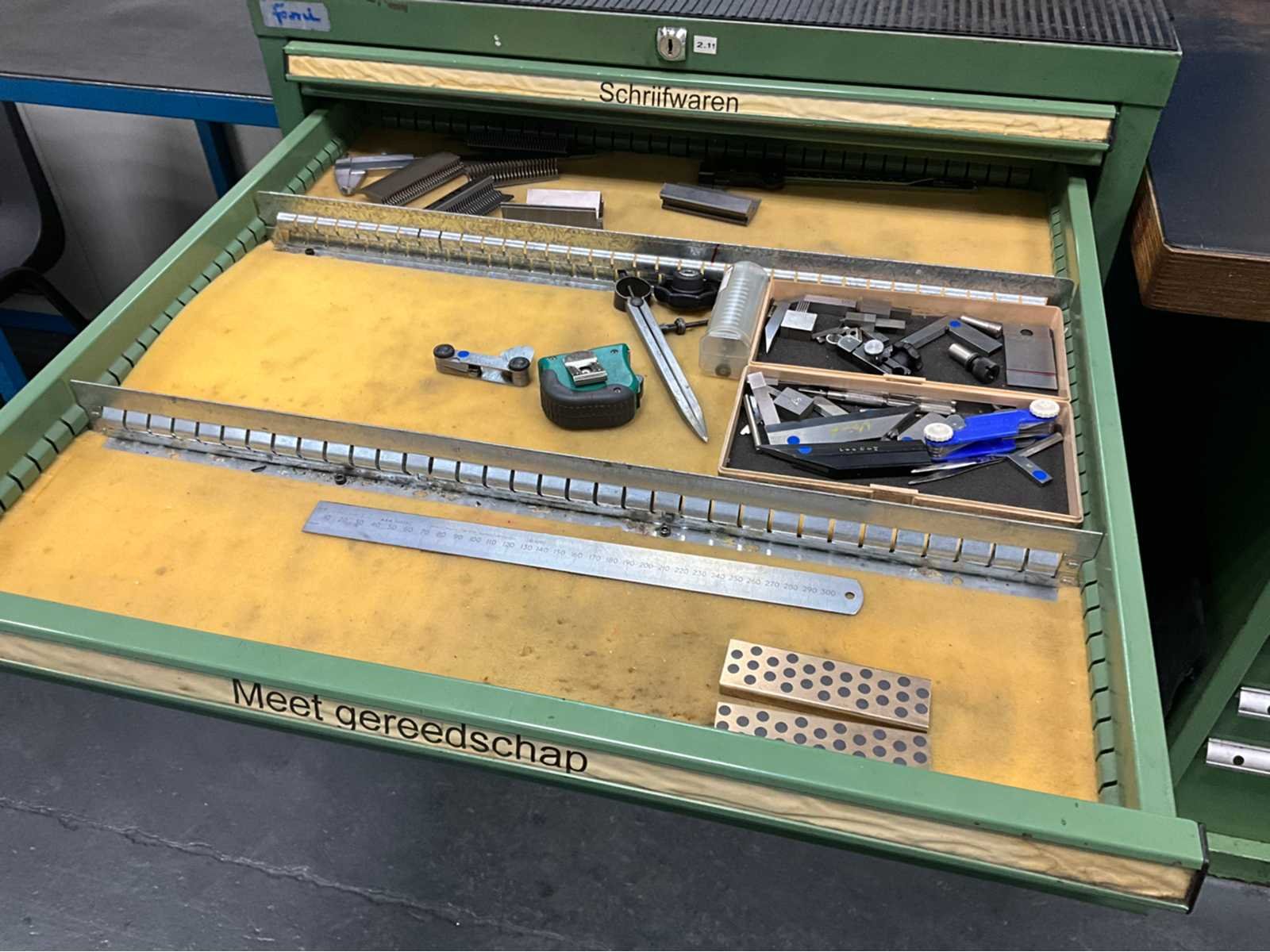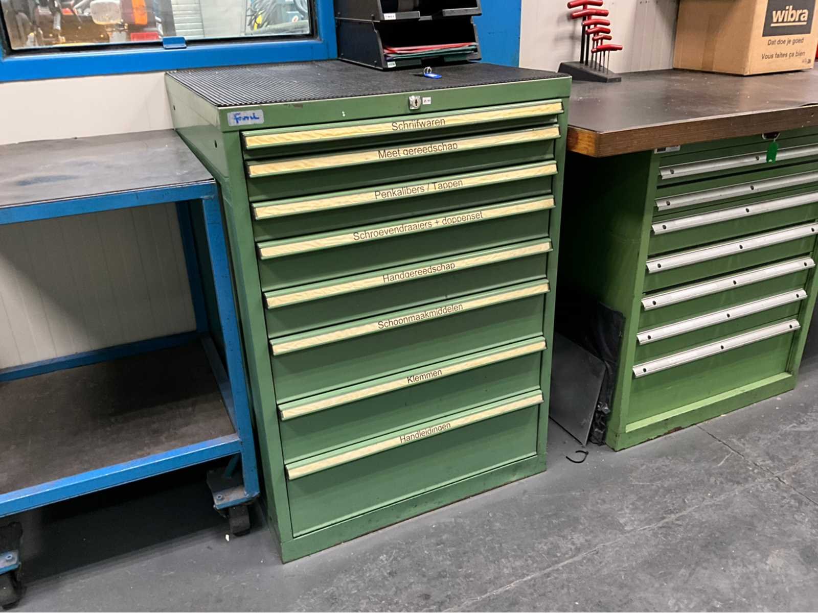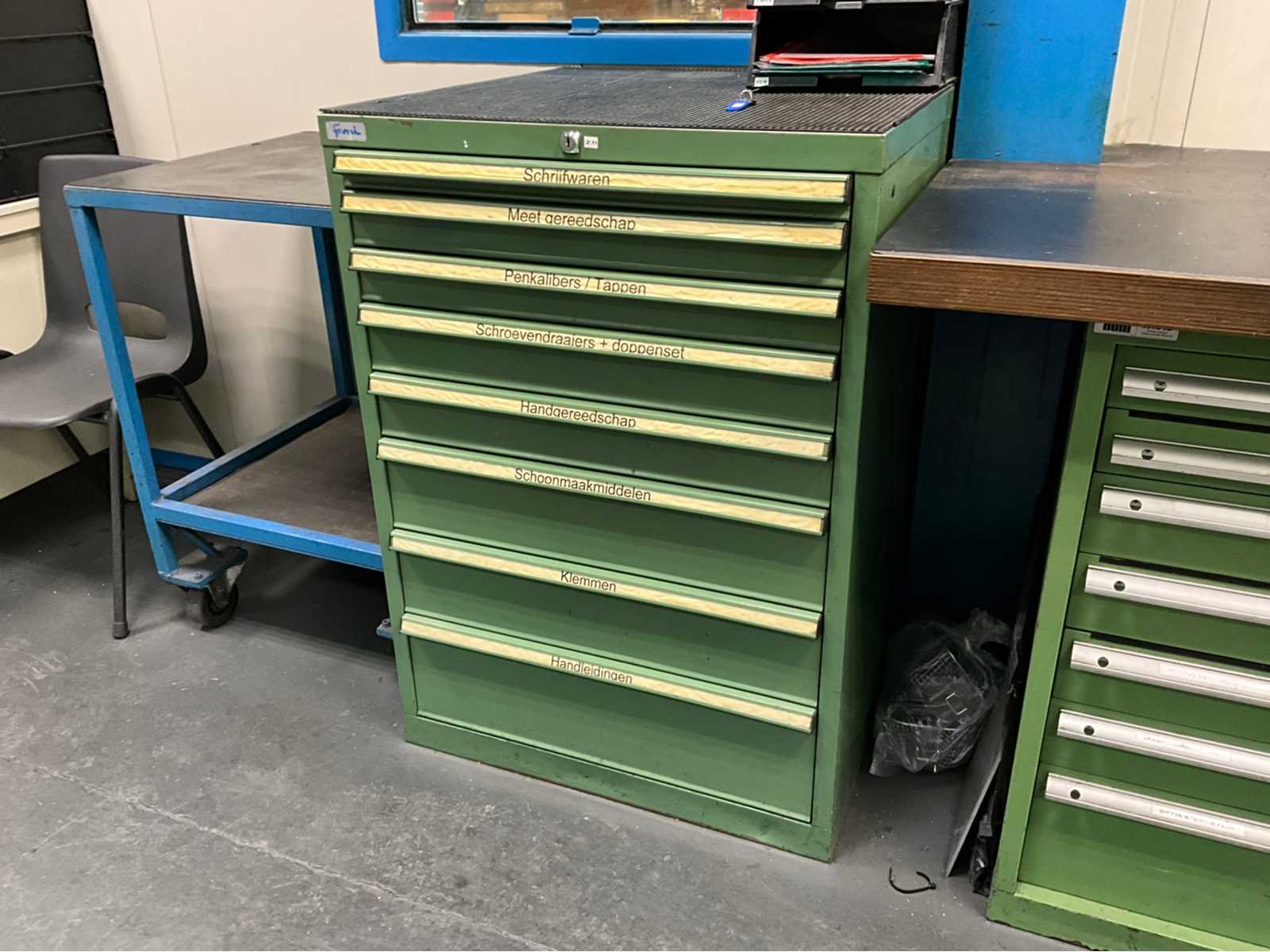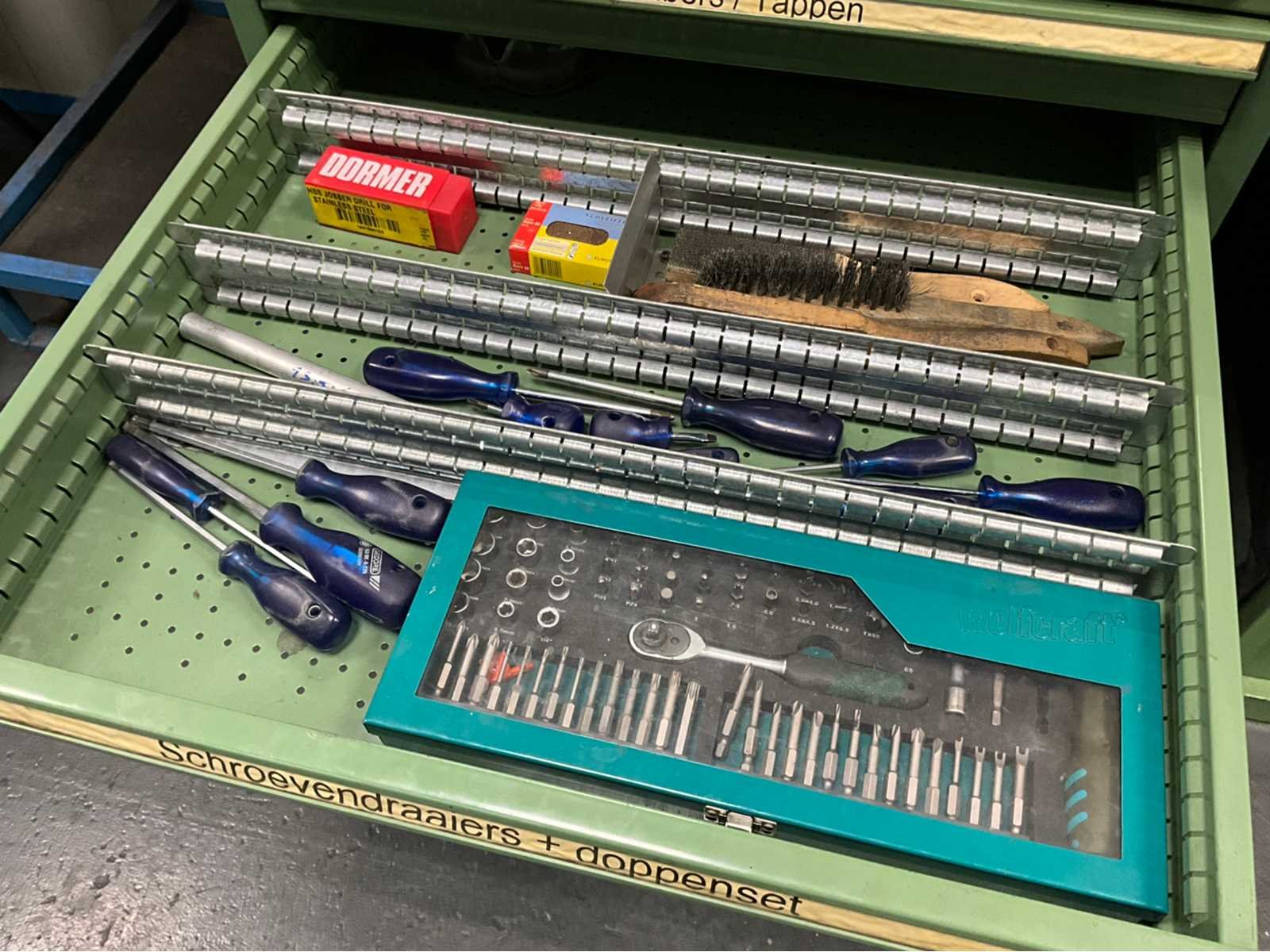 Voorzien van 8 lafen; Inclusief inhoud waaronder boren; handgereedschappen; Totale afmeting L: 720mm Totale afmeting Breedte: 720mm Totale afmeting Hoogte: 1000mm