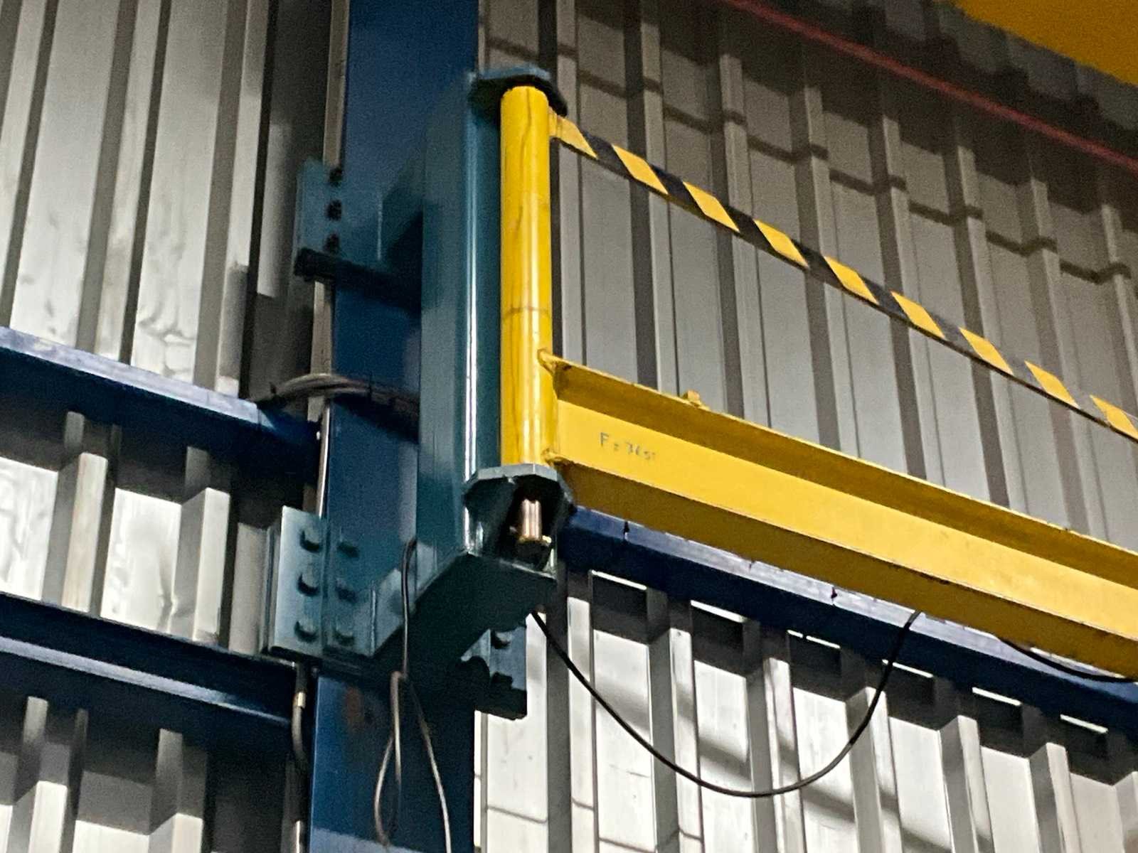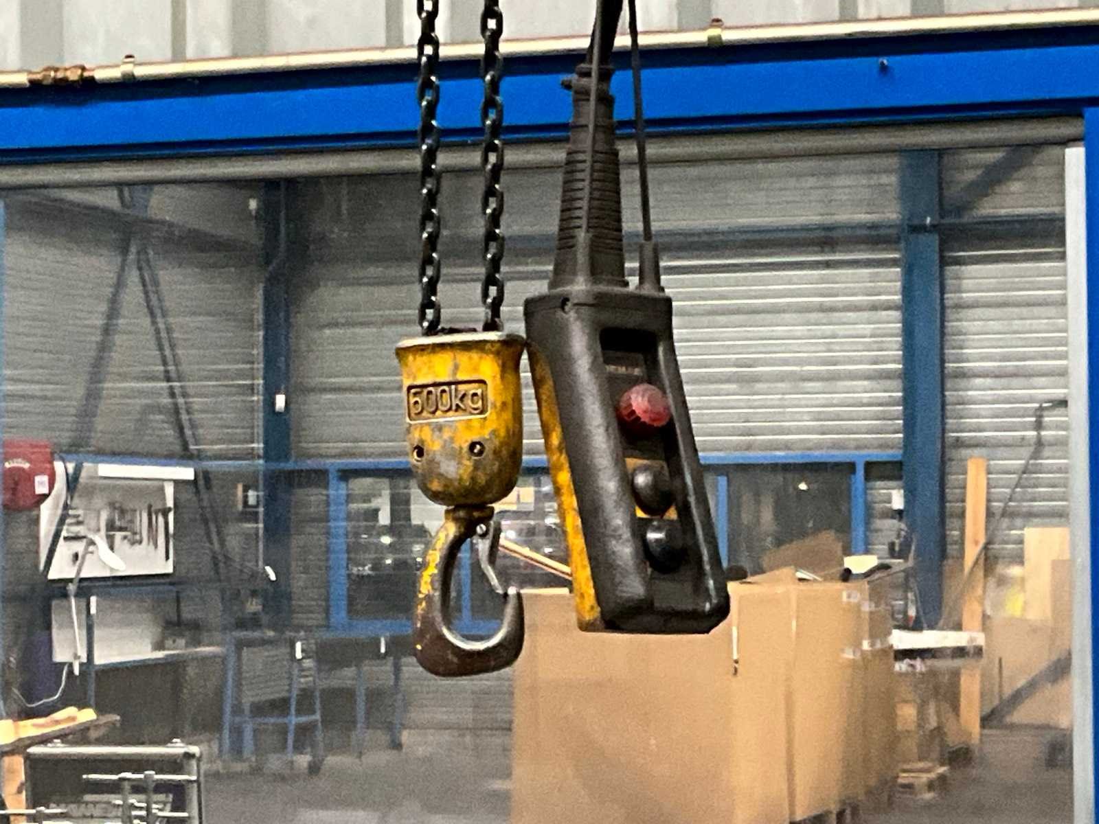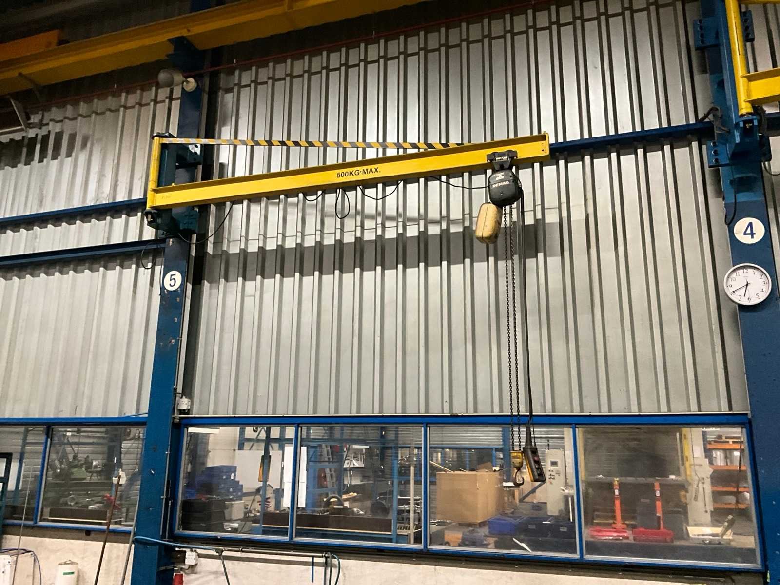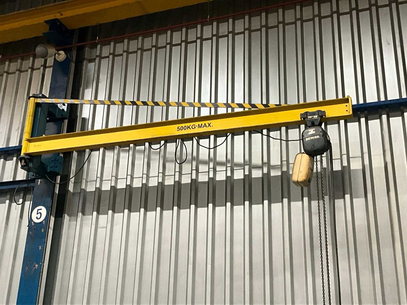 Wand gemonteerd; montagehoogte circa 4500 mm; voorzien van Demag elektrische kettingtakel; draadbediend; geschroefde wandbevestiging; Hijsvermogen: 500kg Armlengte: 5000mm Aansluiting: 400V