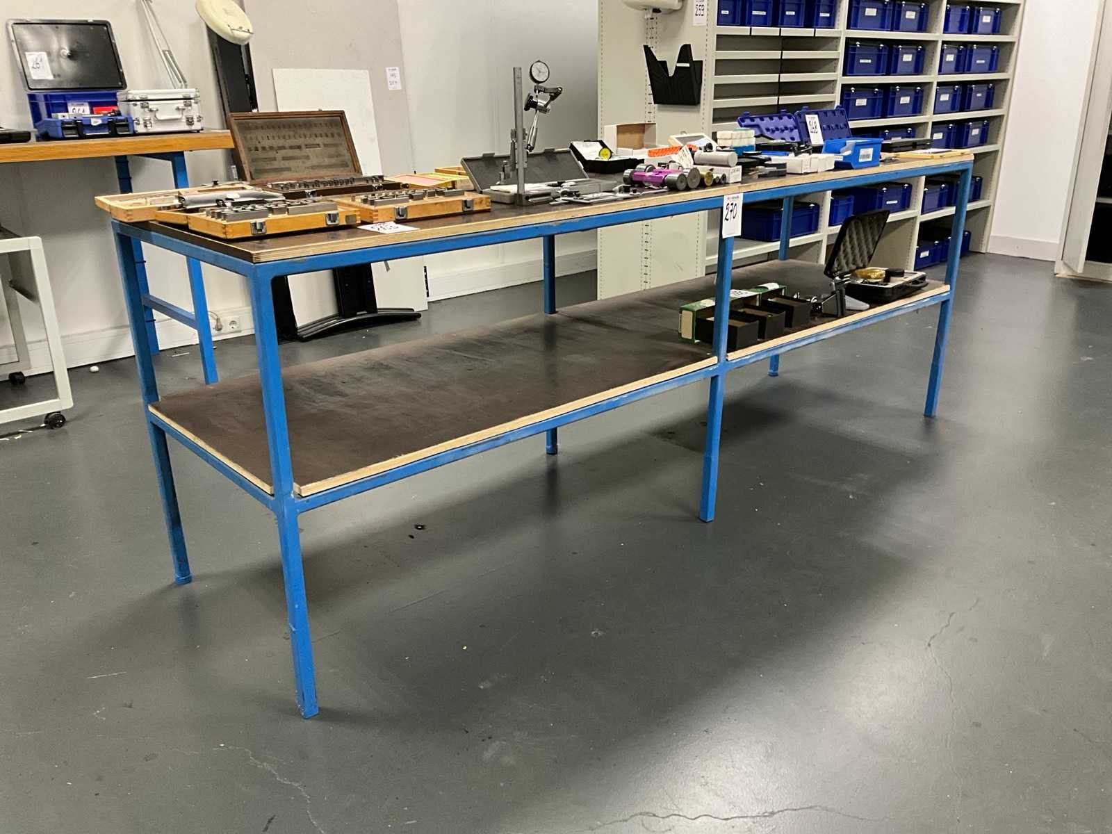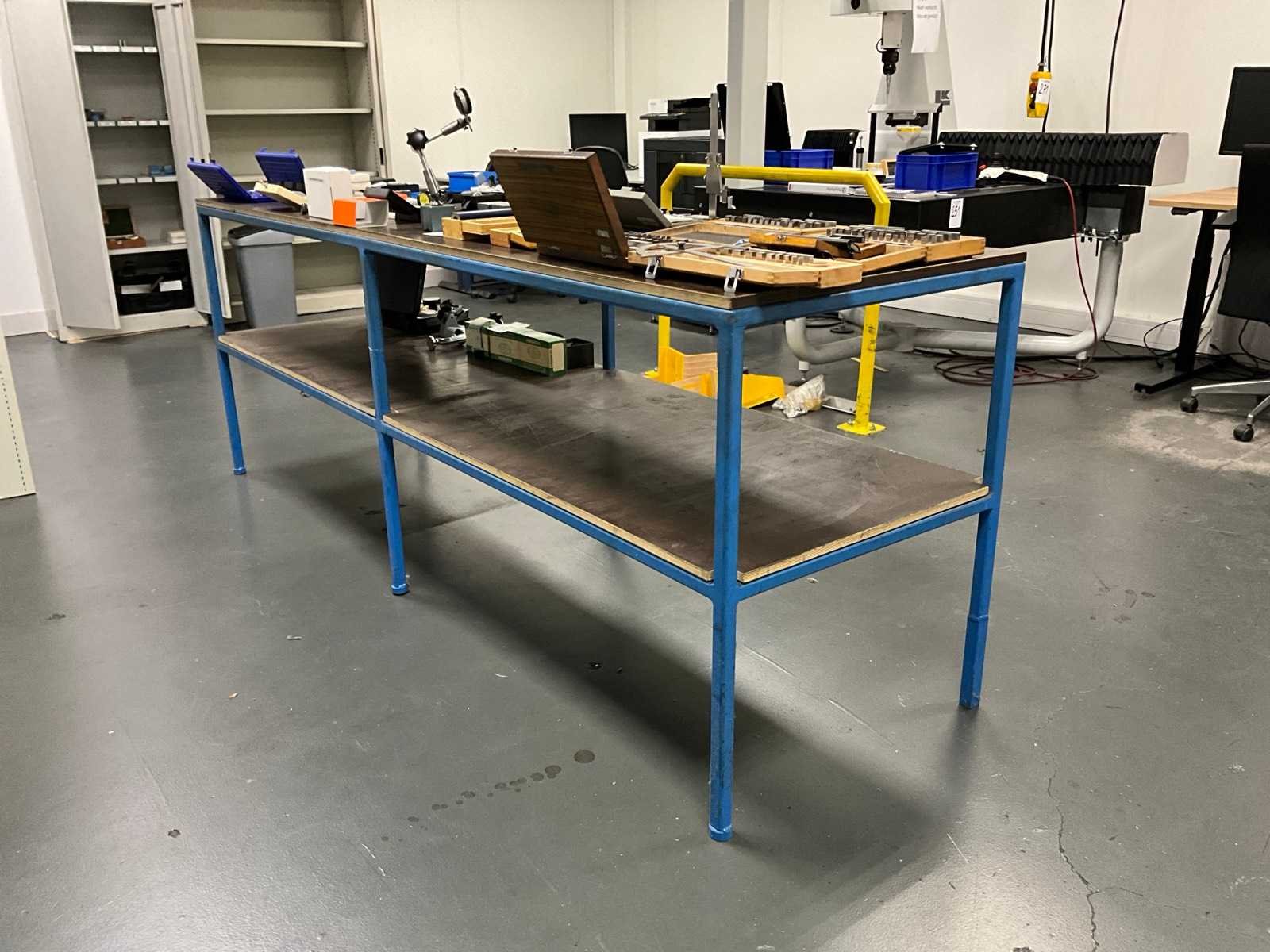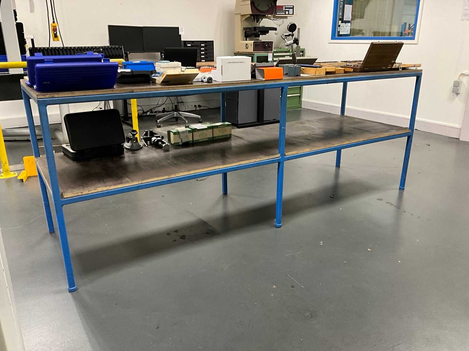 Profielstaal; geconstrueerd; voorzien van betonplex boven- en onderblad; totale afmeting circa 2530x720x940 mm; zonder artikelen op en onder de tafel;