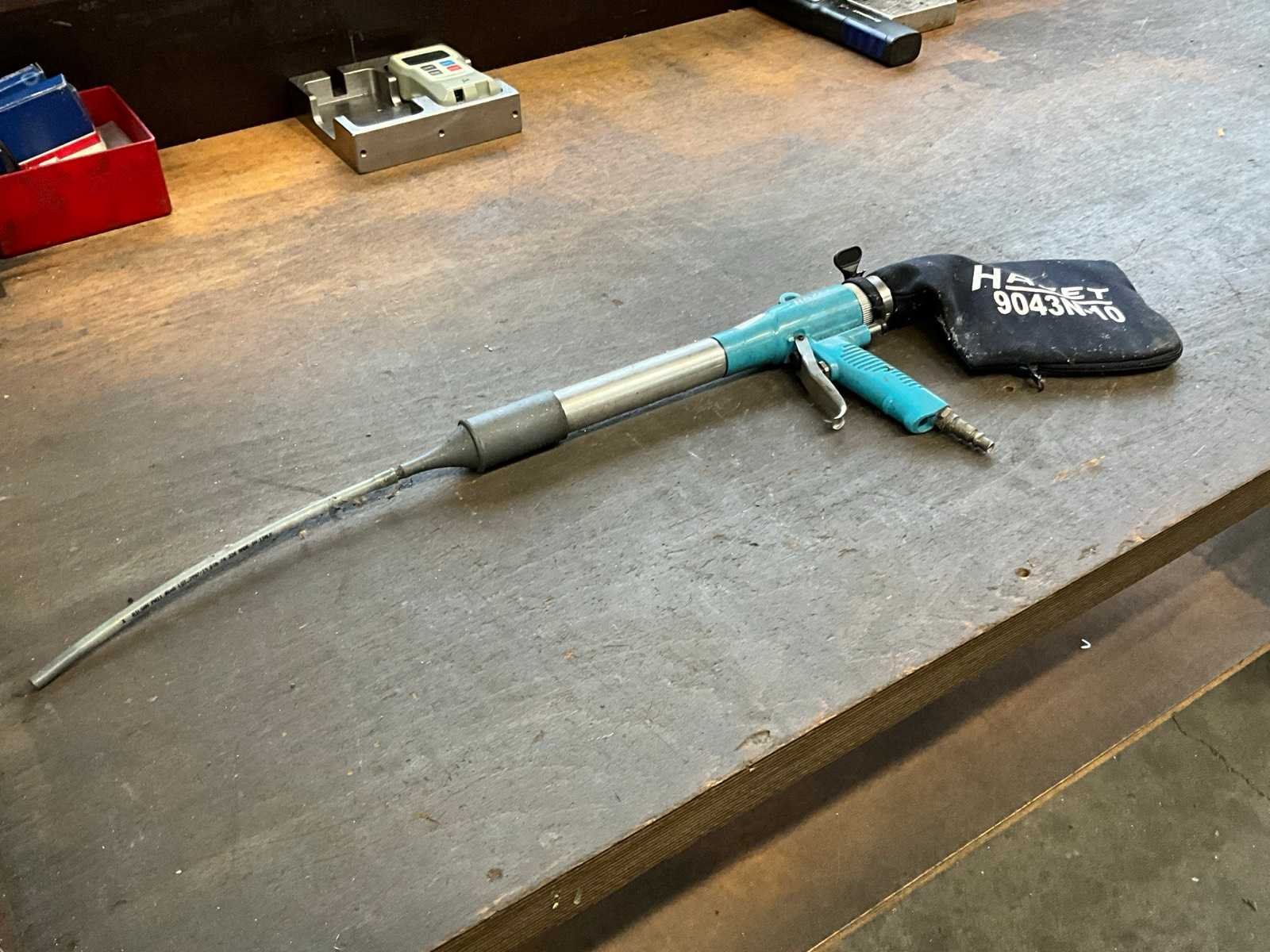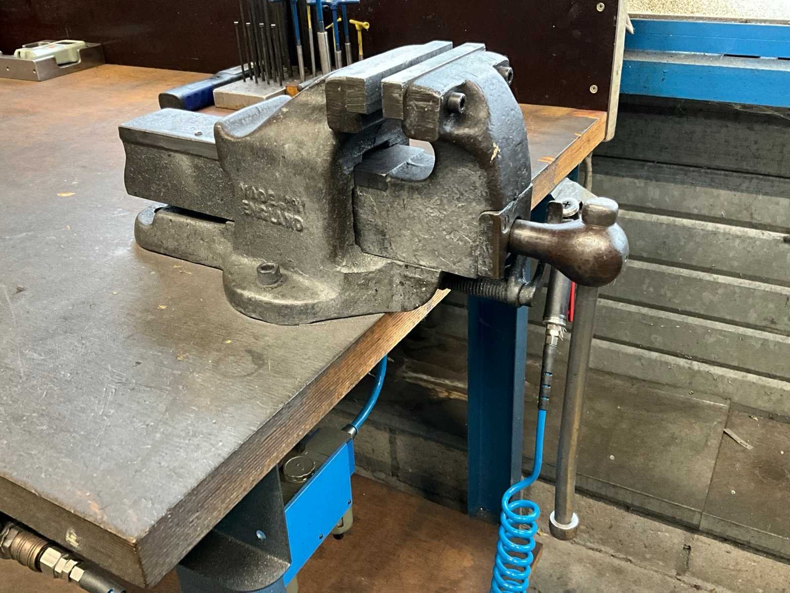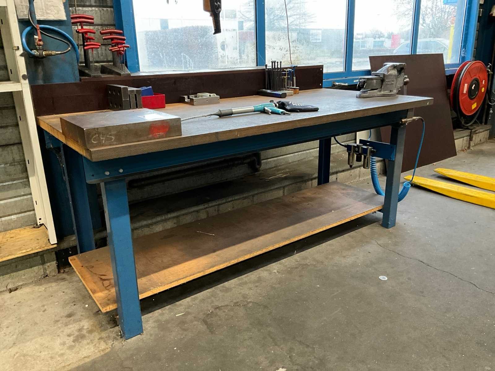 Profielstaal onderstel; zwaar multiplex werkblad; hout onderblad; voorzien van bankschroef bekbreedte 125 mm; inclusief diverse waaronder inbus schroevendraaier sets; zuig- blaaspistool; totaal afmeting 2200x1100 mm; werkblad hoogte 850 mm;