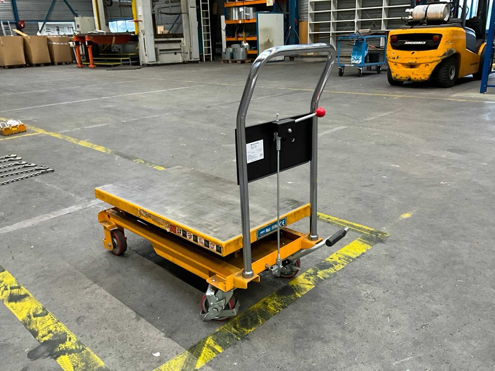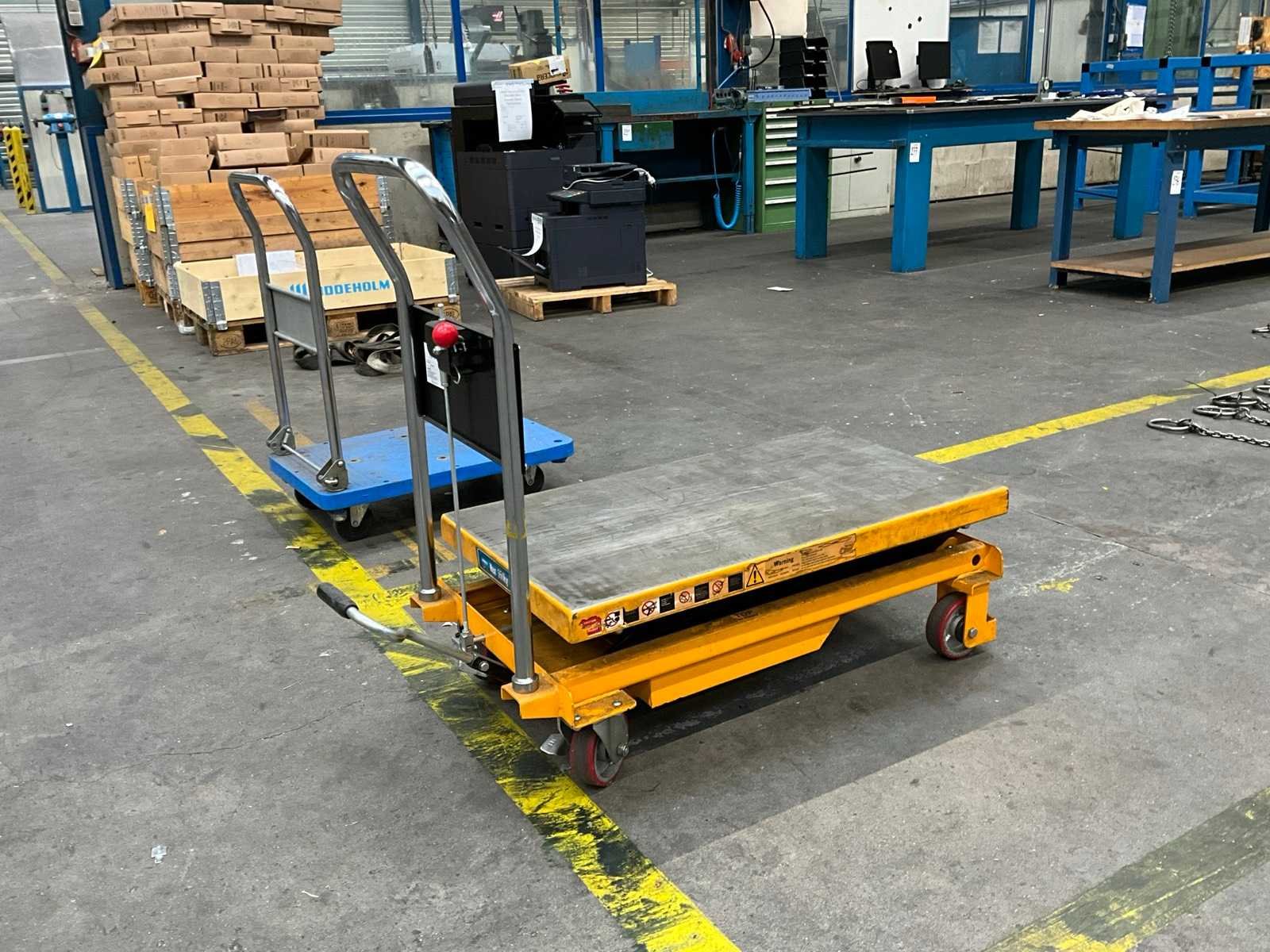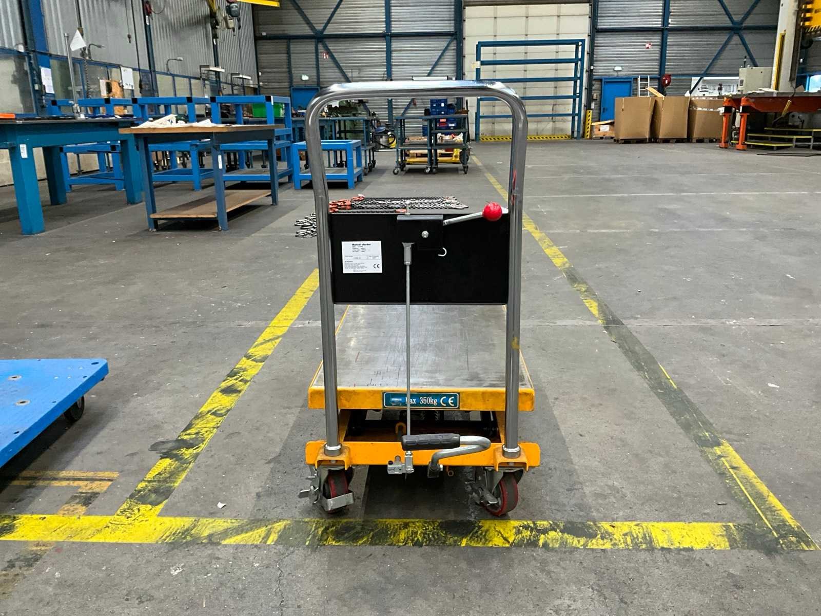 Voet hydraulisch bediend; hefhoogte circa 340 - 1300 mm; plateau afmeting 900x500 mm; Merk: Manutan Bouwjaar: 2021 Hijsvermogen: 350kg Totale afmeting L: 1200mm Totale afmeting Breedte: 500mm Totale afmeting Hoogte: 1000mm