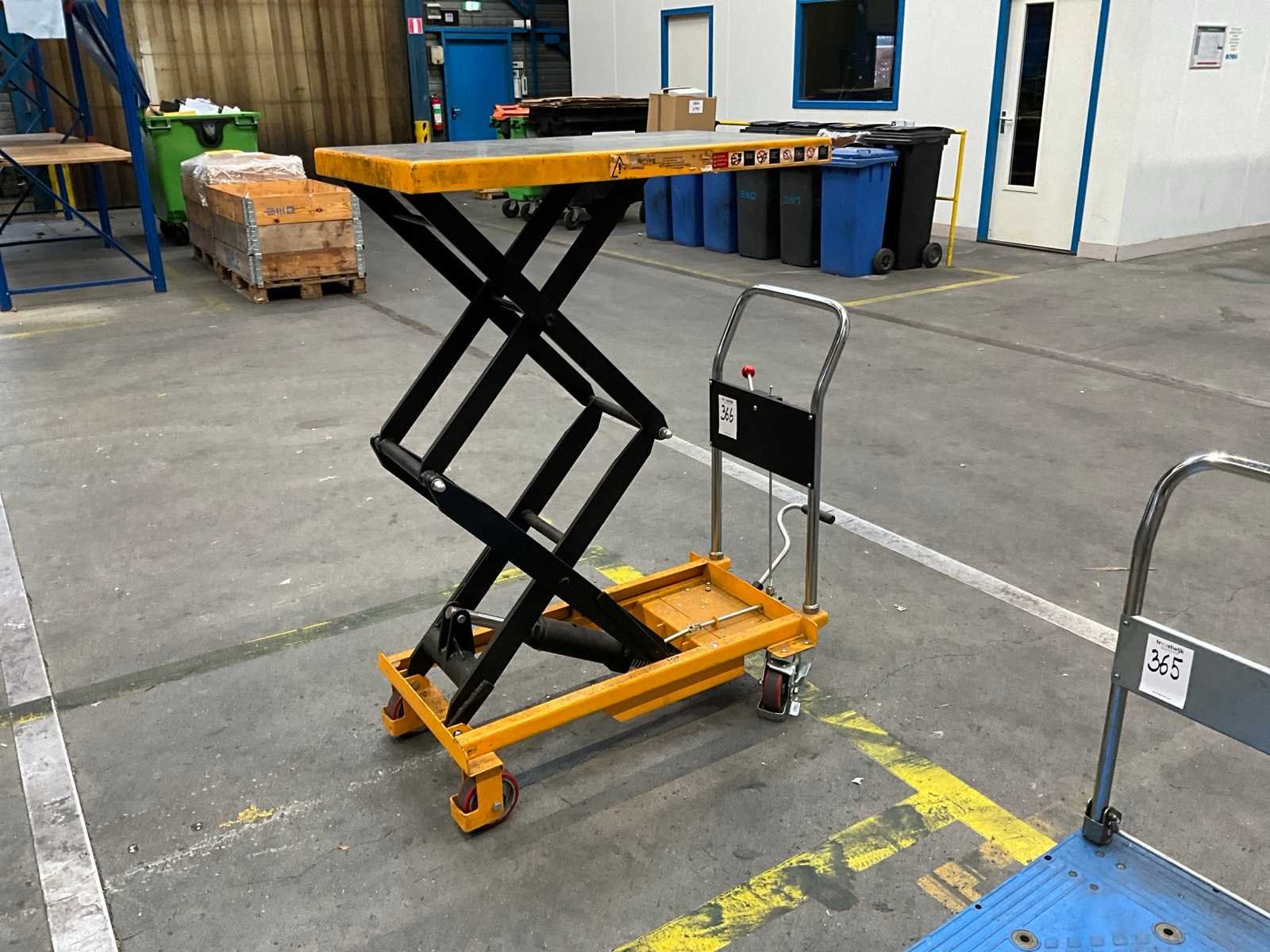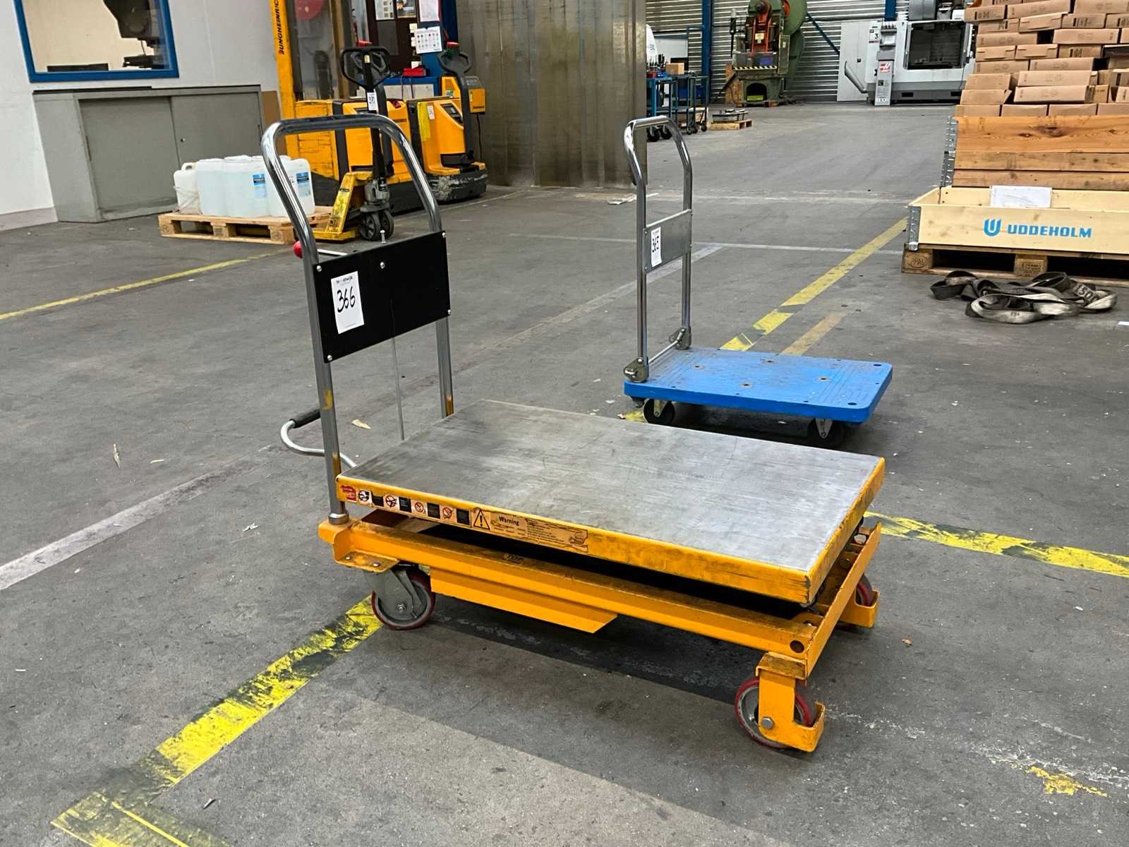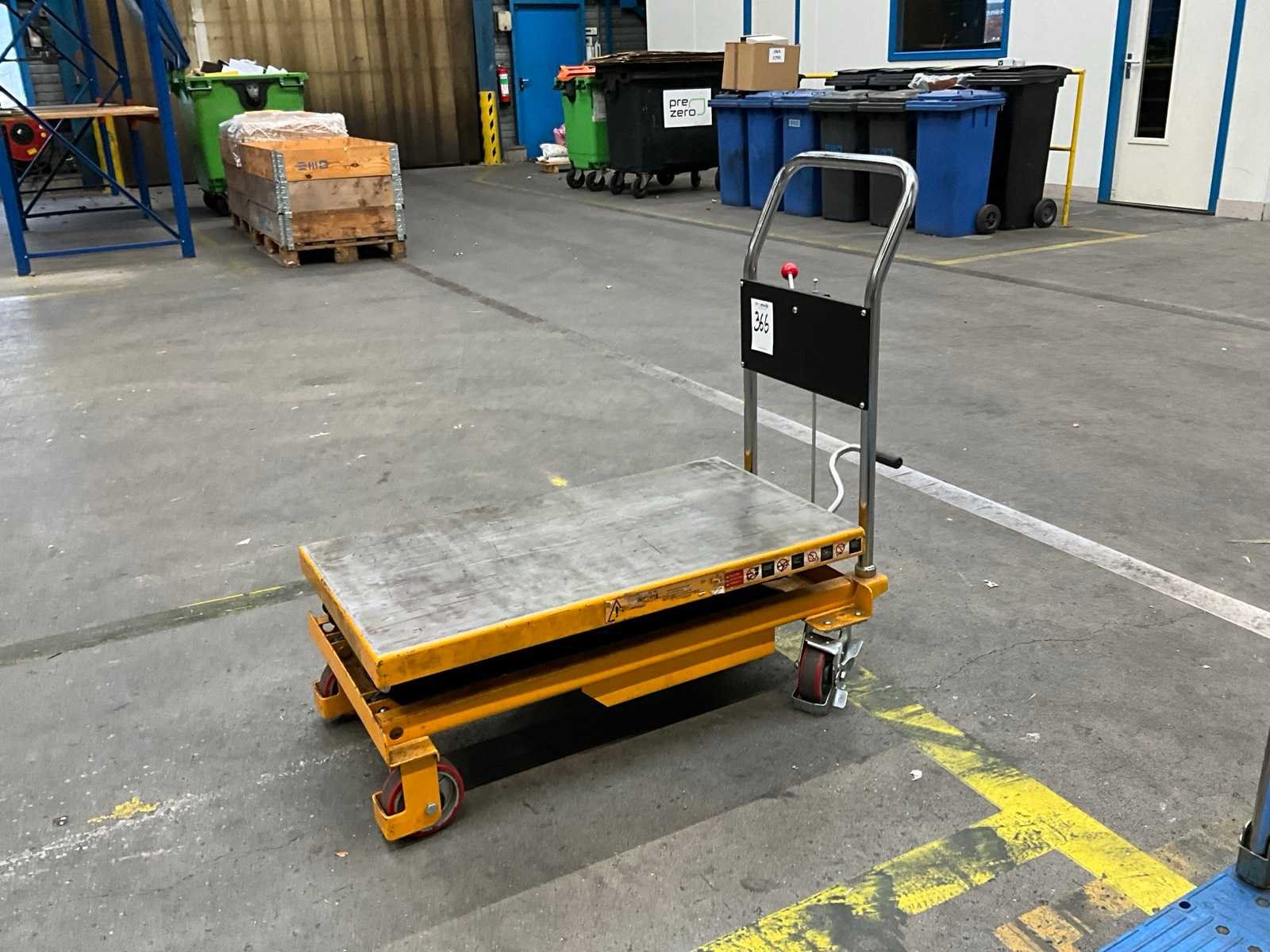 Voet hydraulisch bediend; hefhoogte circa 340 - 1300 mm; plateau afmeting 900x500 mm; Merk: Manutan Bouwjaar: 2021 Hijsvermogen: 350kg Totale afmeting L: 1200mm Totale afmeting Breedte: 500mm Totale afmeting Hoogte: 1000mm