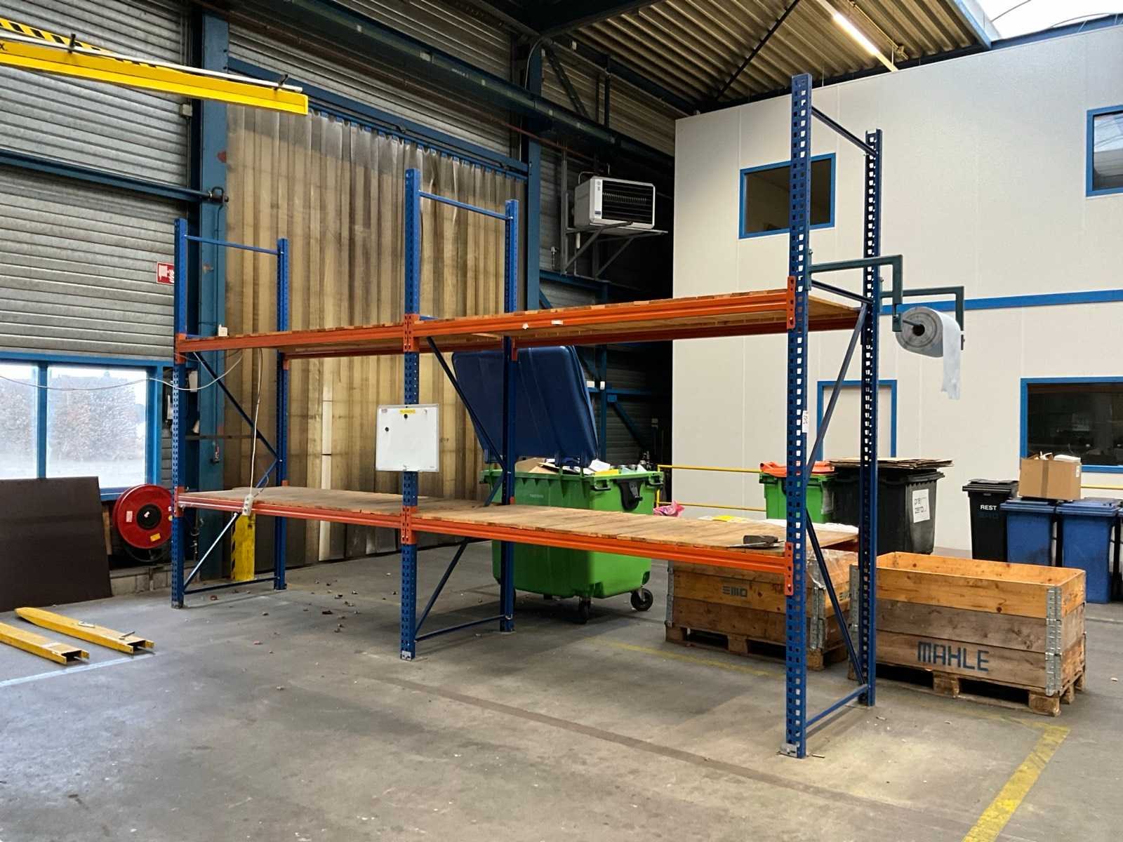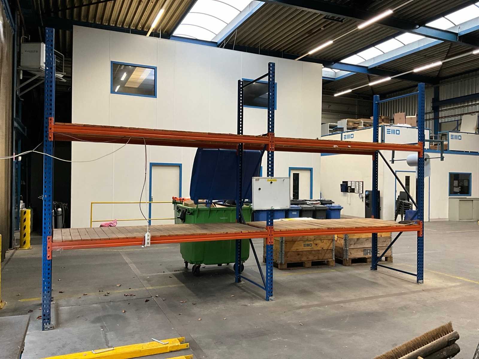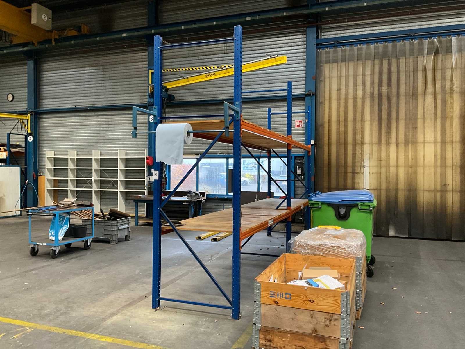 2 secties; 3x staander afmeting 1100x3300 mm; 8x liggers lengte 2700 mm; 4x houten vlonder afmeting 2700x1100 mm; inclusief papierrolhouder zonder papierrol; inclusief klein white board;