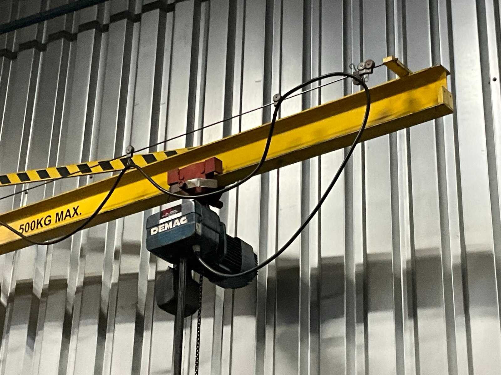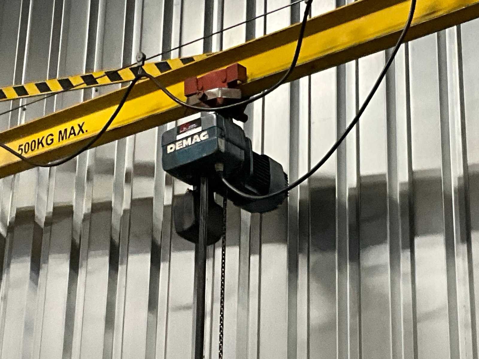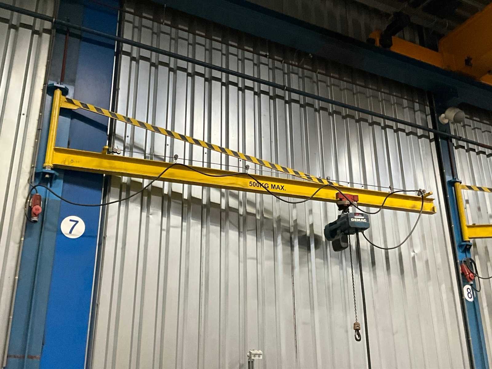 Wand gemonteerd; montagehoogte circa 4500 mm; voorzien van Demag elektrische kettingtakel; draadbediend; zonder wandbevestiging; Hijsvermogen: 500kg Armlengte: 3800mm Aansluiting: 400V