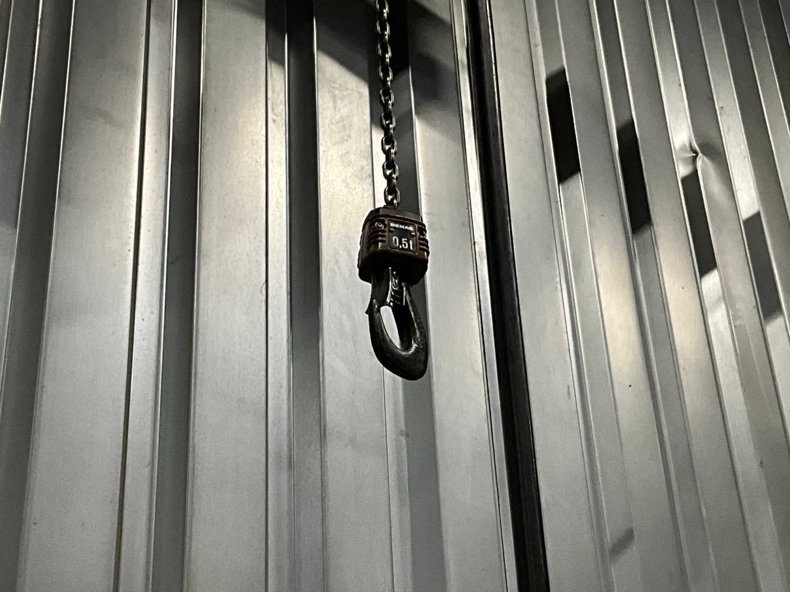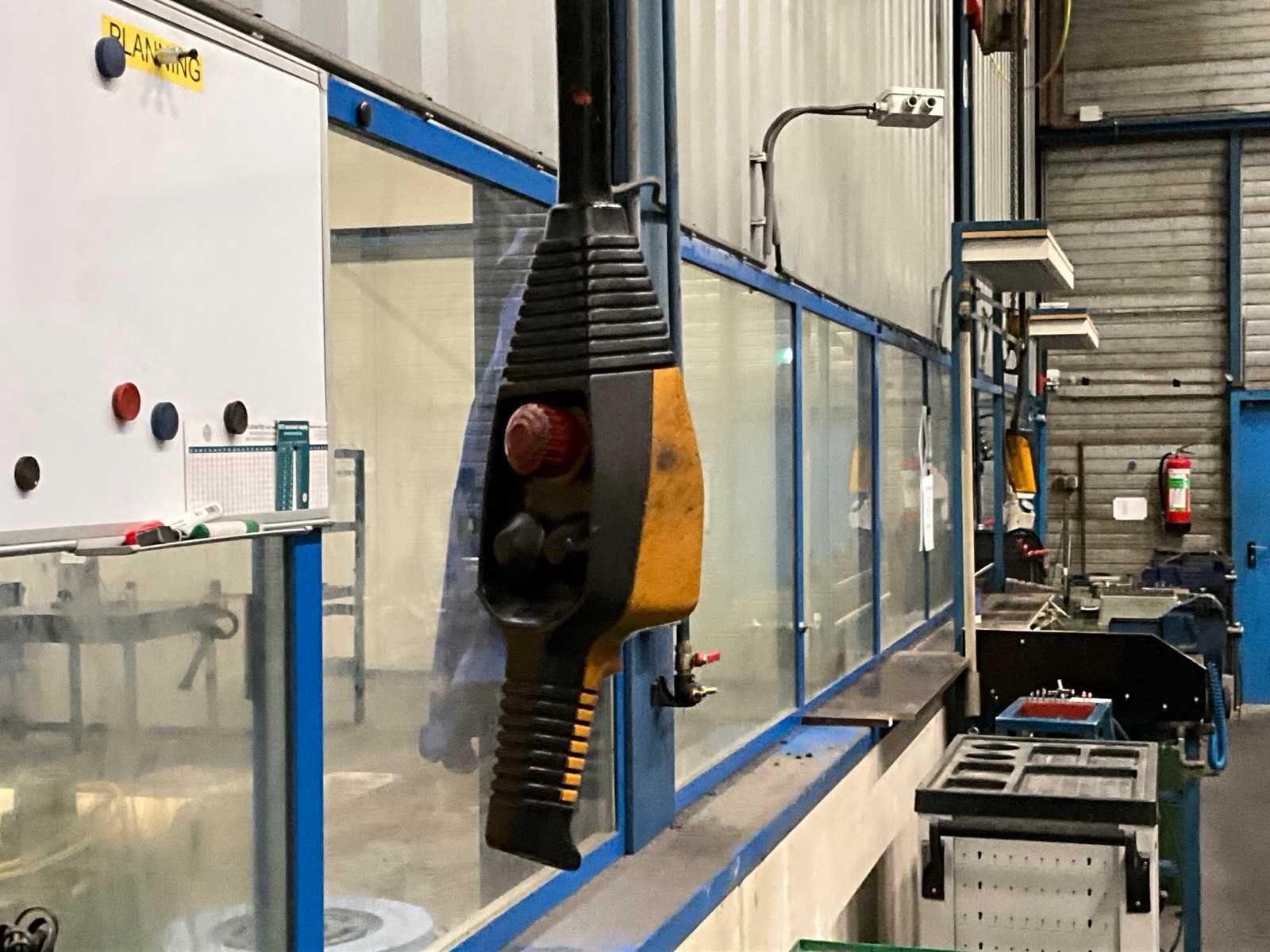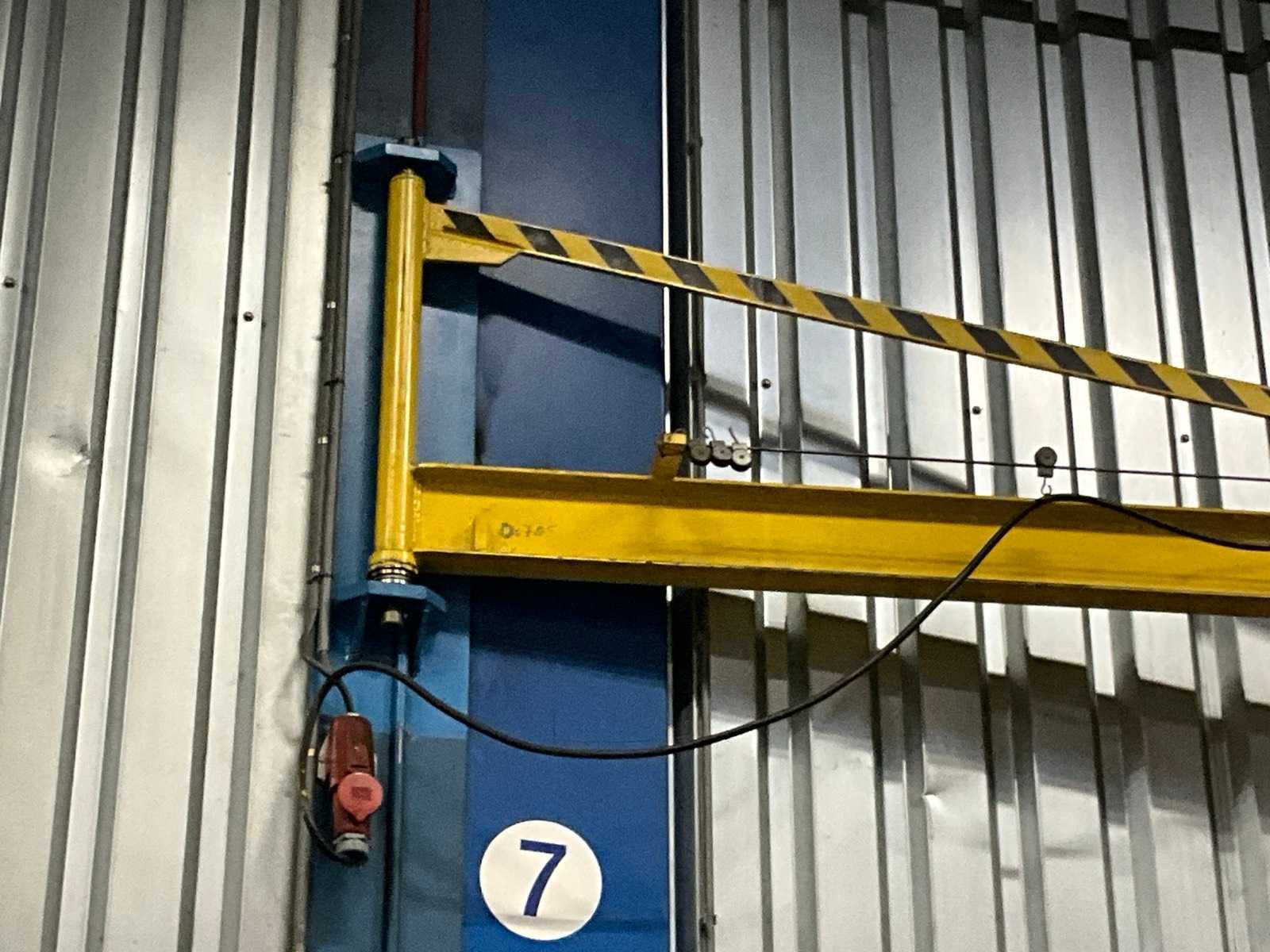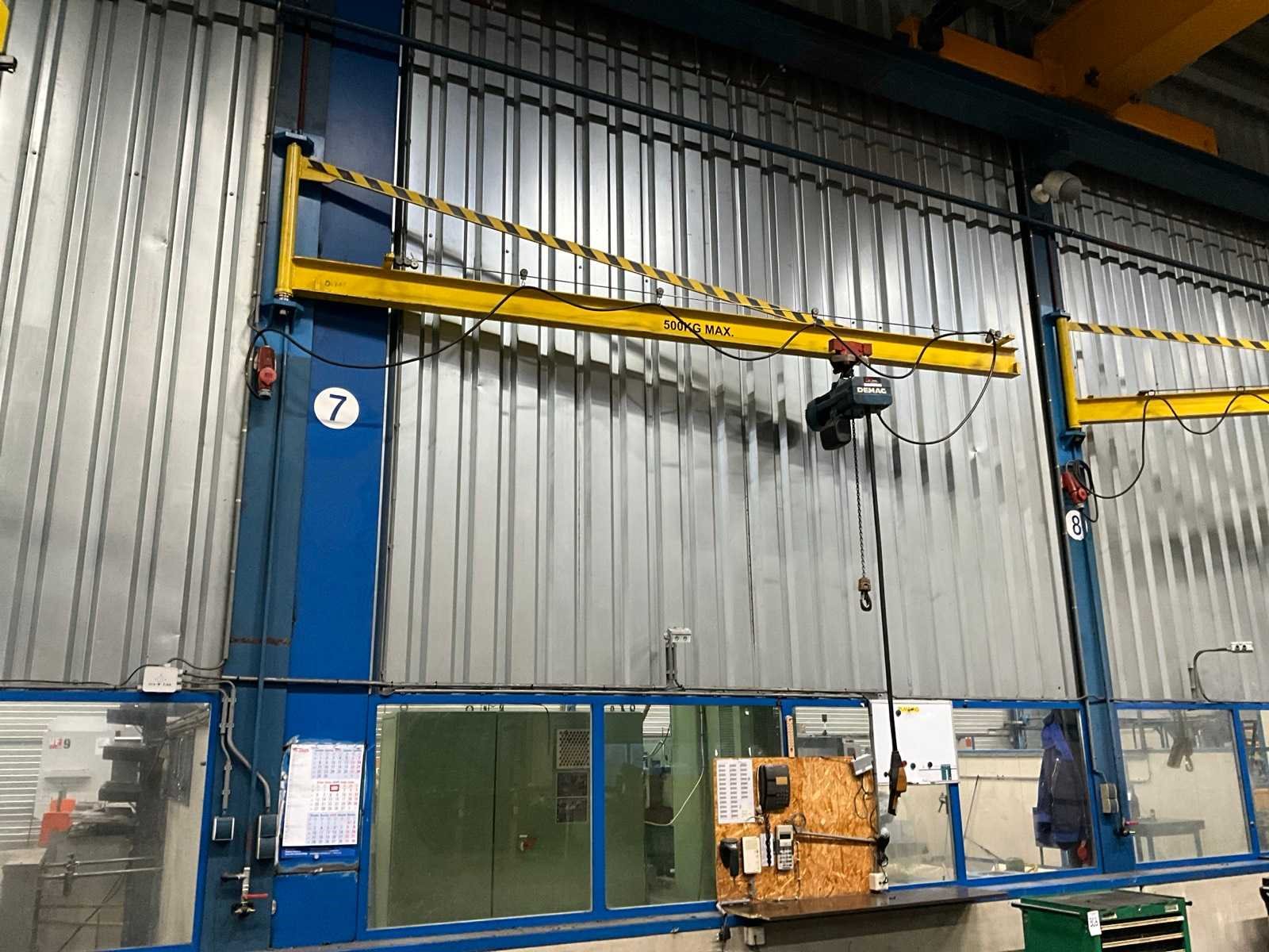 Wand gemonteerd; montagehoogte circa 4500 mm; voorzien van Demag elektrische kettingtakel; draadbediend; zonder wandbevestiging; Hijsvermogen: 500kg Armlengte: 3800mm Aansluiting: 400V