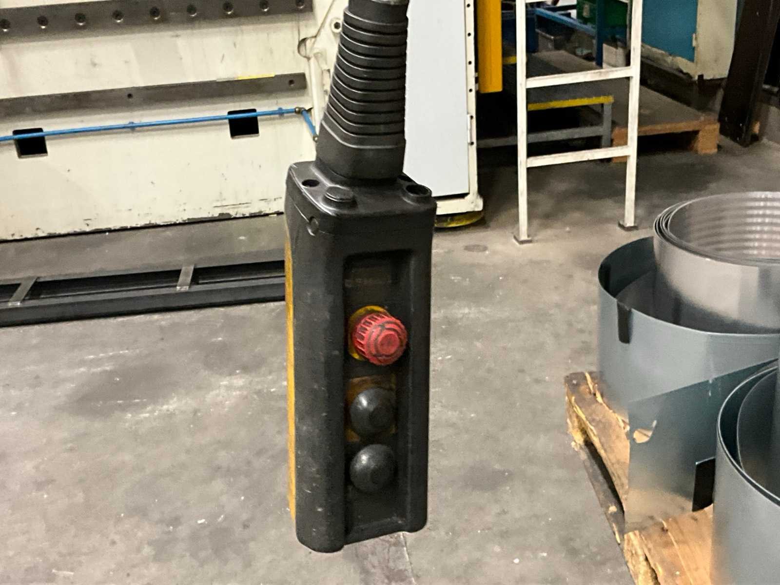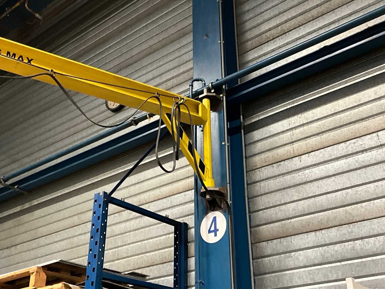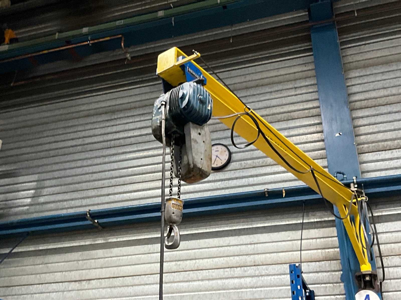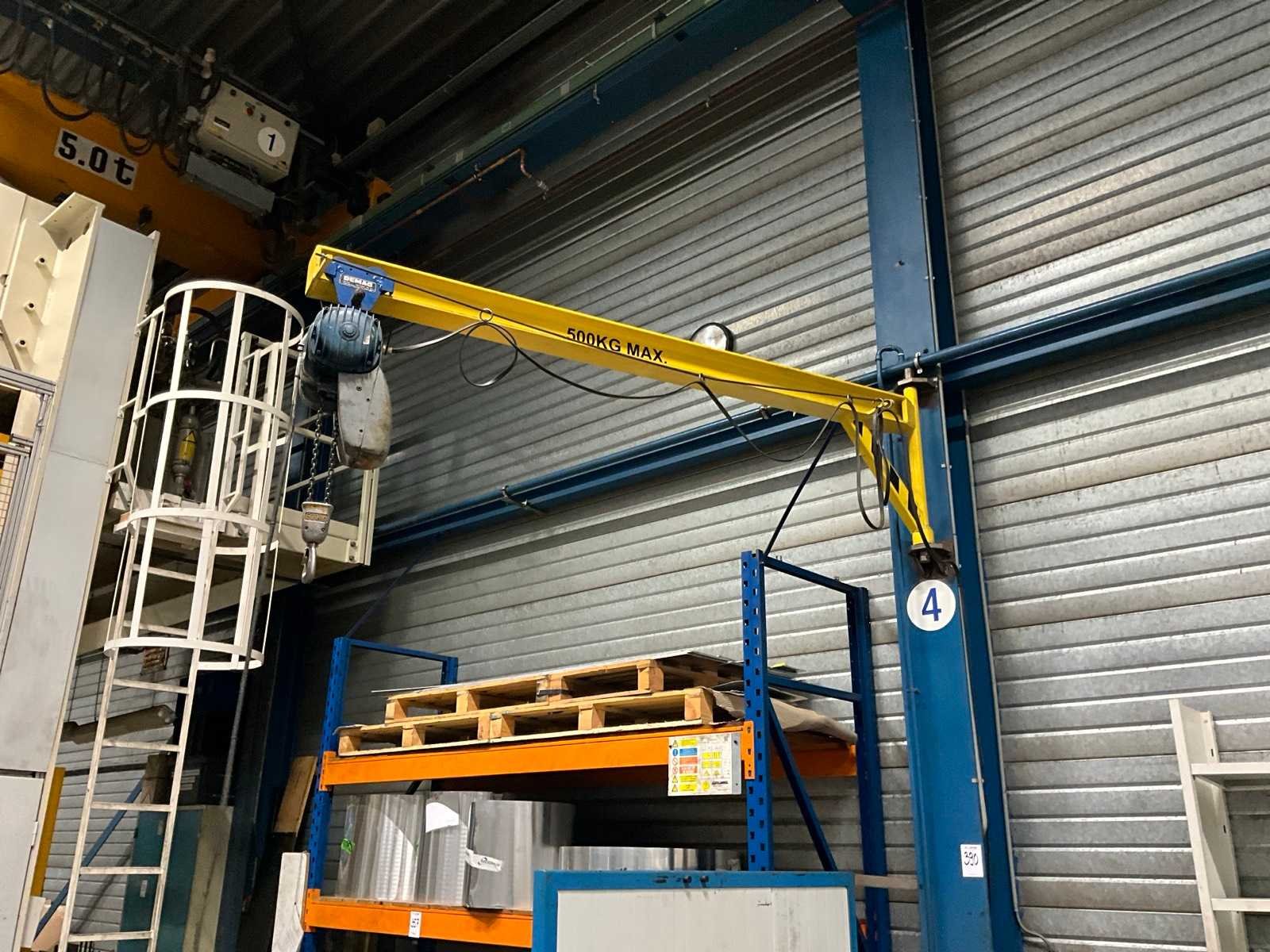 Wand gemonteerd; montagehoogte circa 4500 mm; voorzien van Demag elektrische kettingtakel; draadbediend; zonder wandbevestiging; Hijsvermogen: 500kg Armlengte: 2400mm Aansluiting: 400V