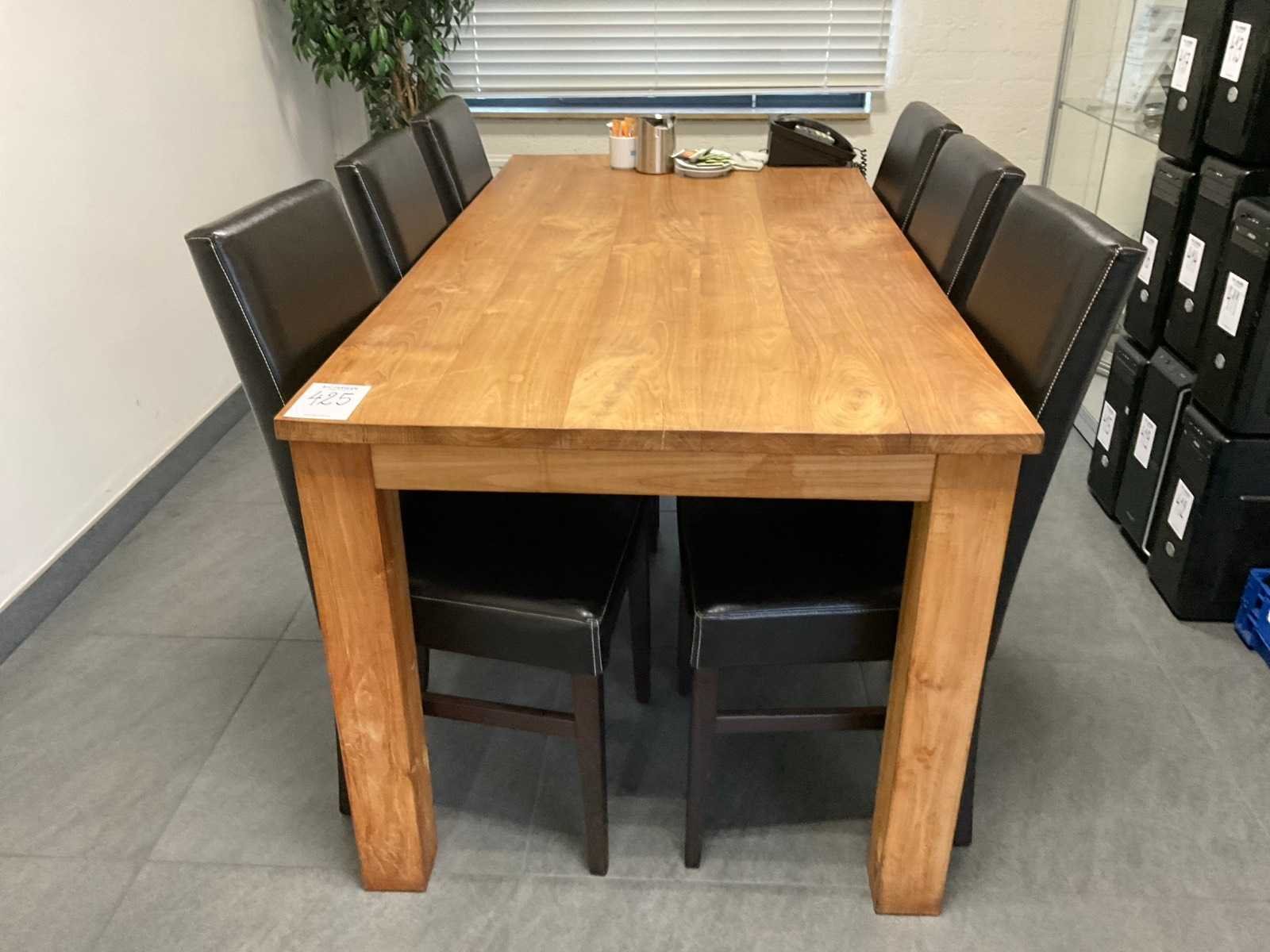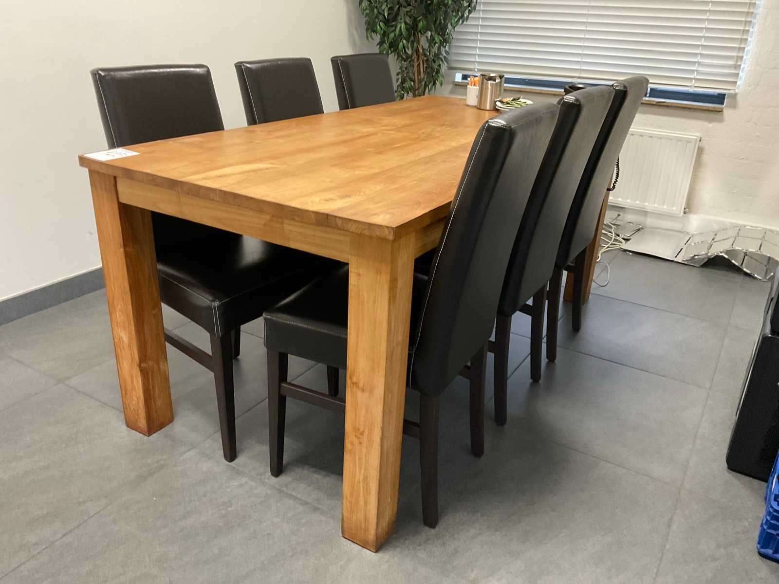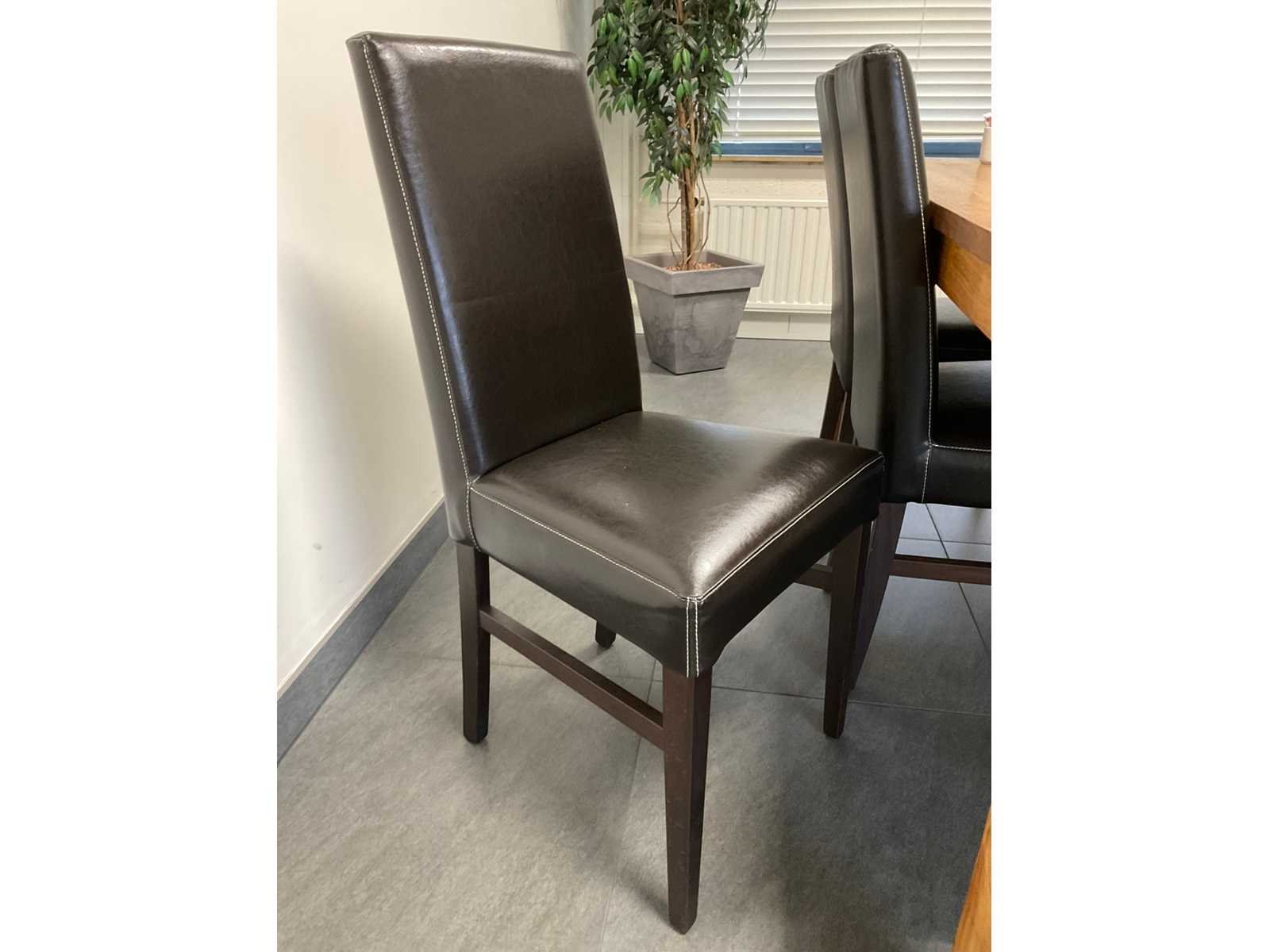 Bestaande uit: (1x) tafel 180x90cm, (6x) Eetkamerstoelen, (2x) vitrinekasten met inhoud (100x40x202cm), (1x) kunstplant