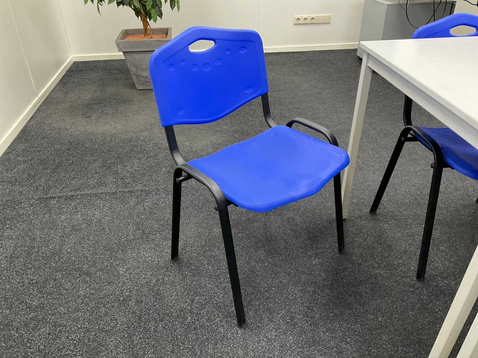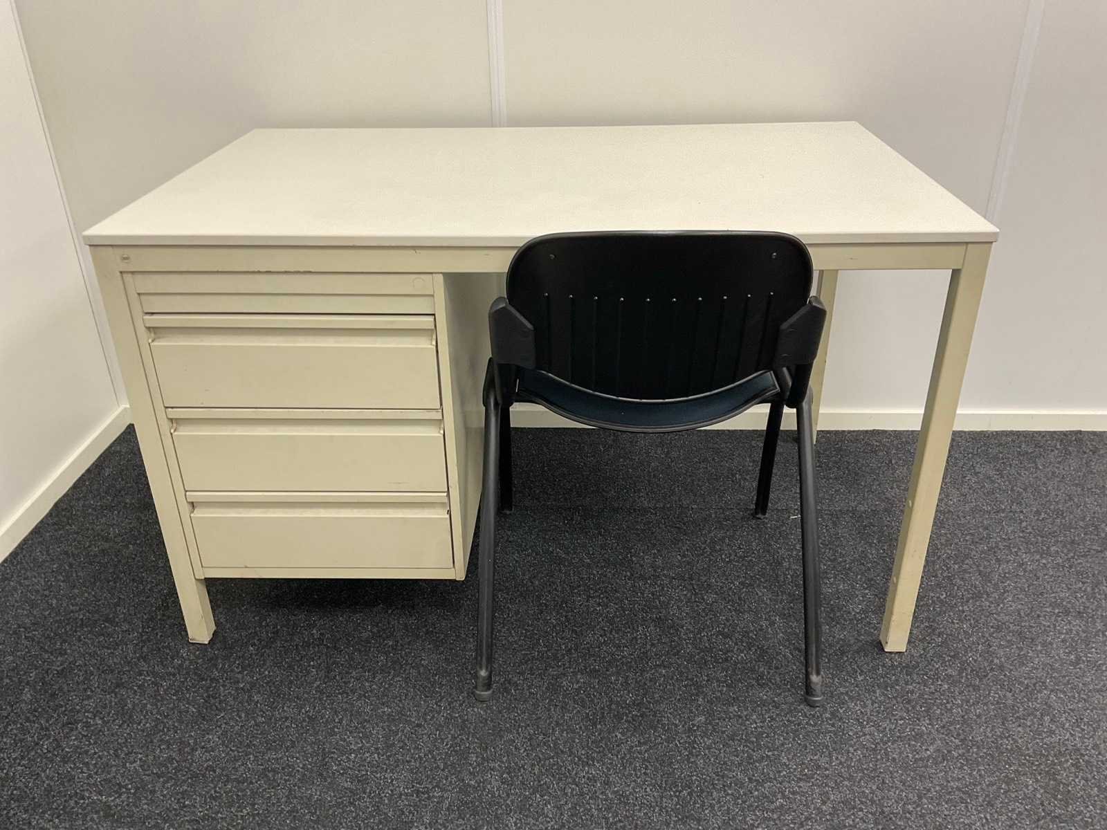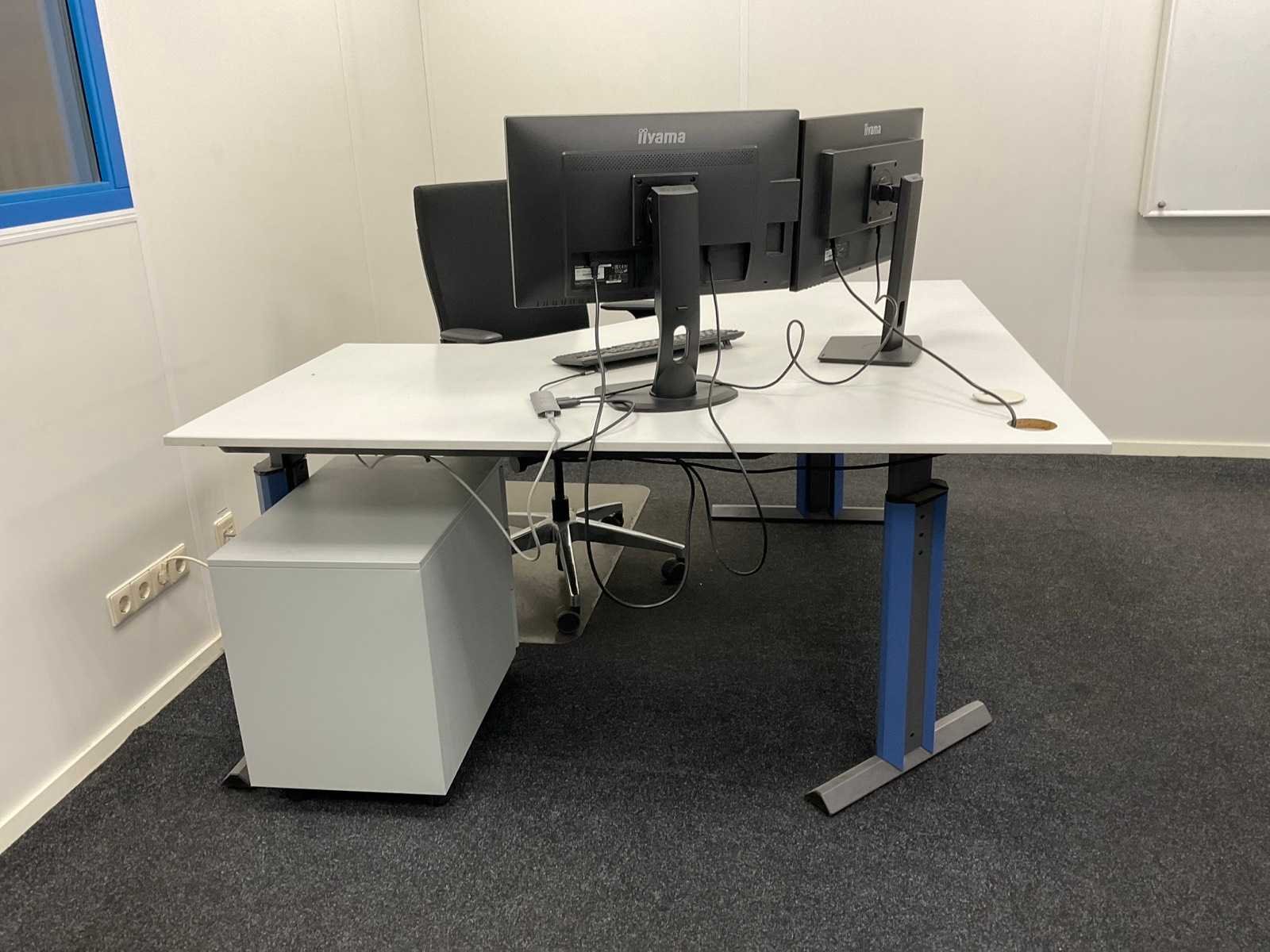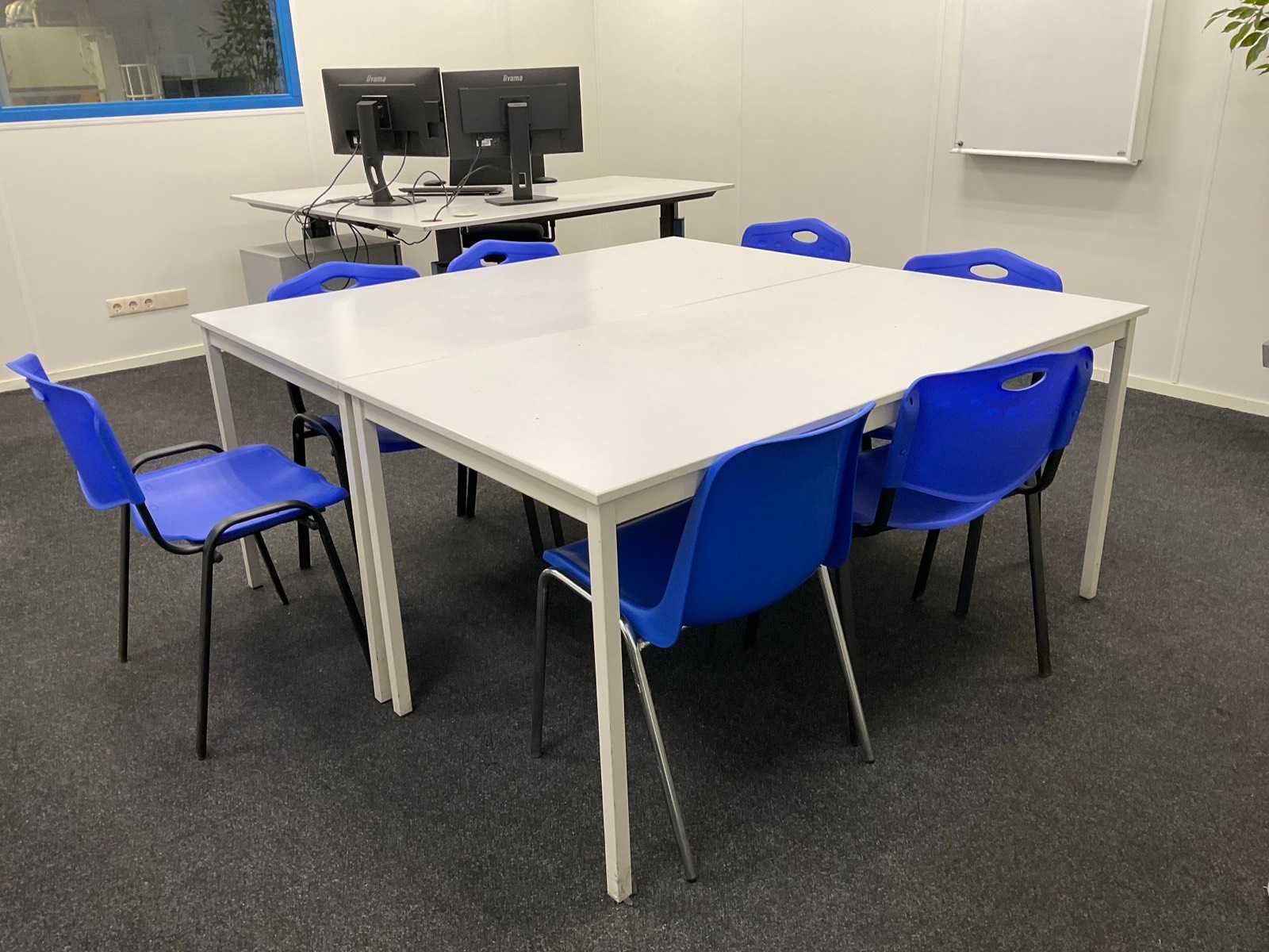 Bestaande uit: (2x) tafel 160x80cm, (1x) L-vorming bureau 160x160cm, (1x) bureautafel 125x75cm, (1x) 2-deurskast 97x40x196cm, (2x) kunstplant, (7x) stapelstoelen. Let op! 1e etage