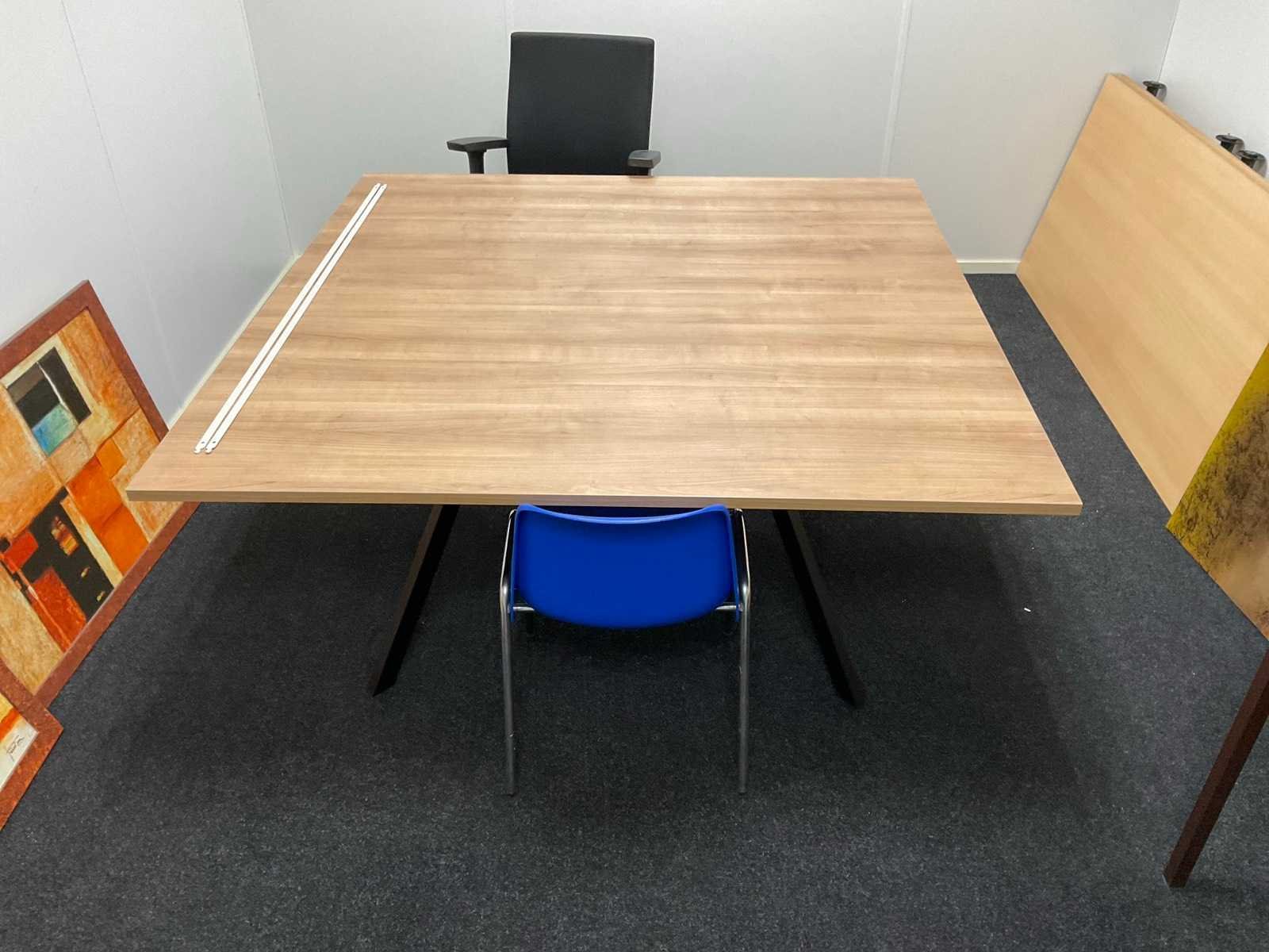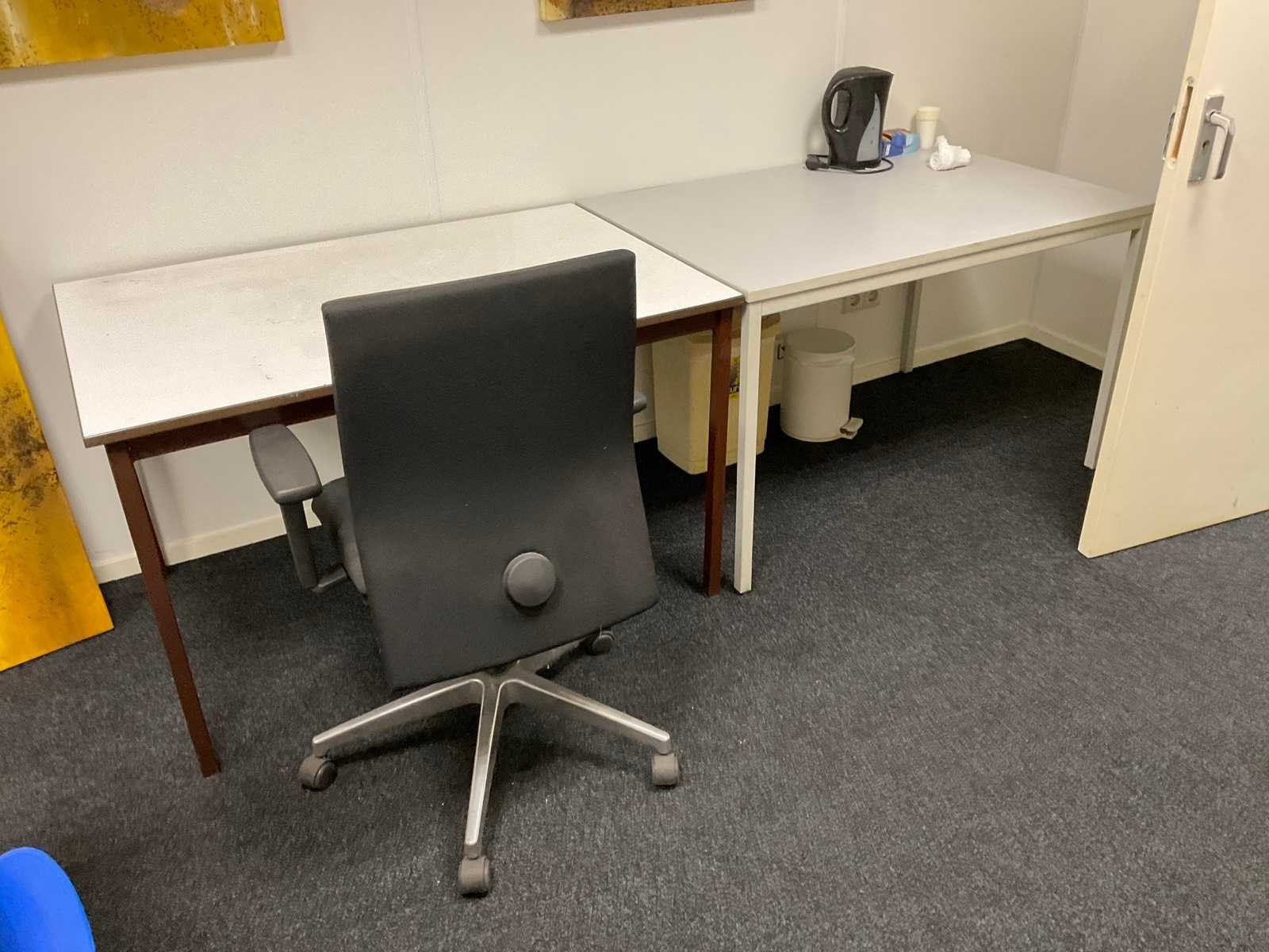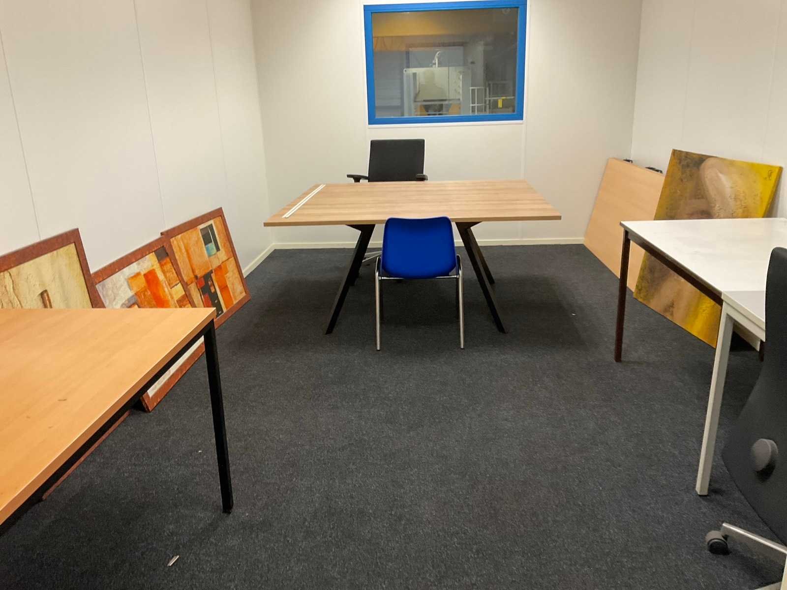 Bestaande uit: (1x) vergadertafel 160x160cm, (3x) tafel, (2x) mobiele bureaustoel, (7x) wanddecoratie, (2x) bureautafel (gedemonteerd), etc. Let op! 1e etage