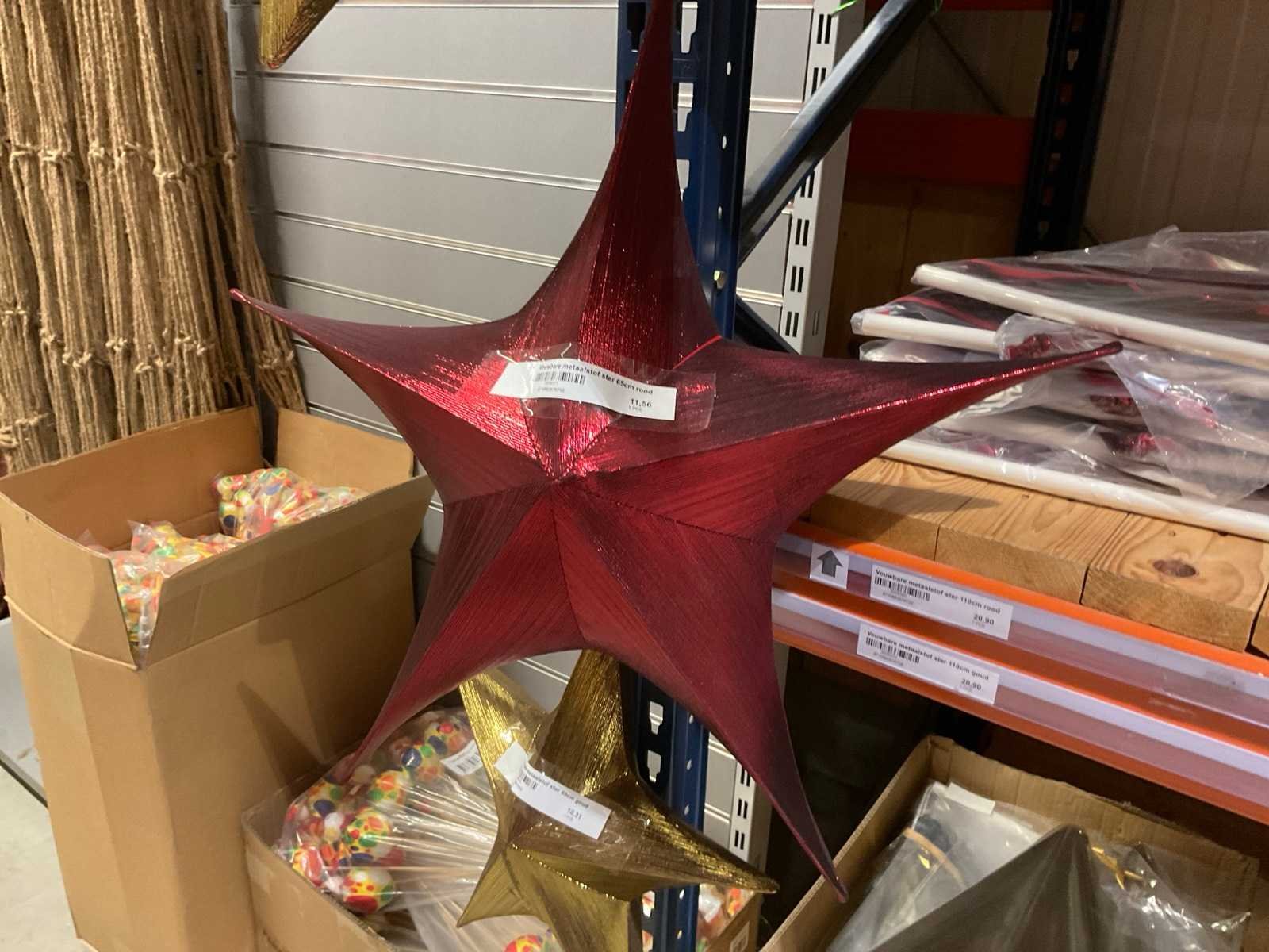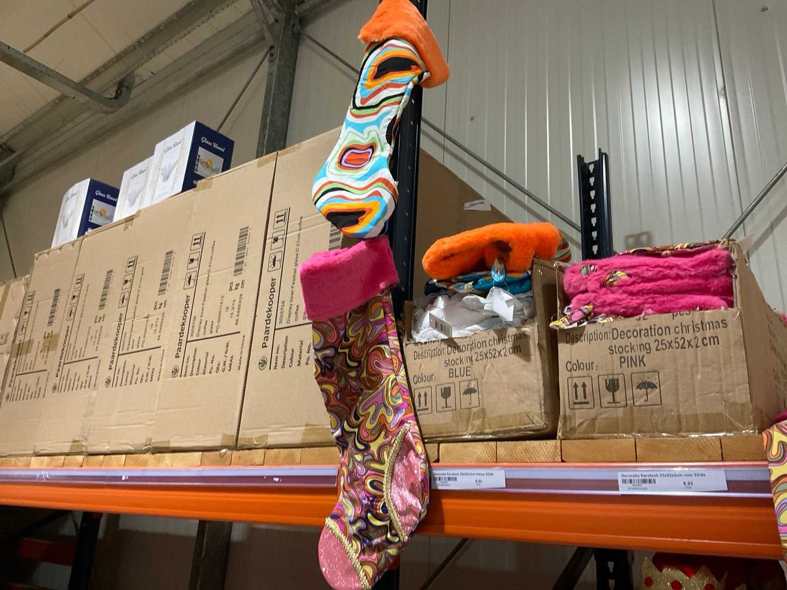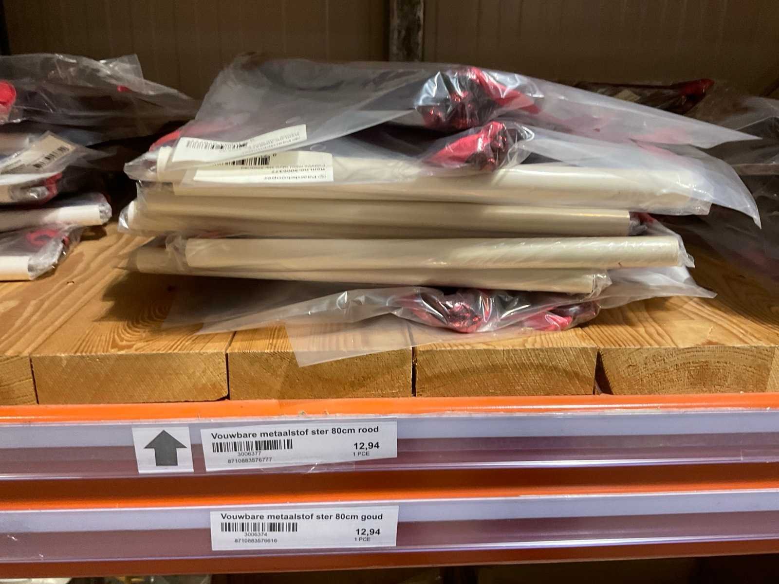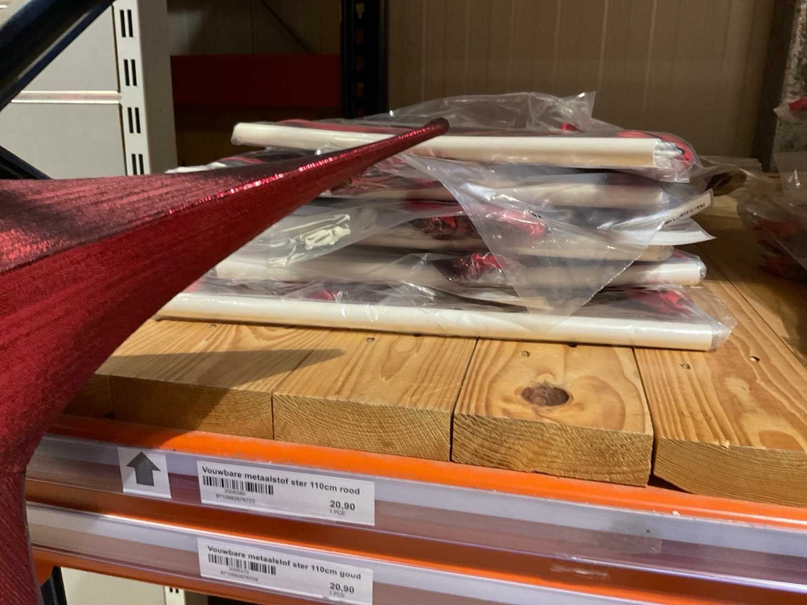 Inhoud 3 stellingsecties met diverse seizoens en decoratie artikelen waaronder poppen, ornamenten, schalen en kommen, sterren, en touw. Exclusief stelling-onderdelen achter gordijn. Exclusief stelling