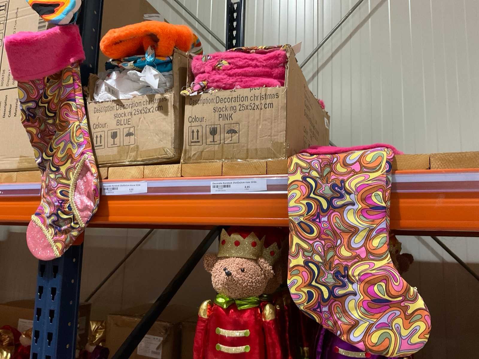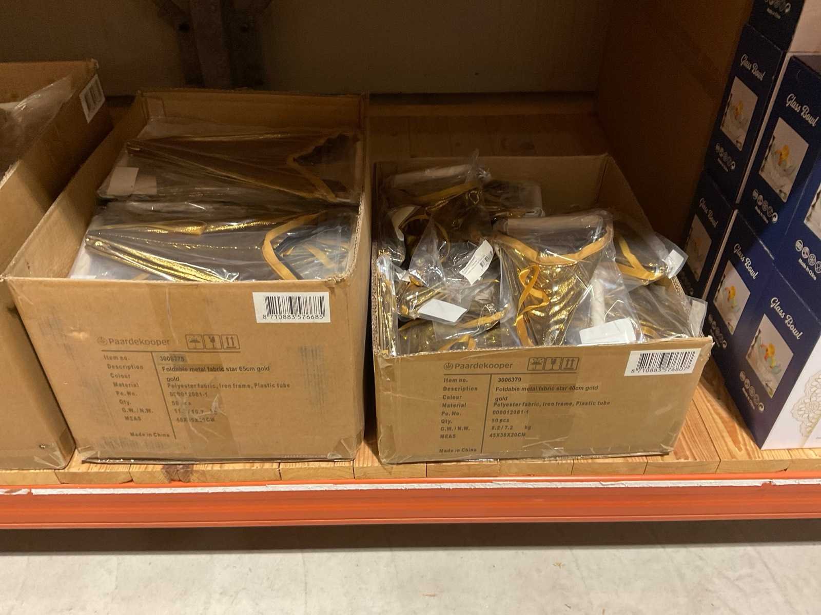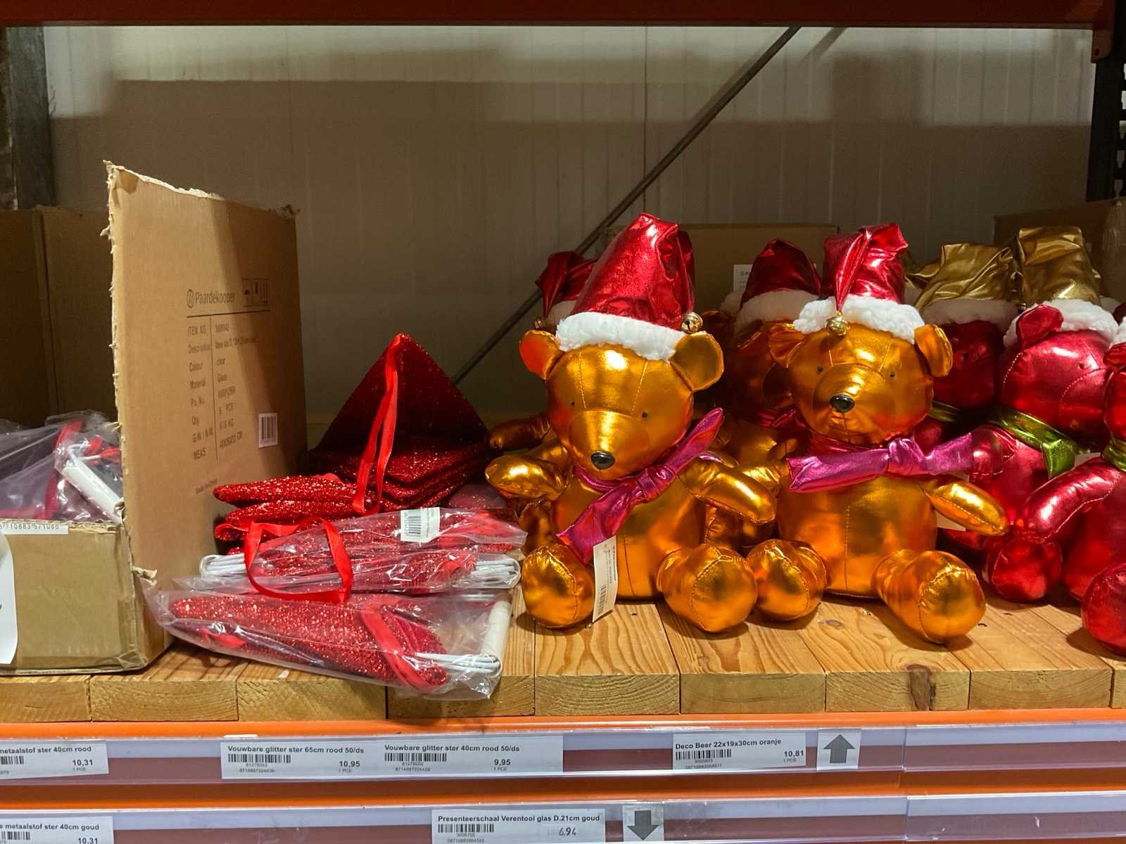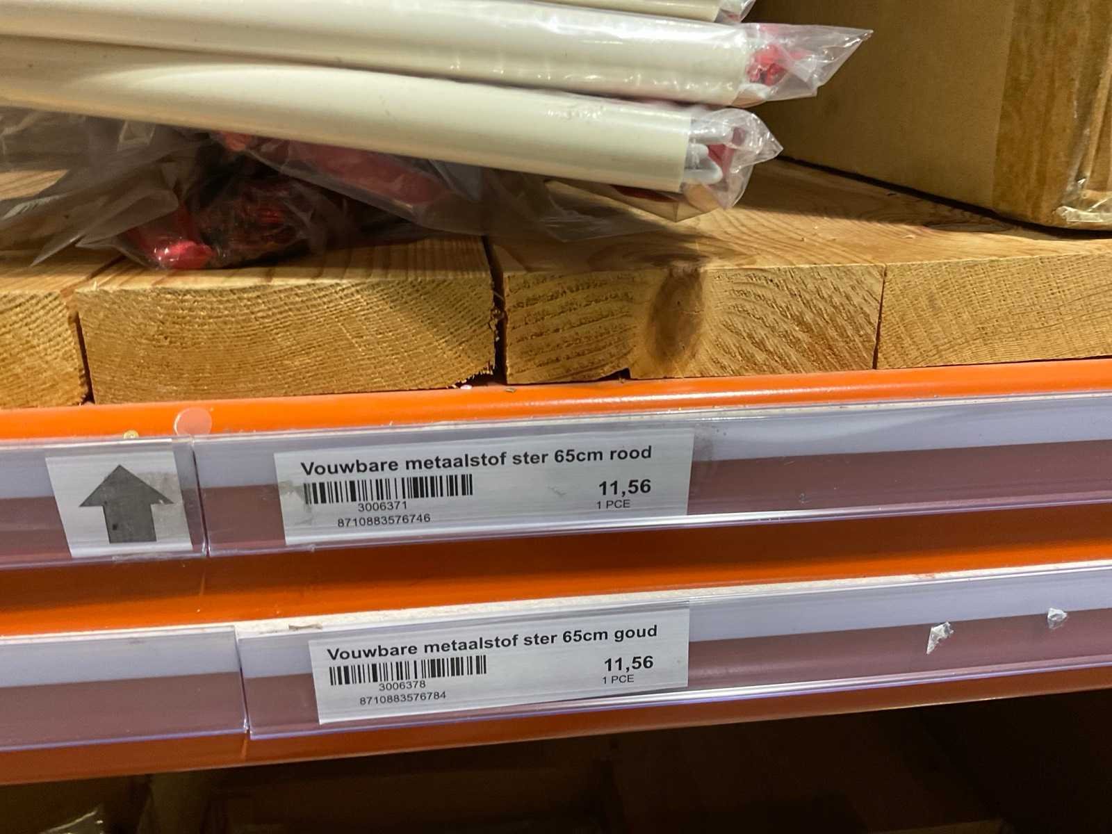 Inhoud 3 stellingsecties met diverse seizoens en decoratie artikelen waaronder poppen, ornamenten, schalen en kommen, sterren, en touw. Exclusief stelling-onderdelen achter gordijn. Exclusief stelling