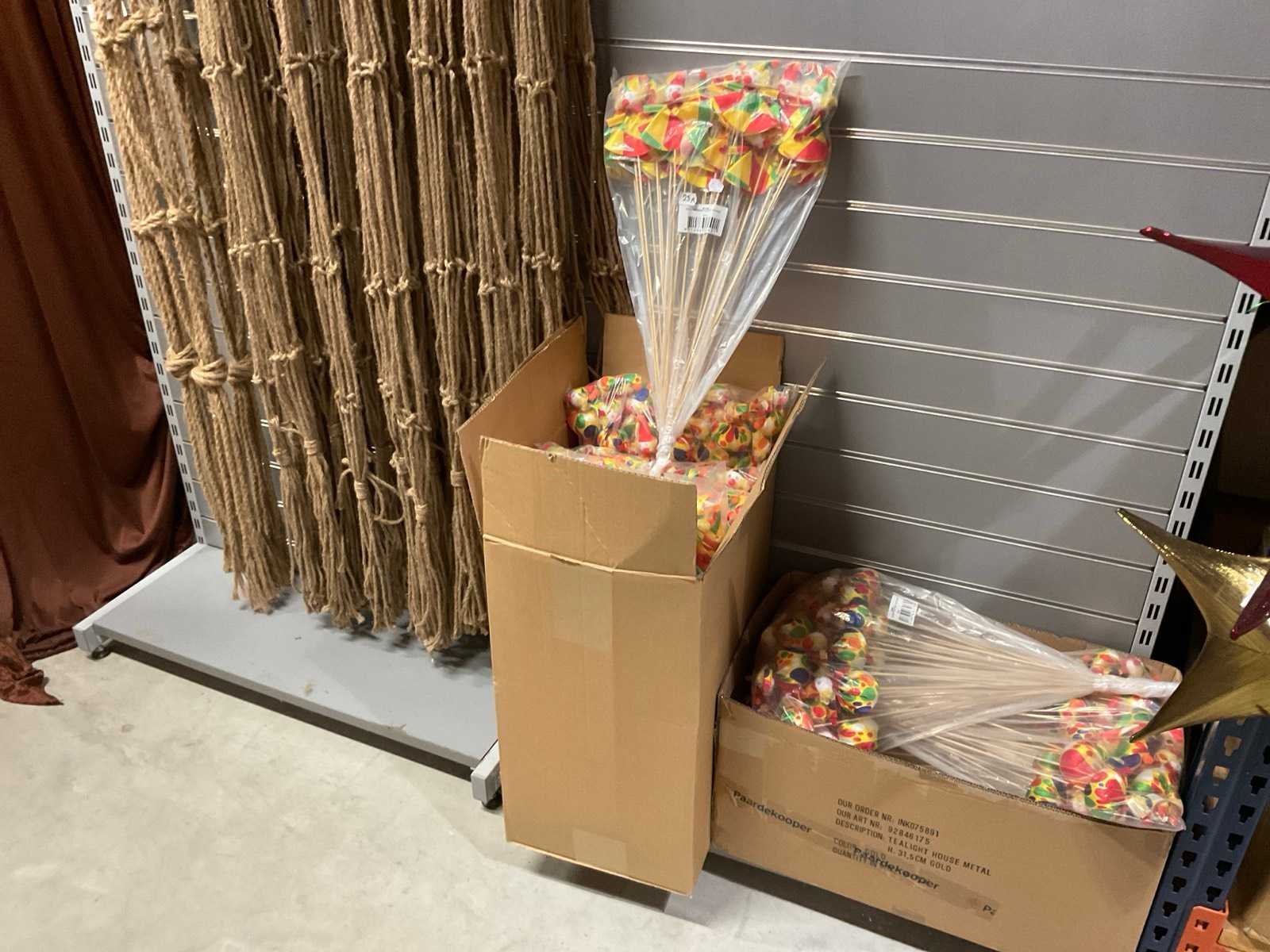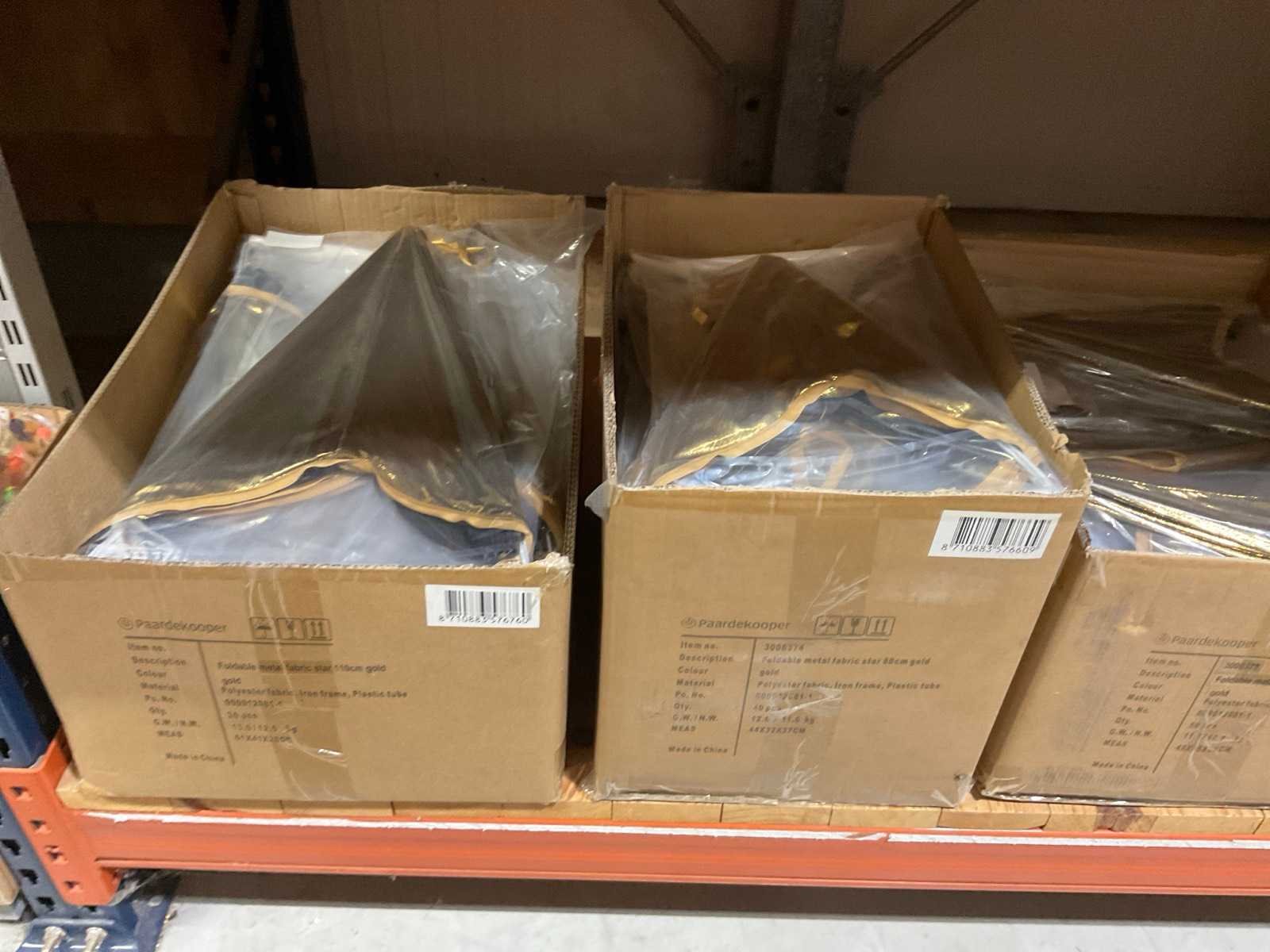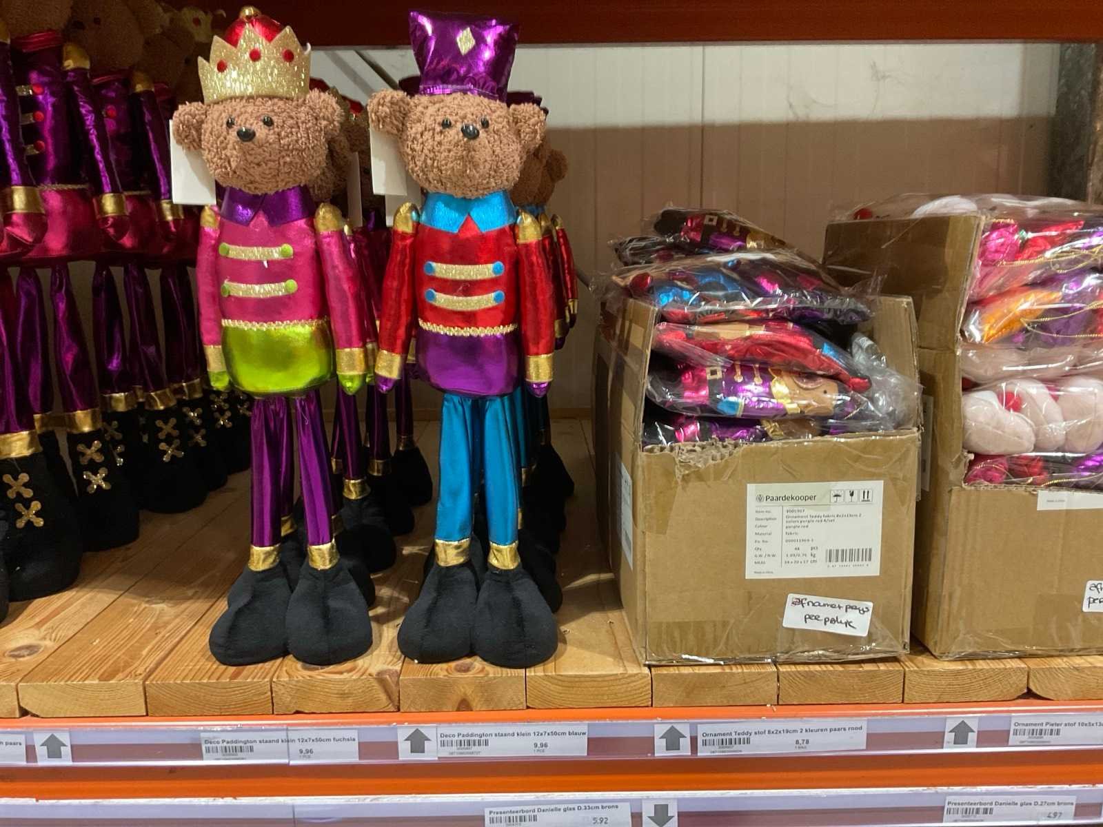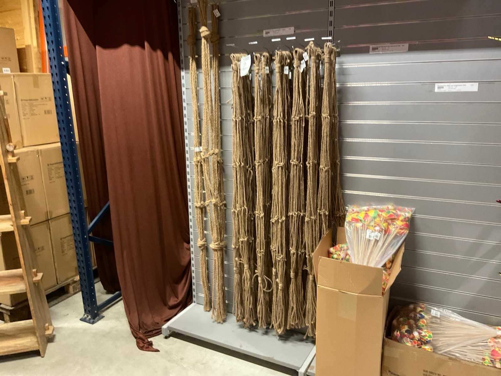 Inhoud 3 stellingsecties met diverse seizoens en decoratie artikelen waaronder poppen, ornamenten, schalen en kommen, sterren, en touw. Exclusief stelling-onderdelen achter gordijn. Exclusief stelling