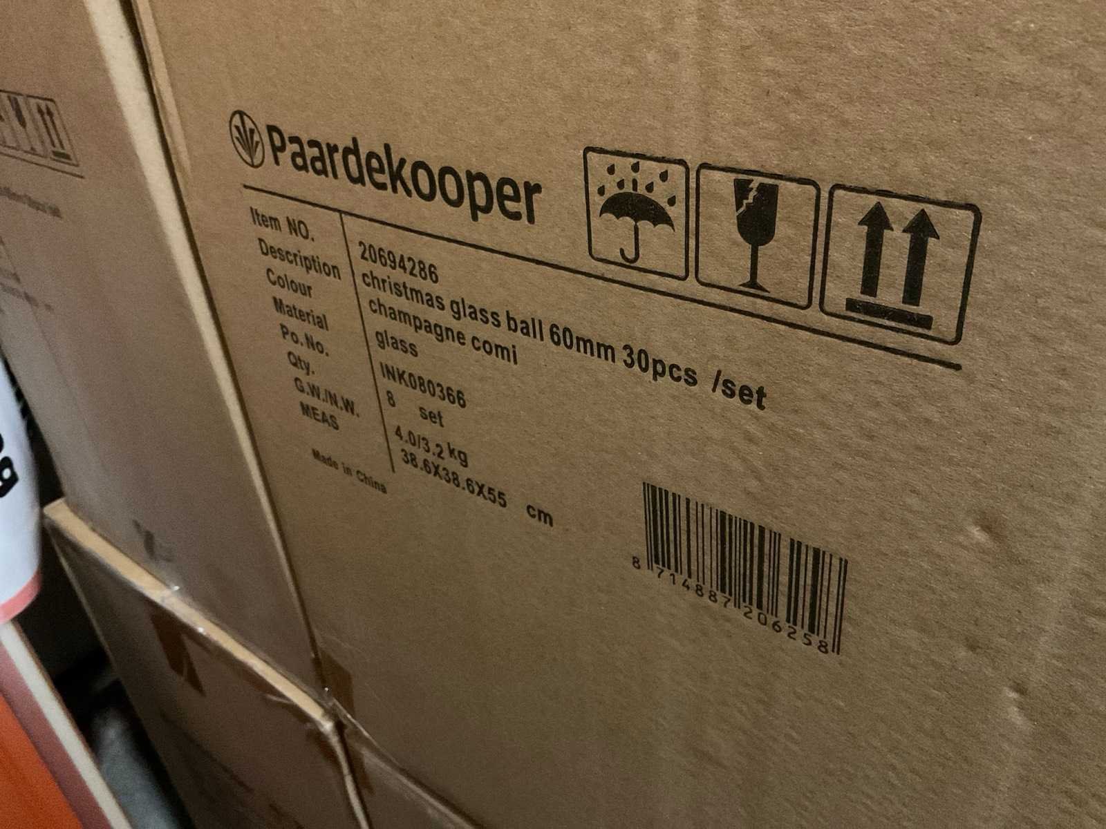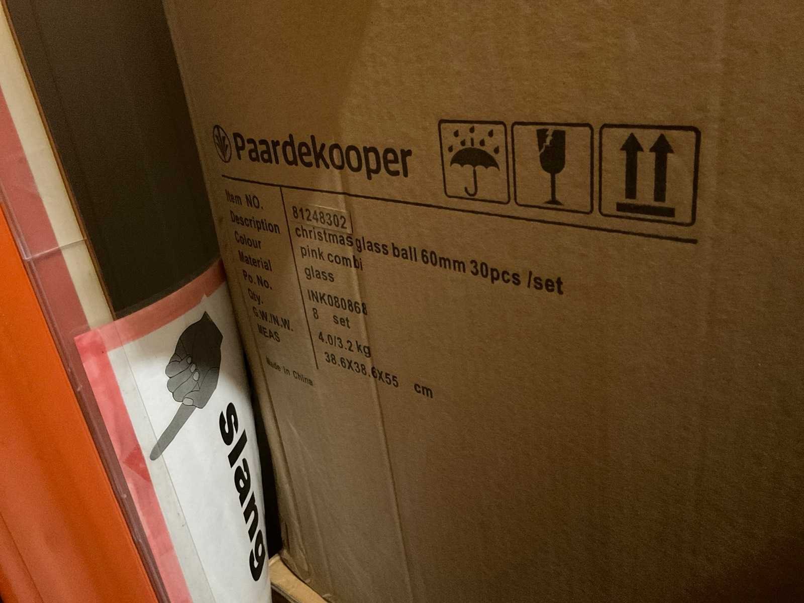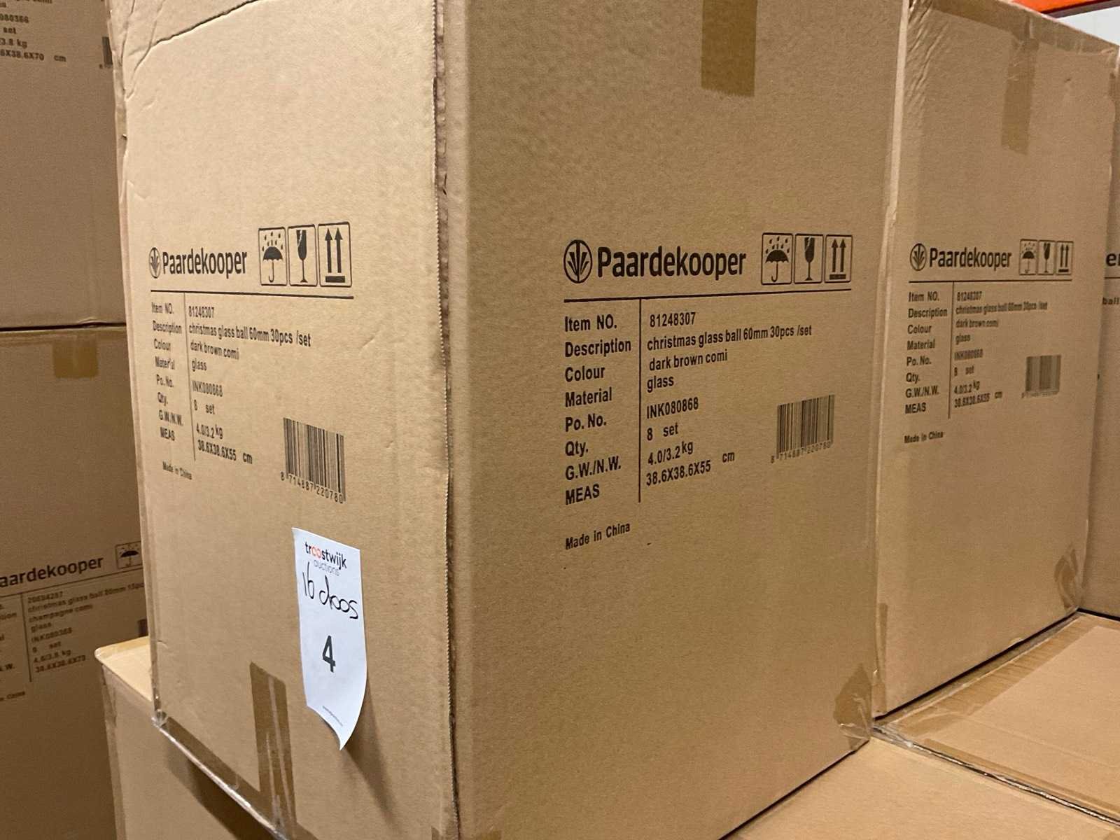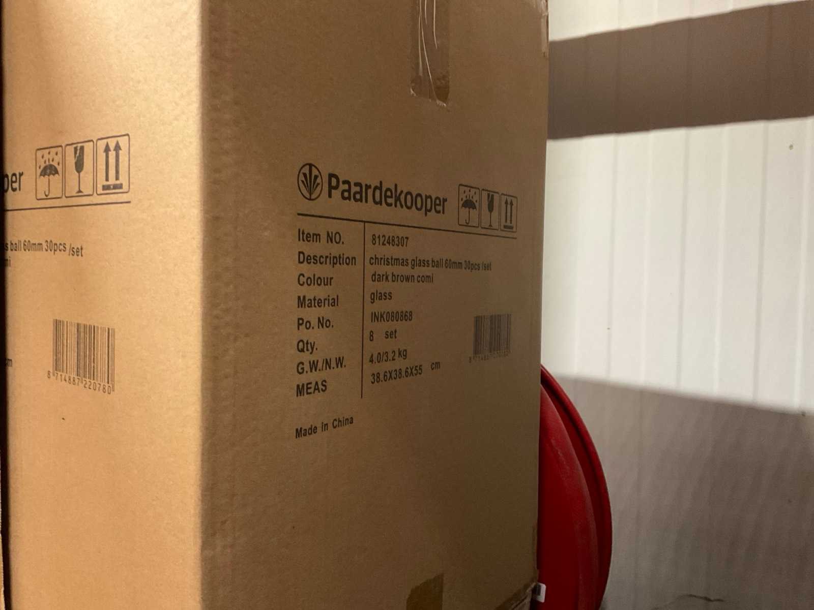 Partij kerstballen in doos. Verschillende soorten/kleuren. Bestaat uit 1 pallet met 16 dozen