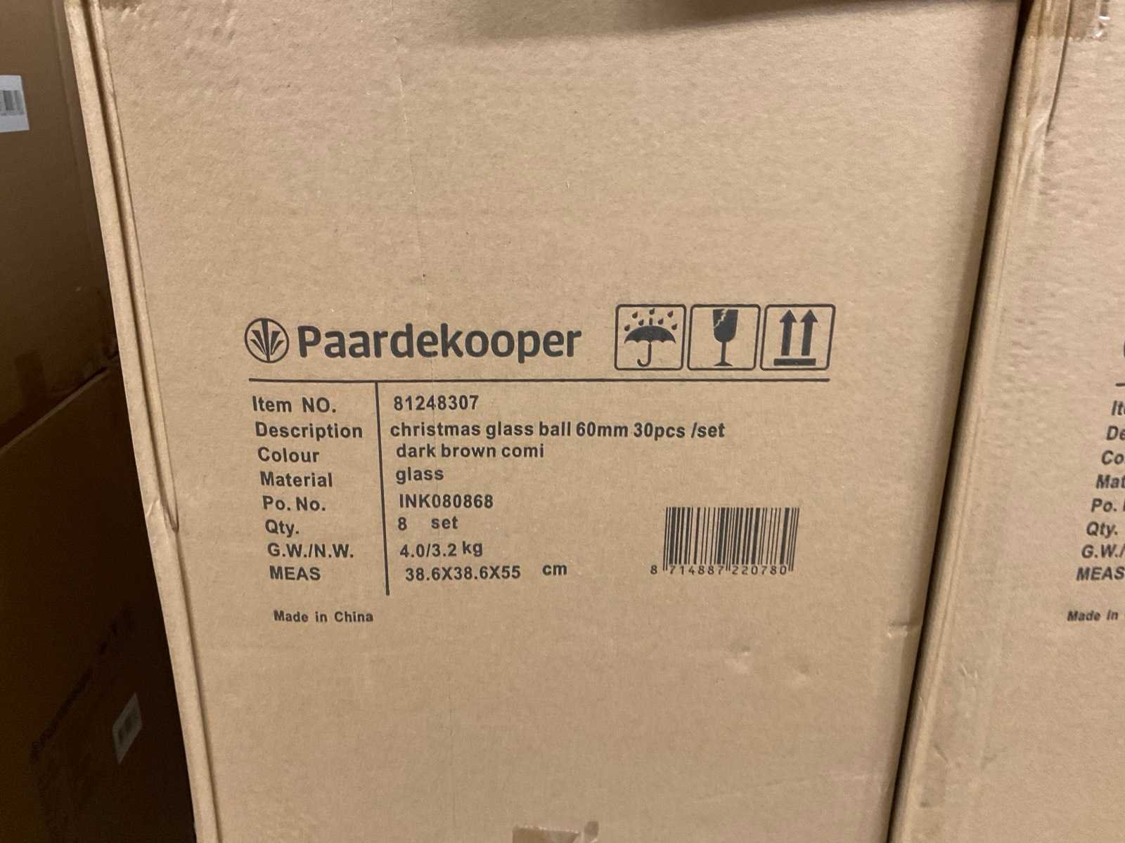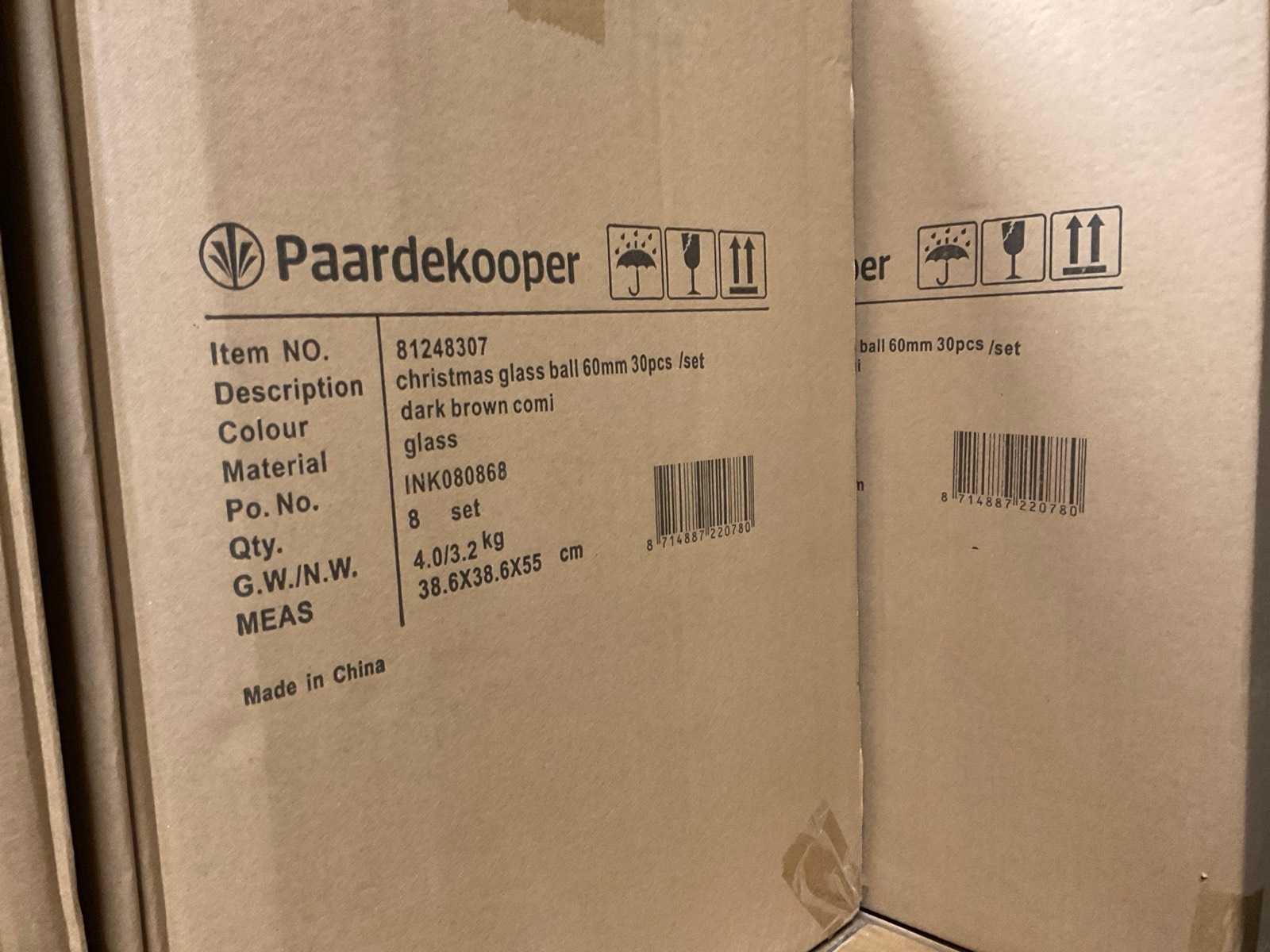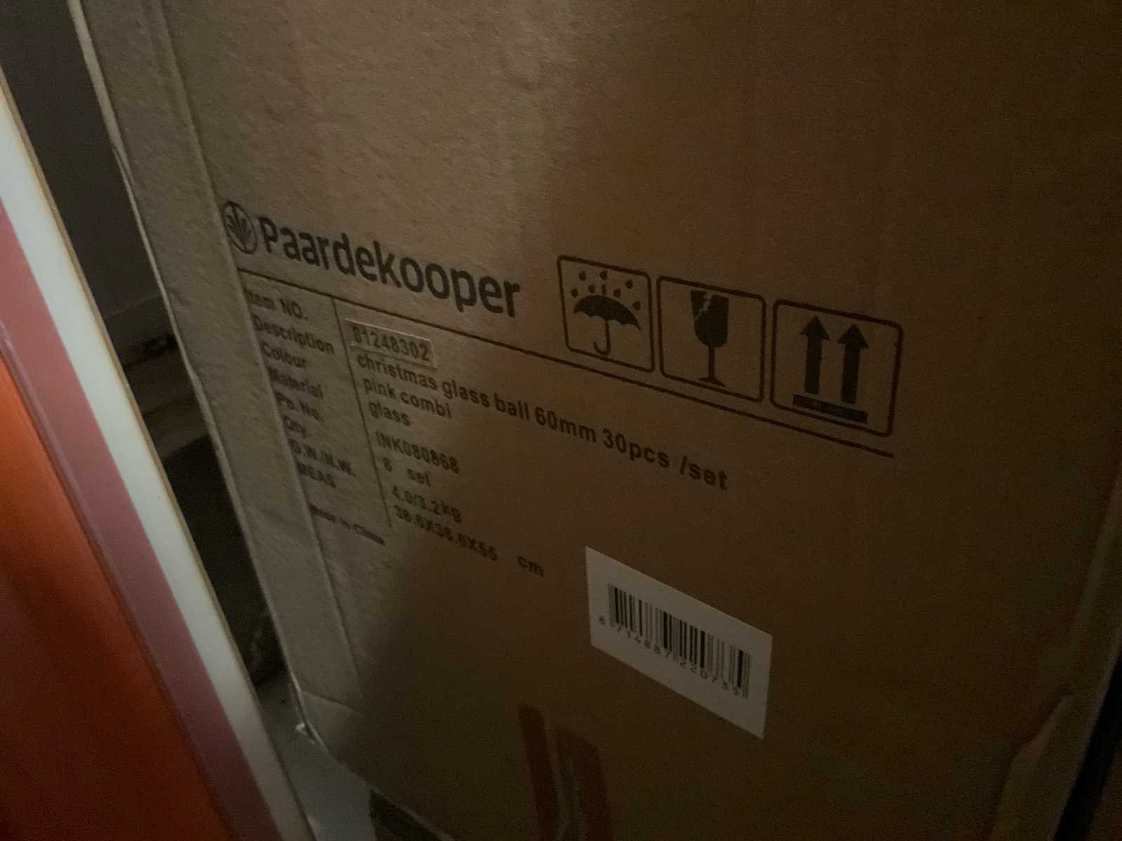 Partij kerstballen in doos. Verschillende soorten/kleuren. Bestaat uit 1 pallet met 16 dozen