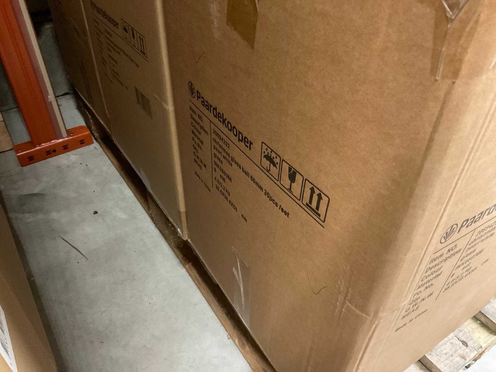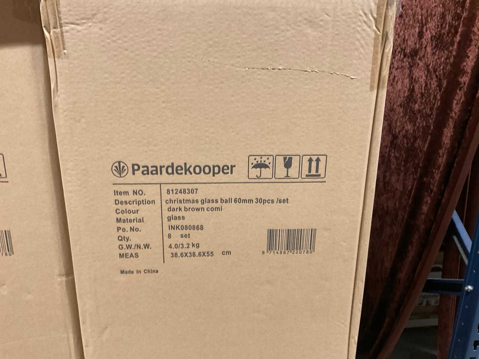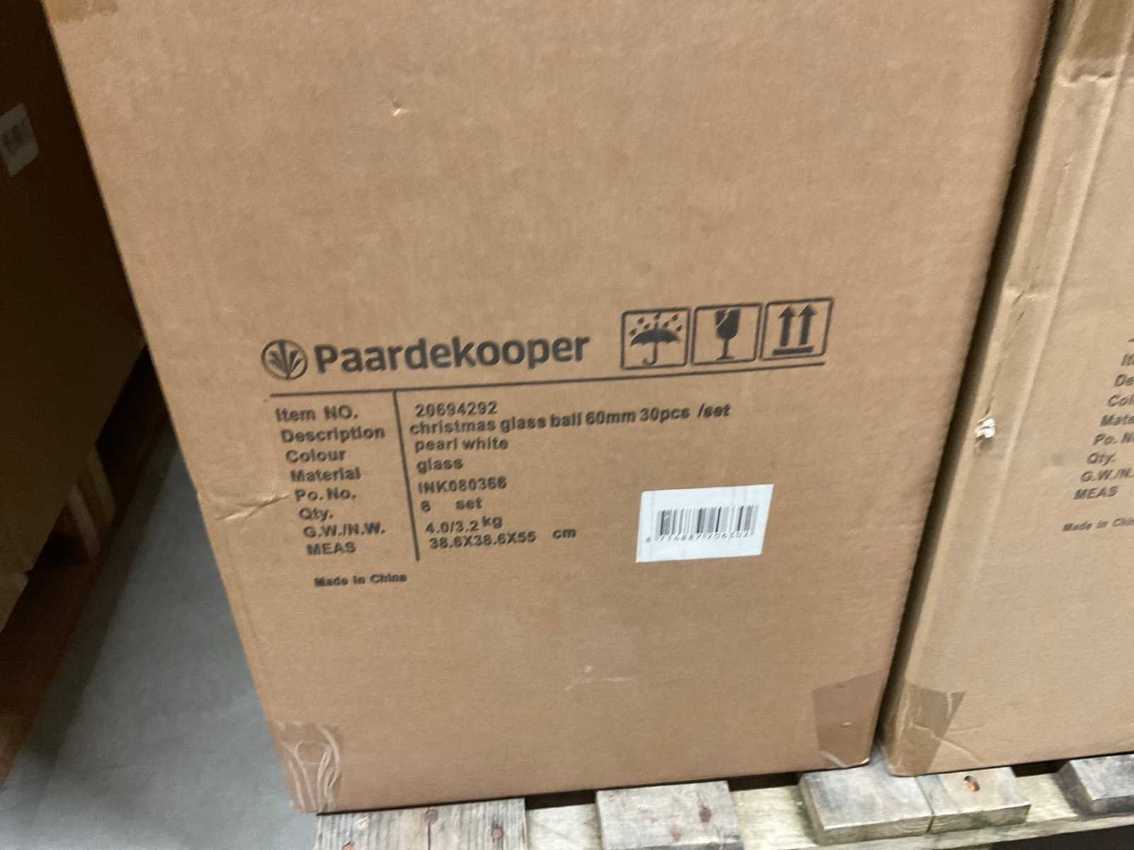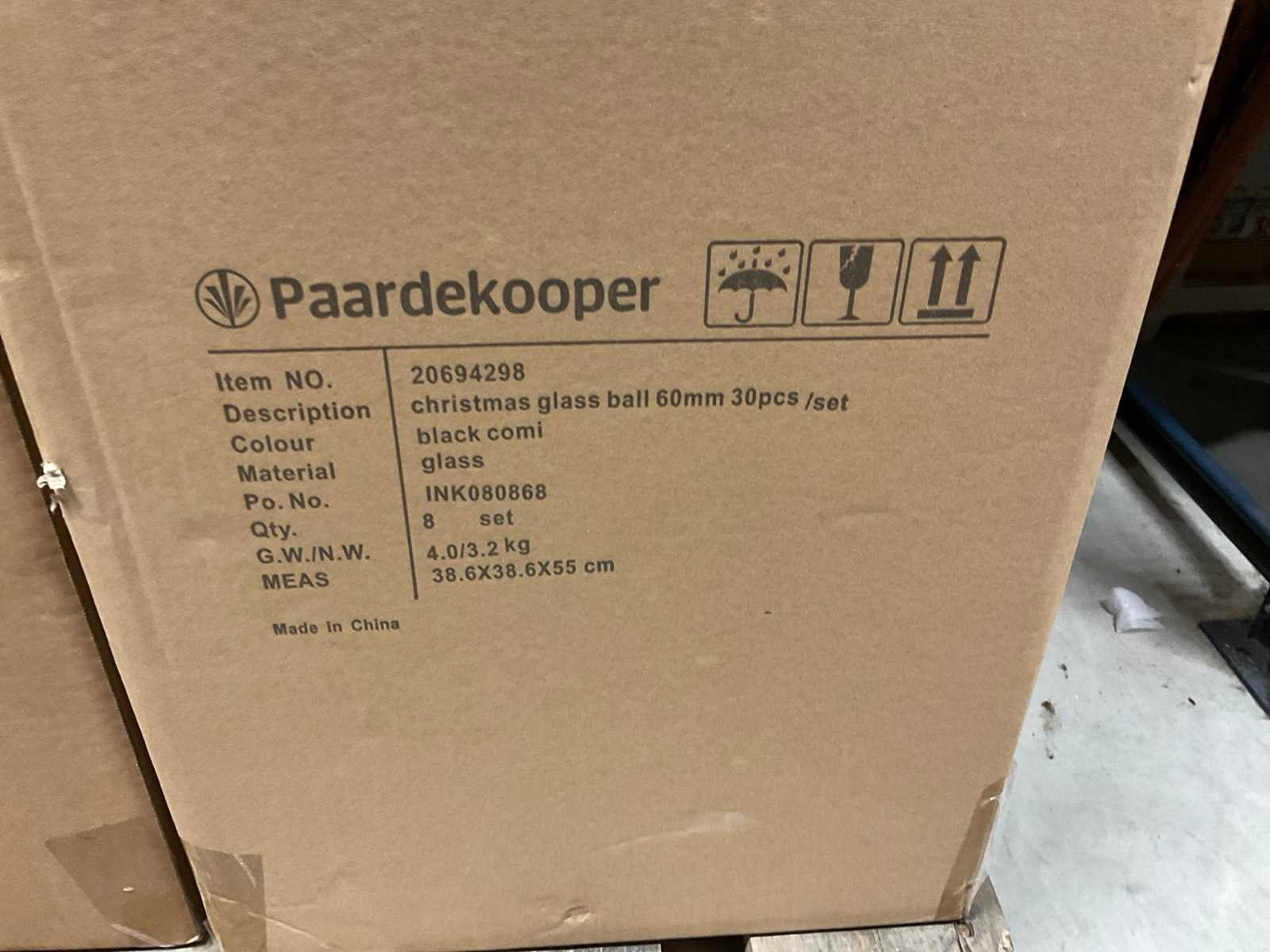 Partij kerstballen in doos. Verschillende soorten/kleuren. Bestaat uit 1 pallet met 16 dozen