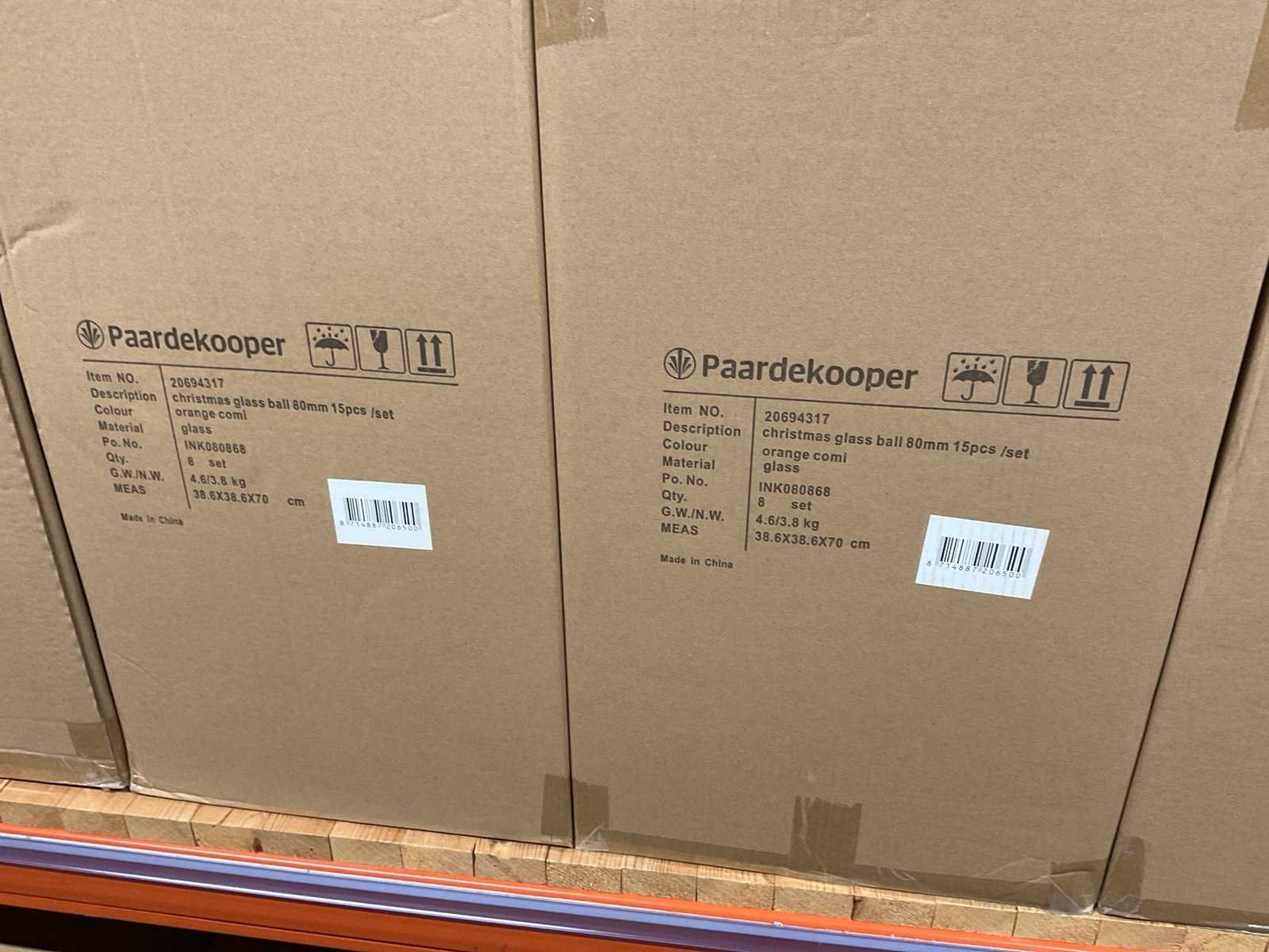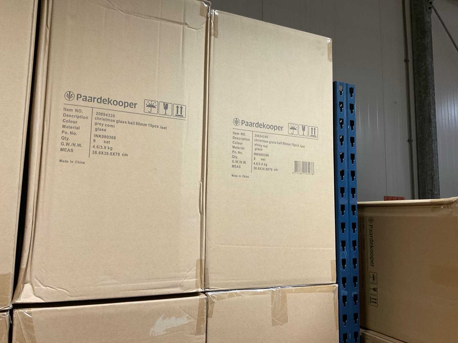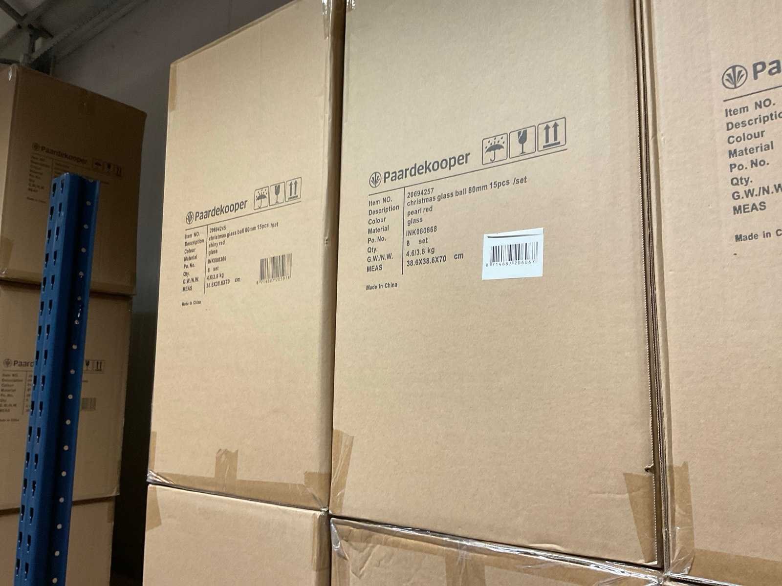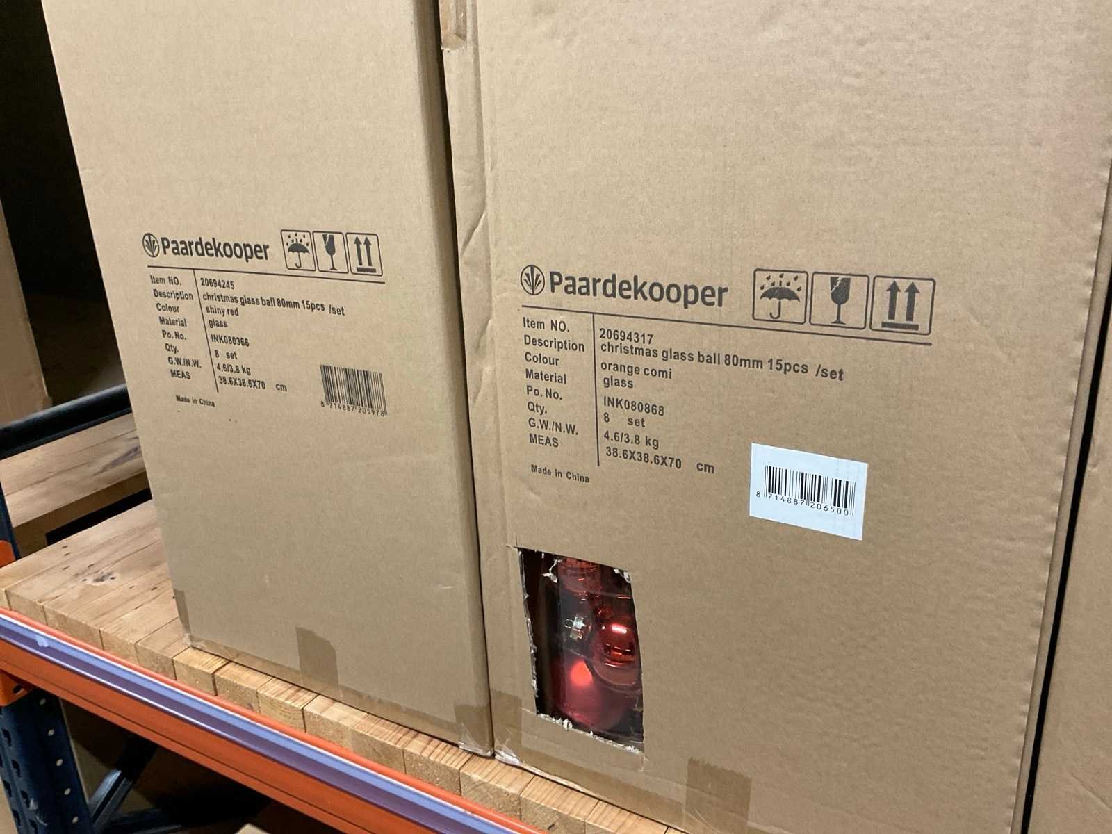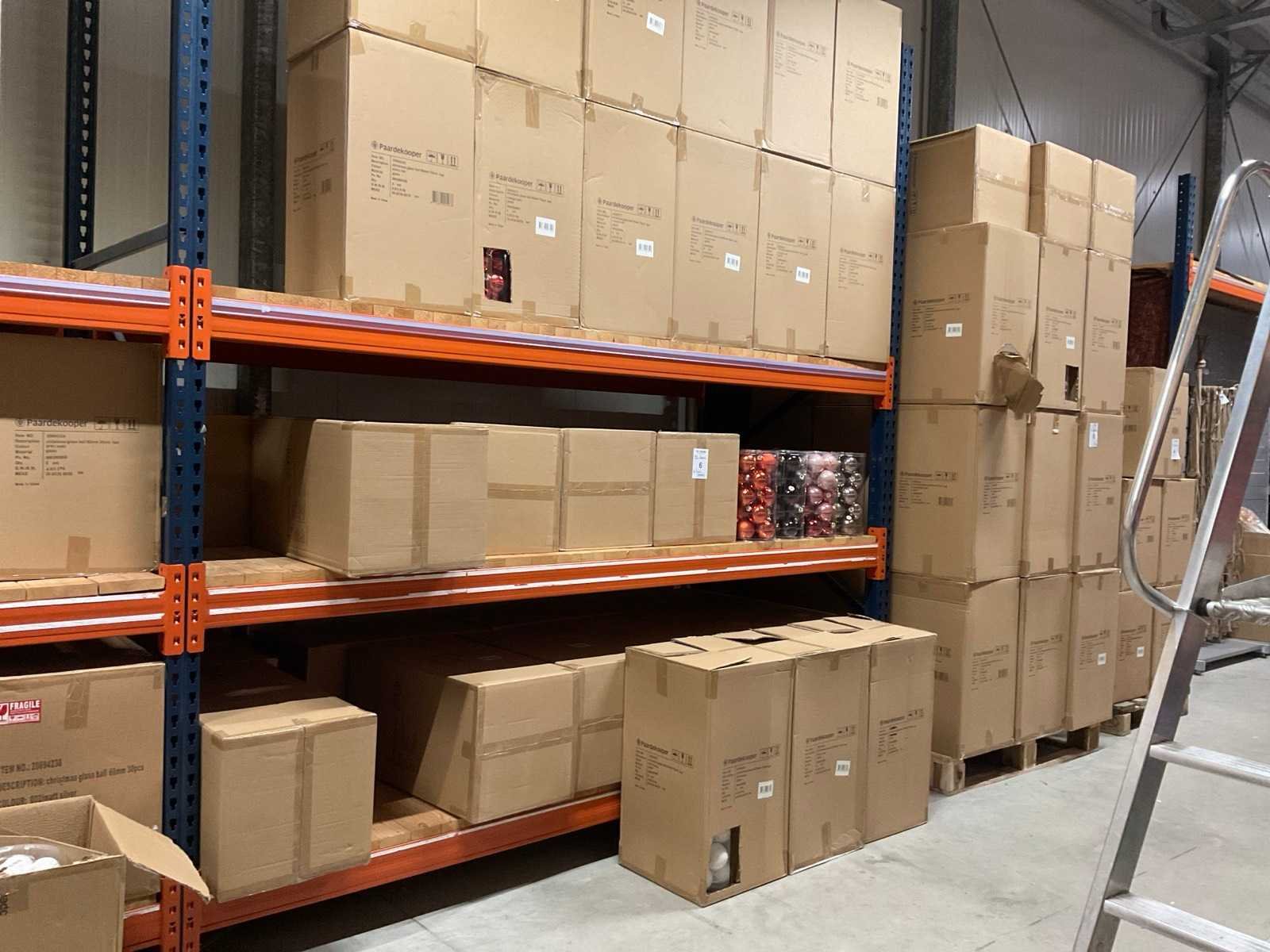Verschillende soorten/kleuren kerstballen. Bestaat uit circa 32 dozen in 1 stellingsectie. Exclusief stelling