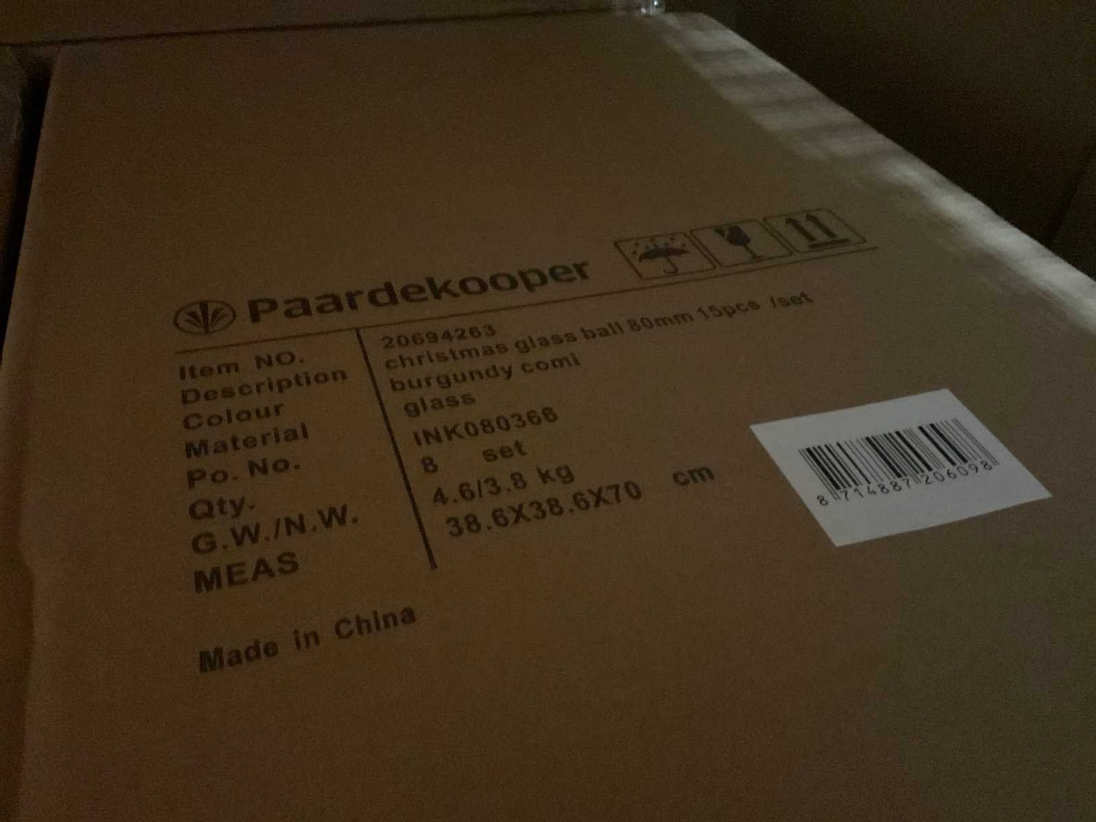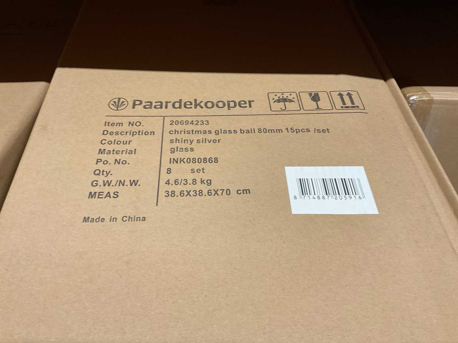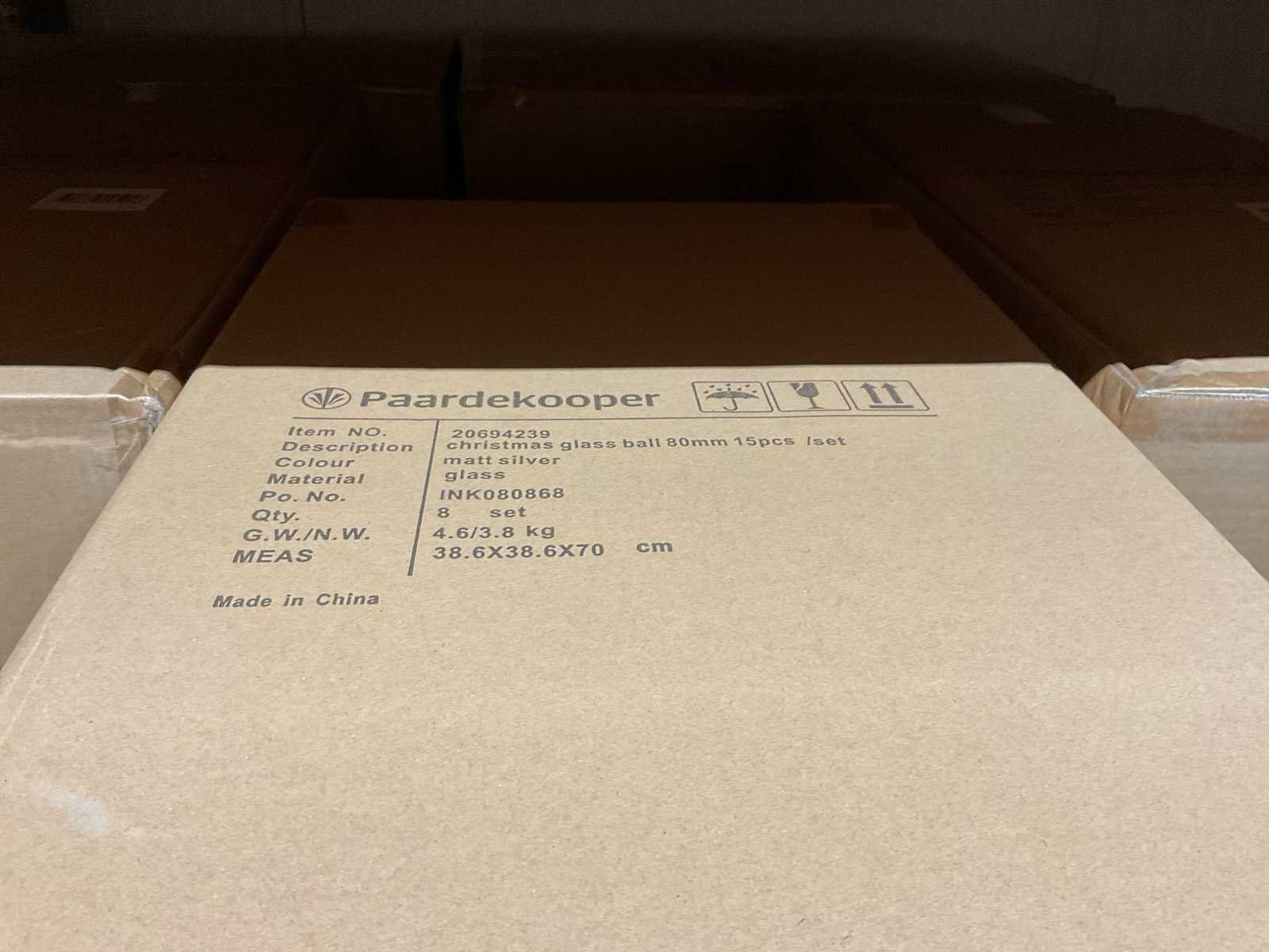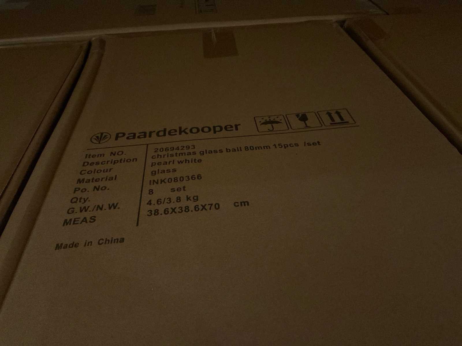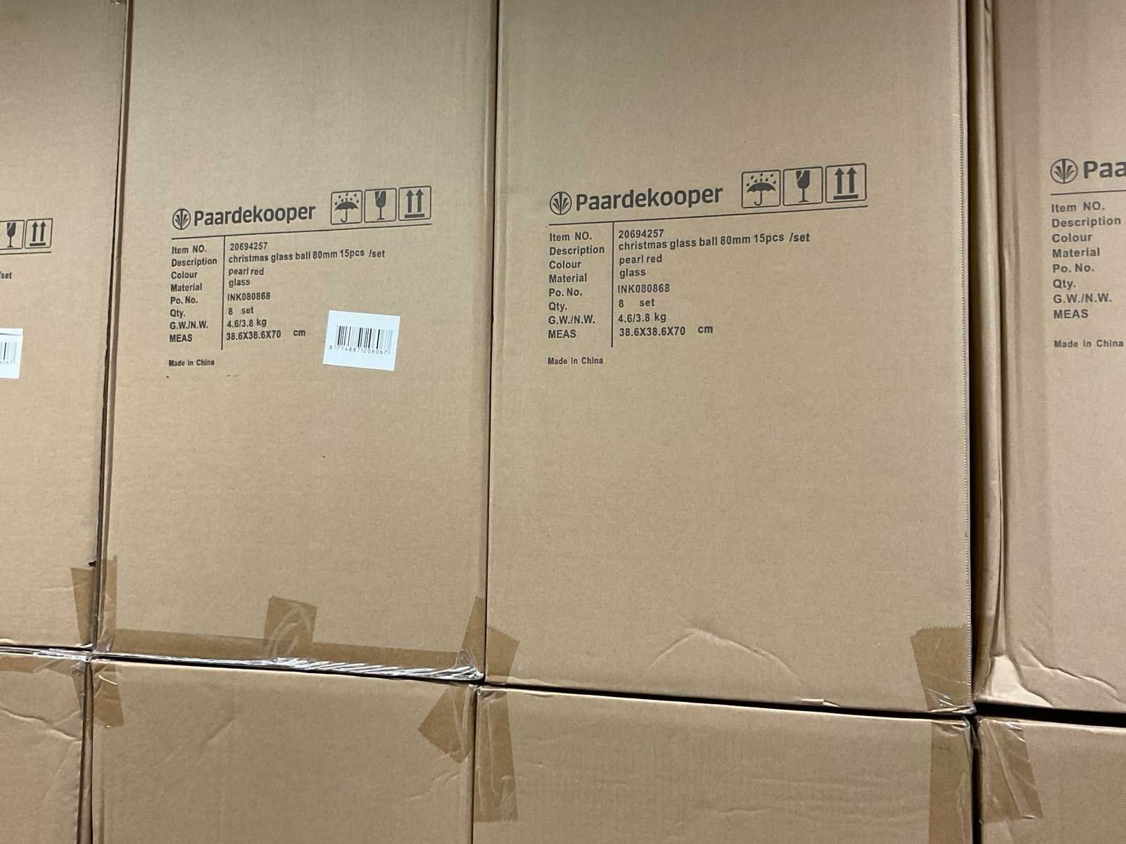 Verschillende soorten/kleuren kerstballen. Bestaat uit circa 32 dozen in 1 stellingsectie. Exclusief stelling