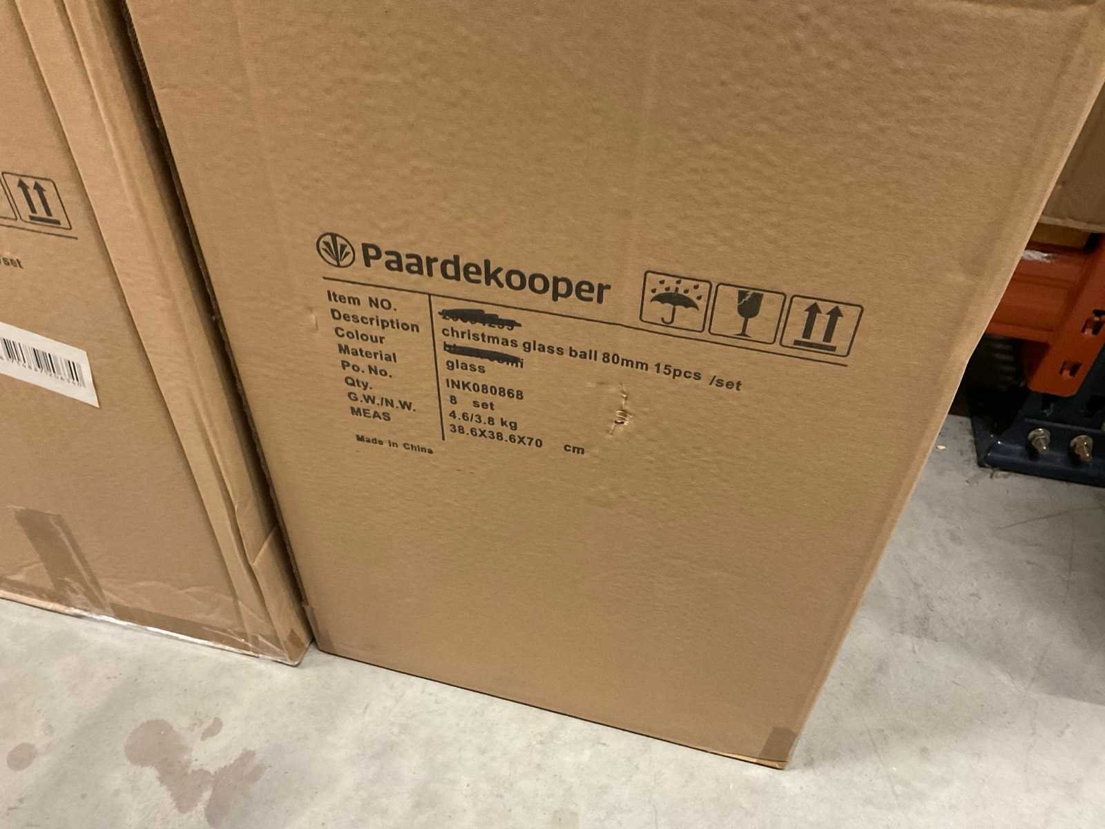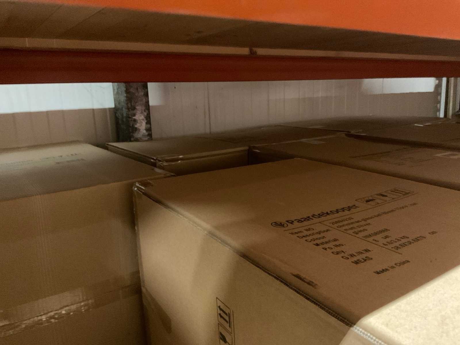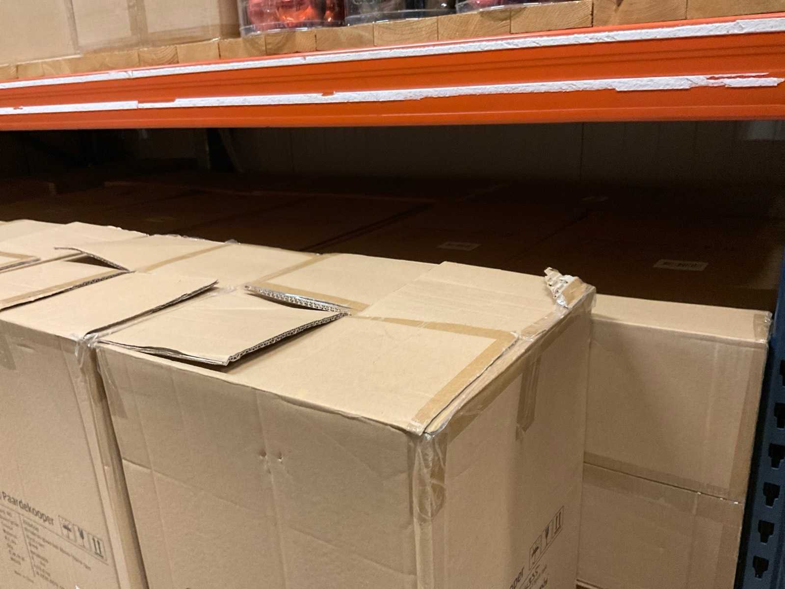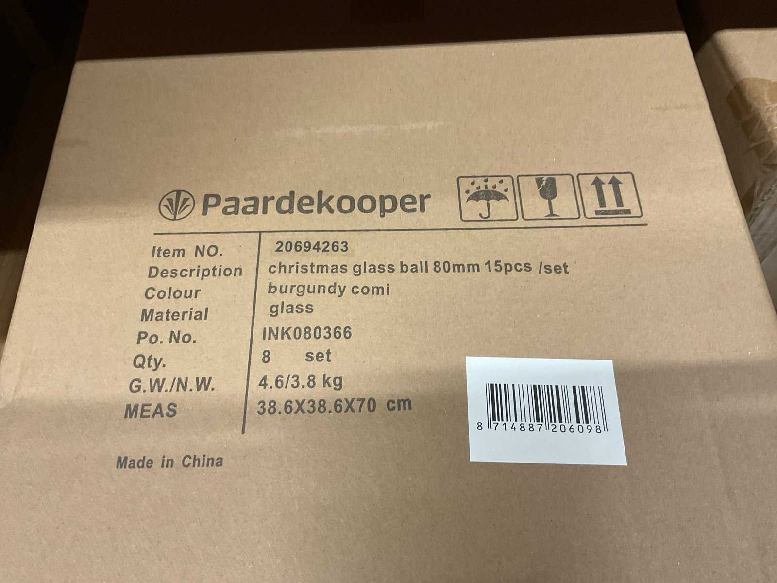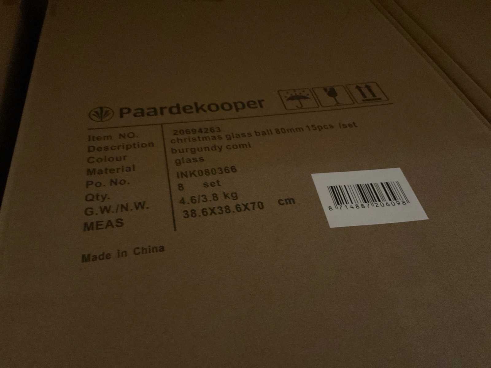 Verschillende soorten/kleuren kerstballen. Bestaat uit circa 32 dozen in 1 stellingsectie. Exclusief stelling