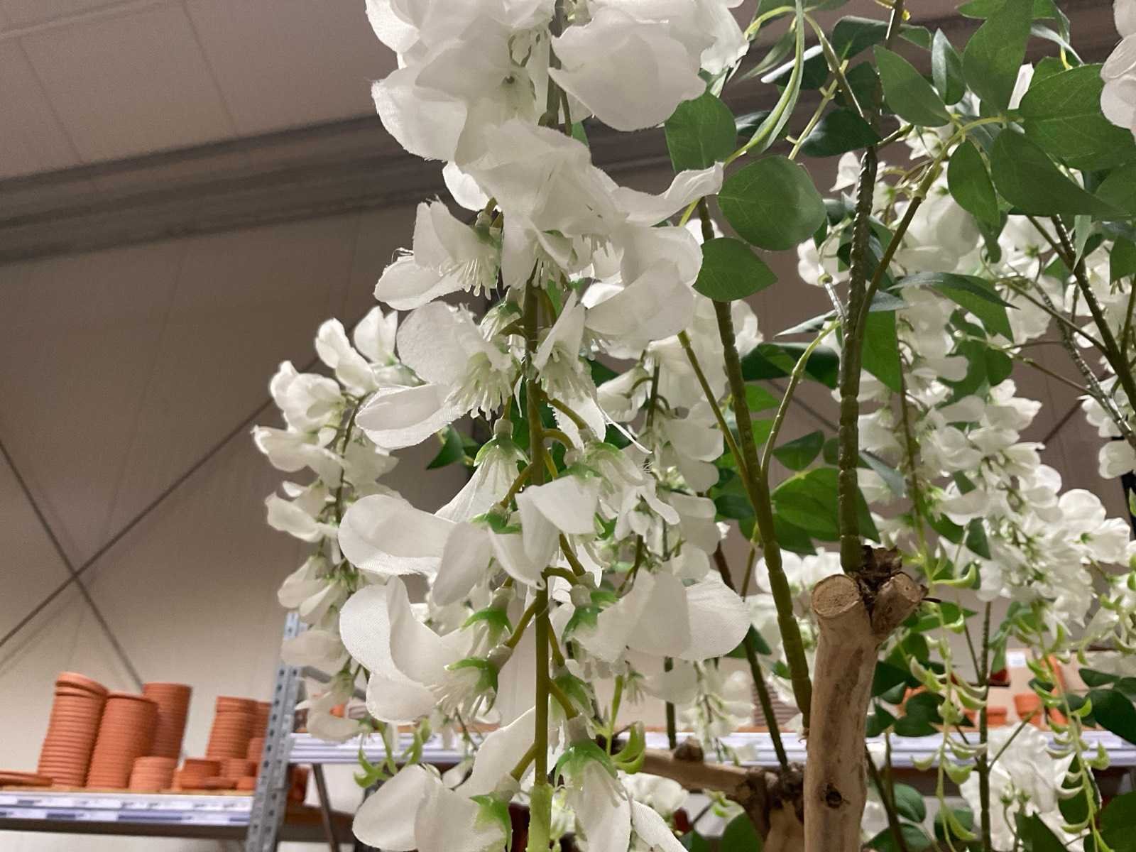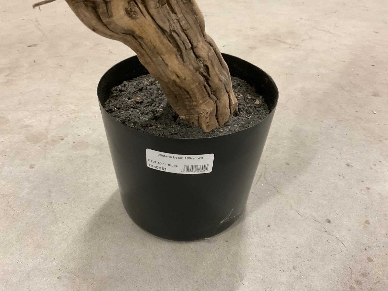 1 wisteria kunstboom. Stam is van echt hout. Zijtakken/bloemen zijn gemaakt van kunststof. Nieuwprijs 227,50. Zijtakken zijn niet afneembaar Hoogte ca.: 320cm