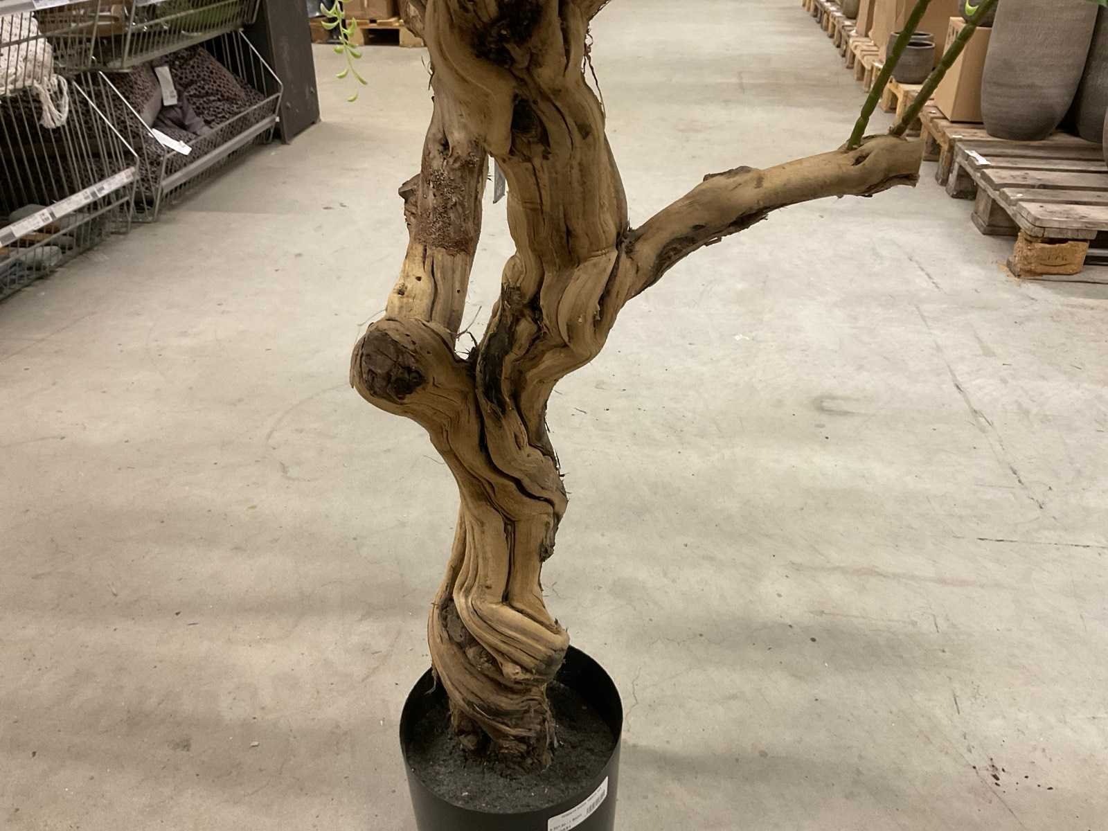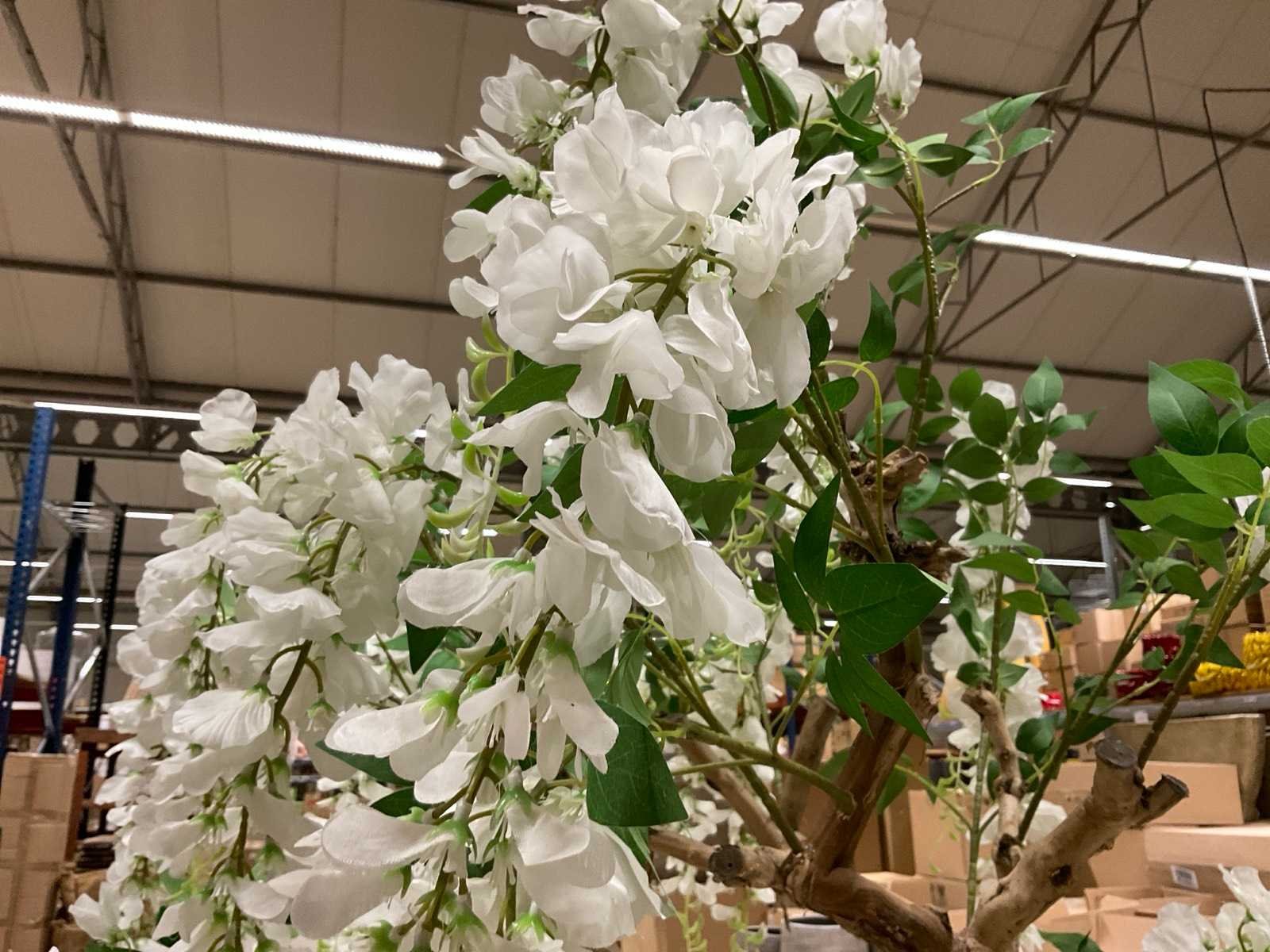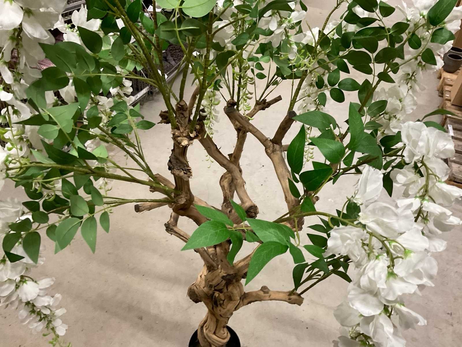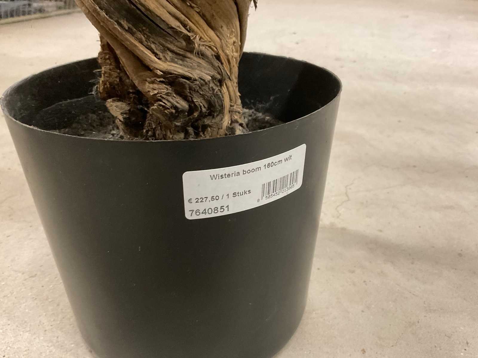 1 wisteria kunstboom. Stam is van echt hout. Zijtakken/bloemen zijn gemaakt van kunststof. Nieuwprijs 227,50. Zijtakken zijn niet afneembaar Hoogte ca.: 320cm