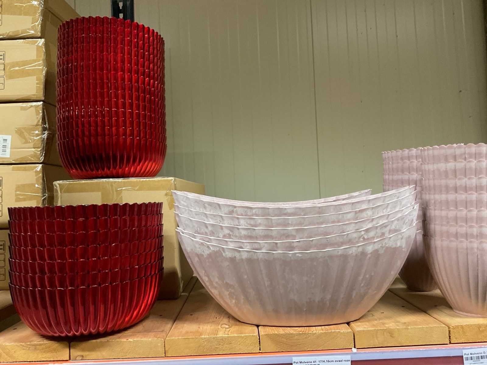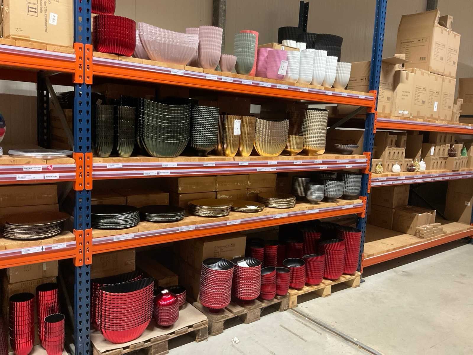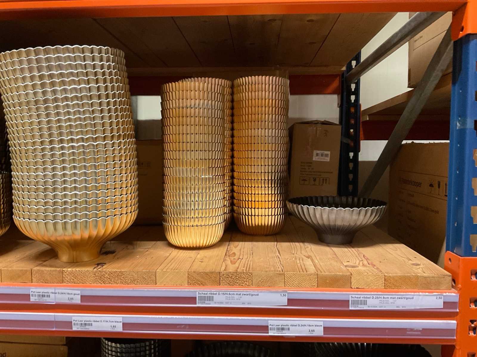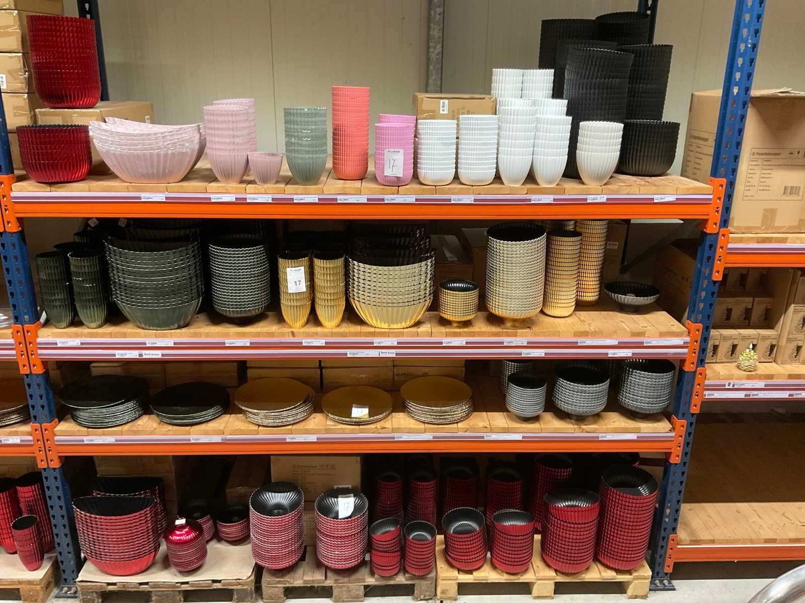 Bestaat uit inhoud van 1 stelling-sectie waaronder verschillende soorten/kleuren kunststof potten, kommen en schalen. Inclusief 3 pallets. Inclusief stelling