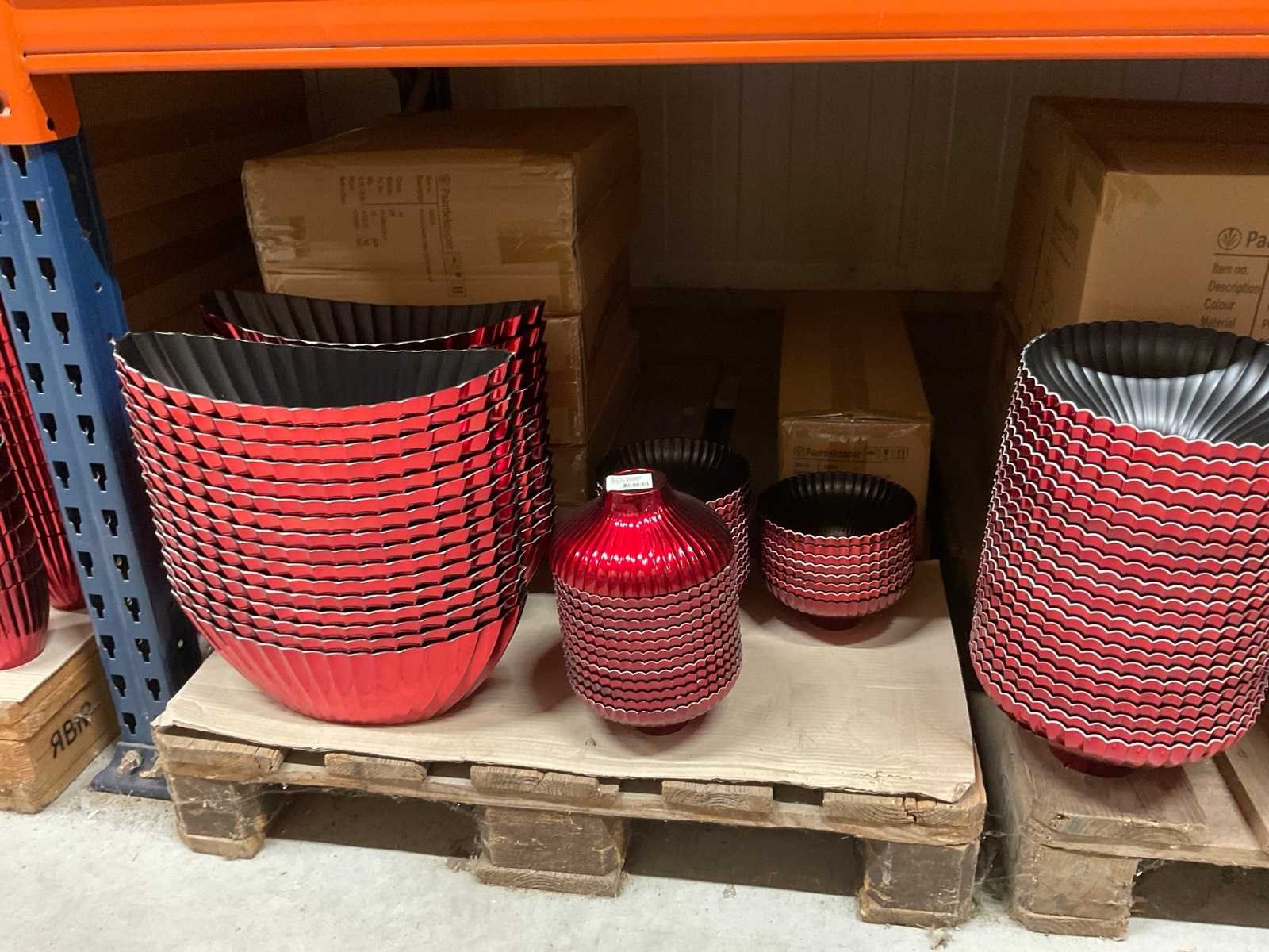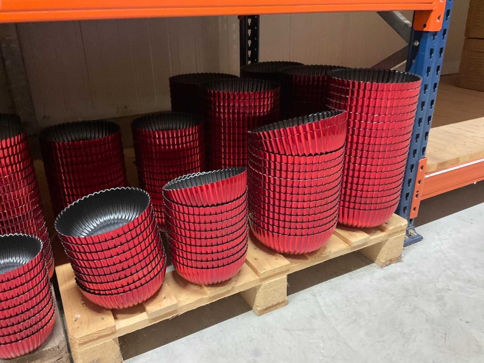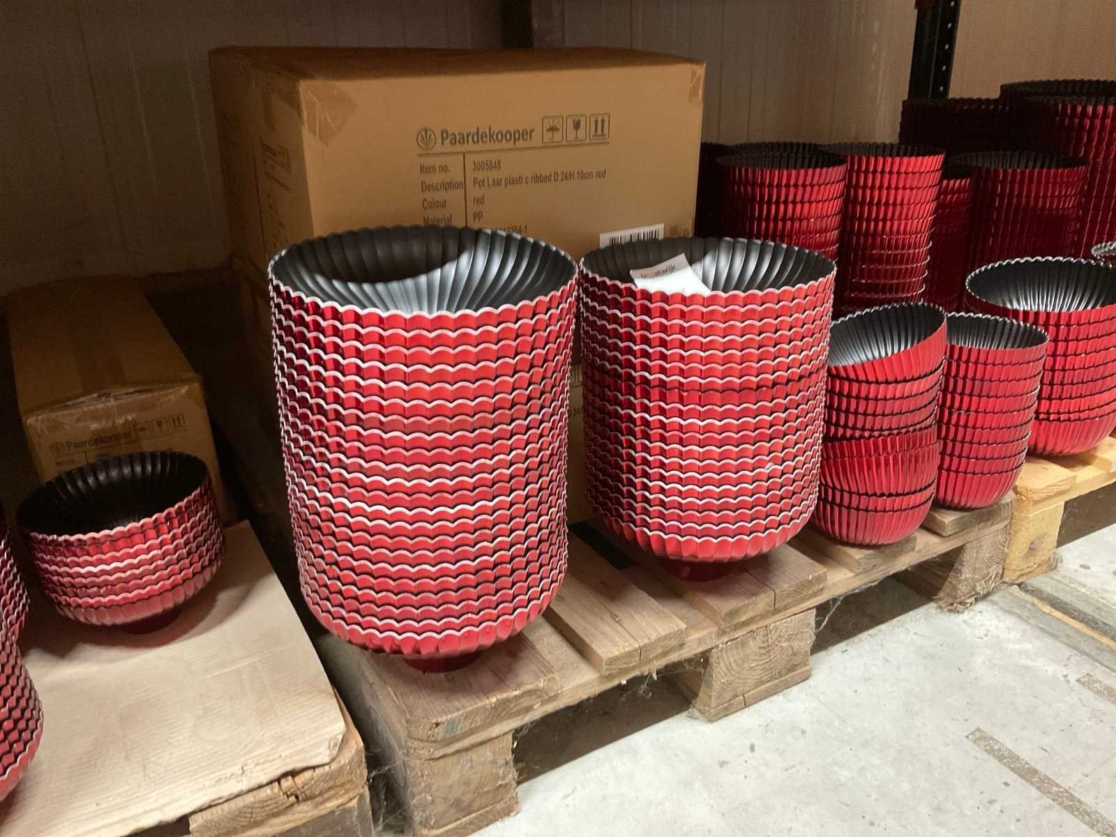 Bestaat uit inhoud van 1 stelling-sectie waaronder verschillende soorten/kleuren kunststof potten, kommen en schalen. Inclusief 3 pallets. Inclusief stelling
