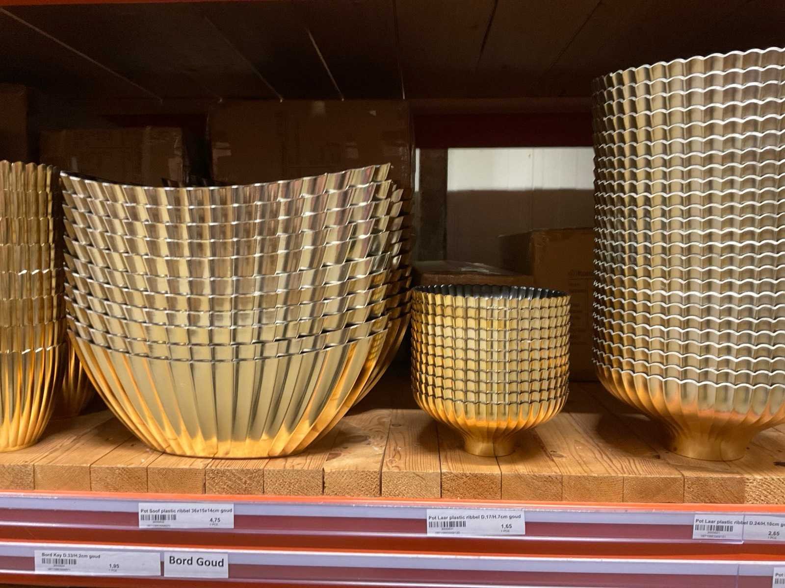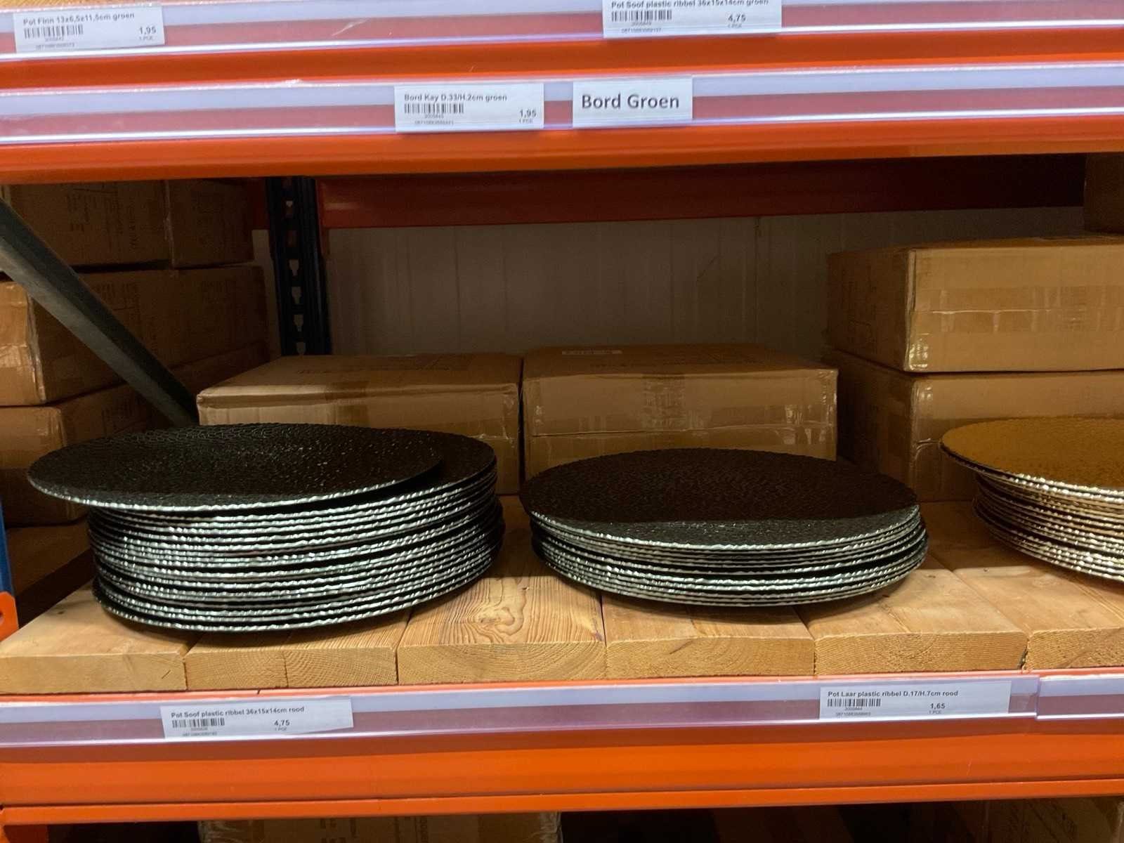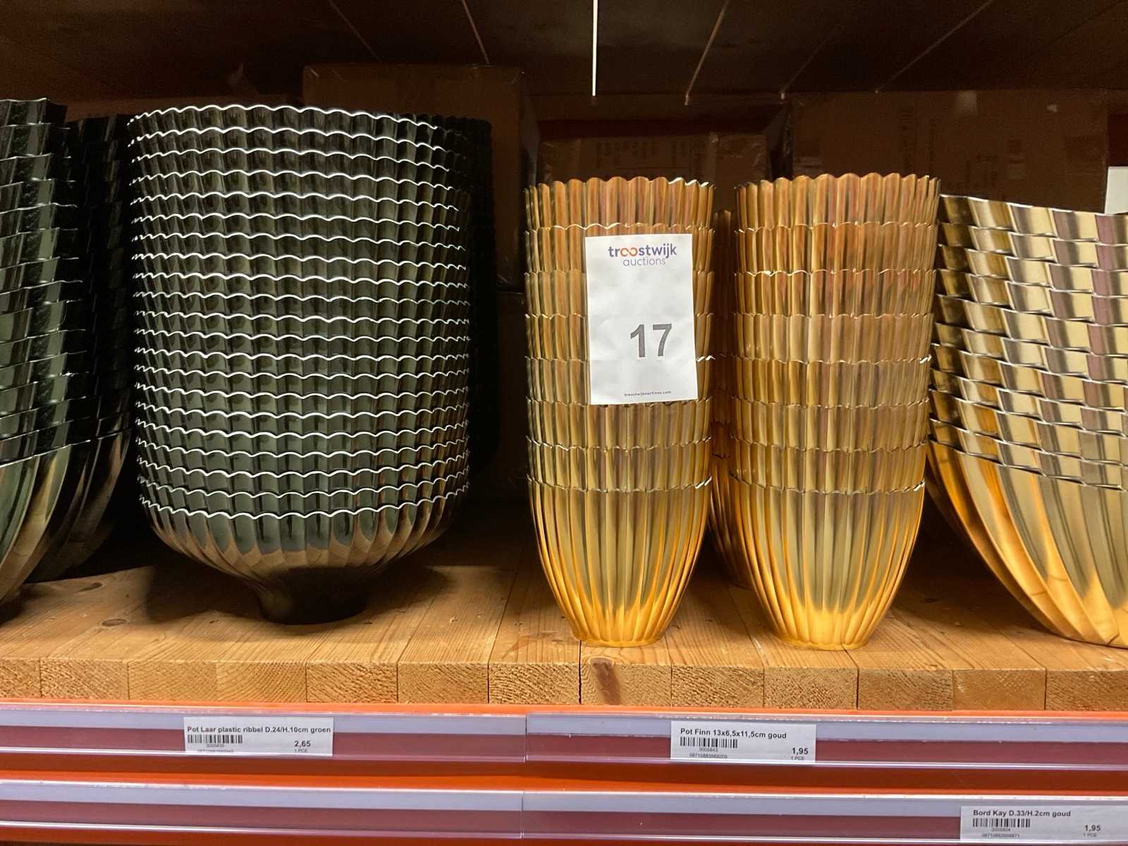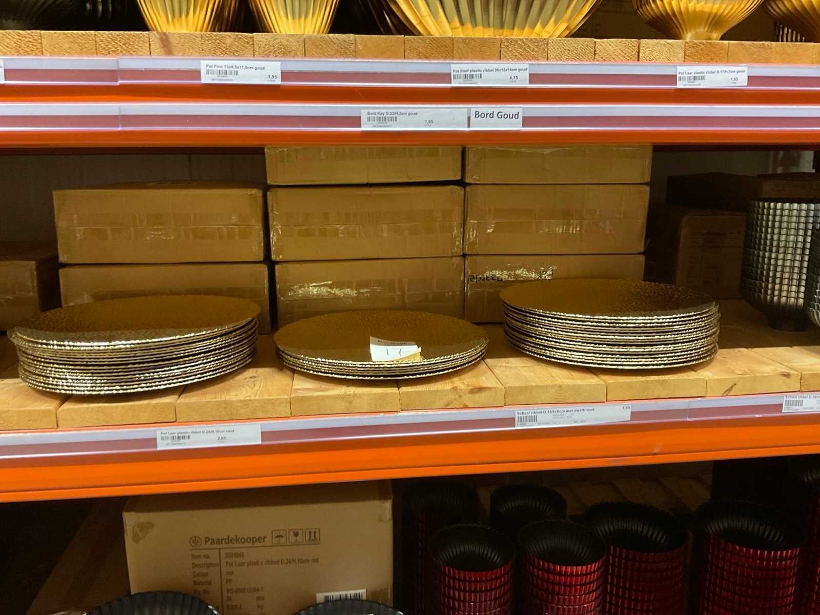 Bestaat uit inhoud van 1 stelling-sectie waaronder verschillende soorten/kleuren kunststof potten, kommen en schalen. Inclusief 3 pallets. Inclusief stelling