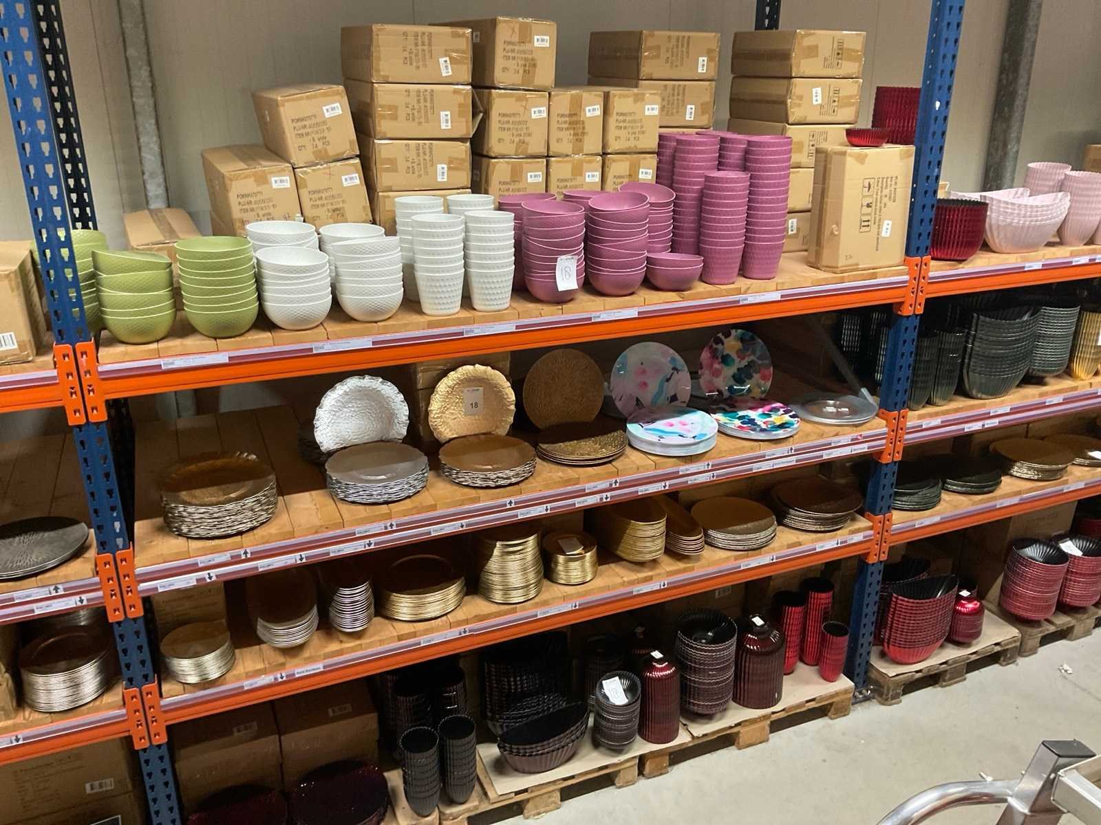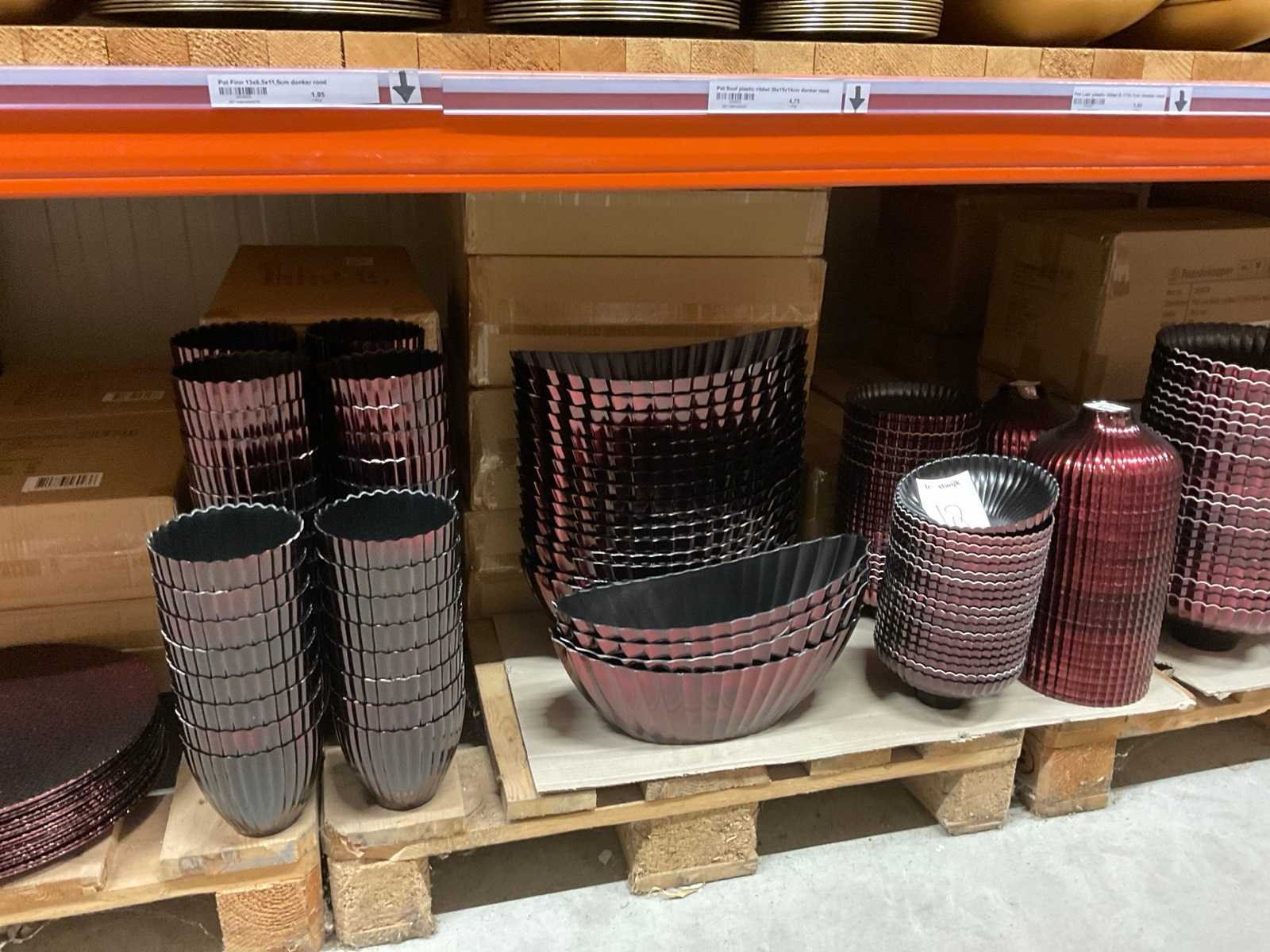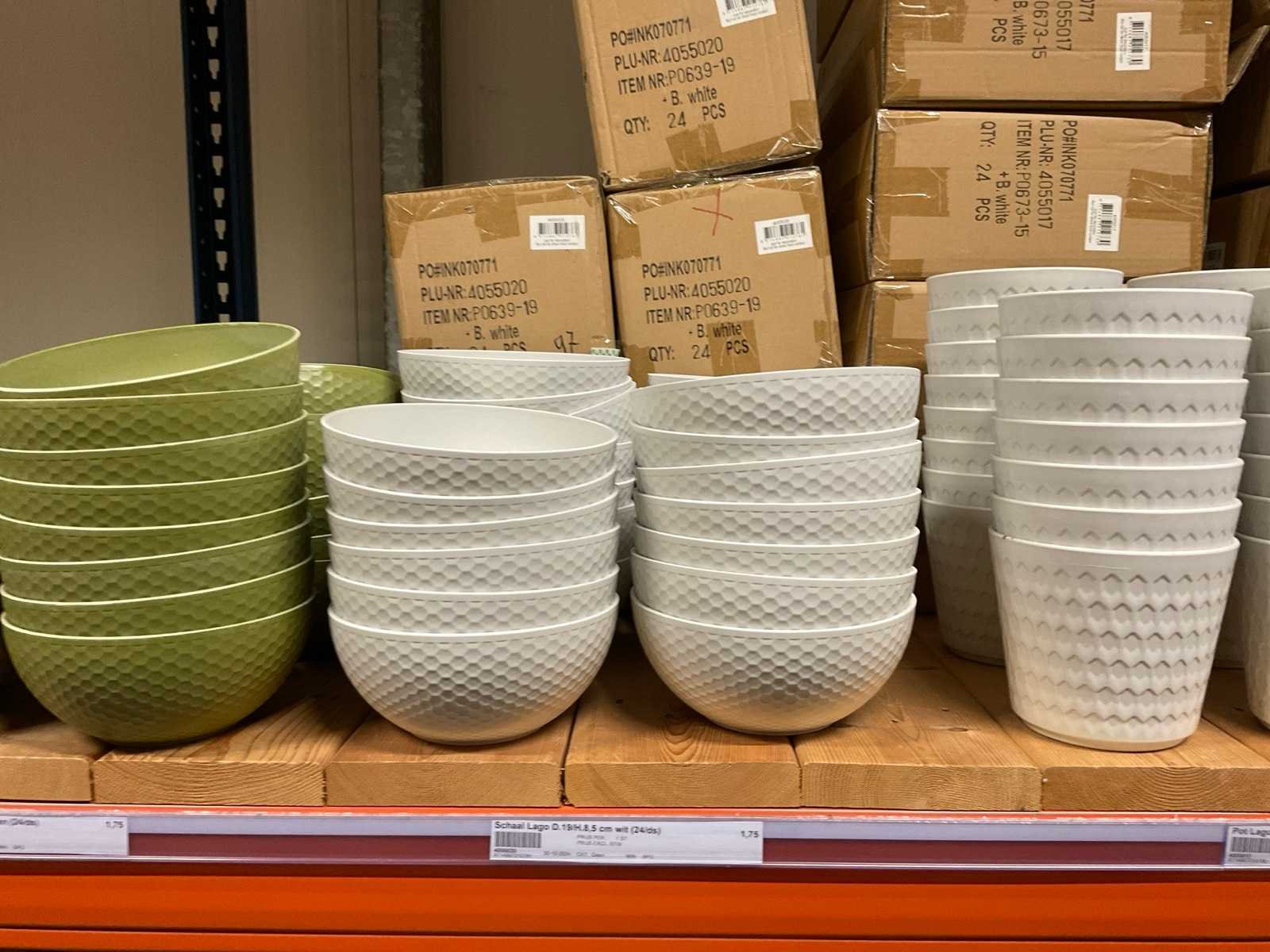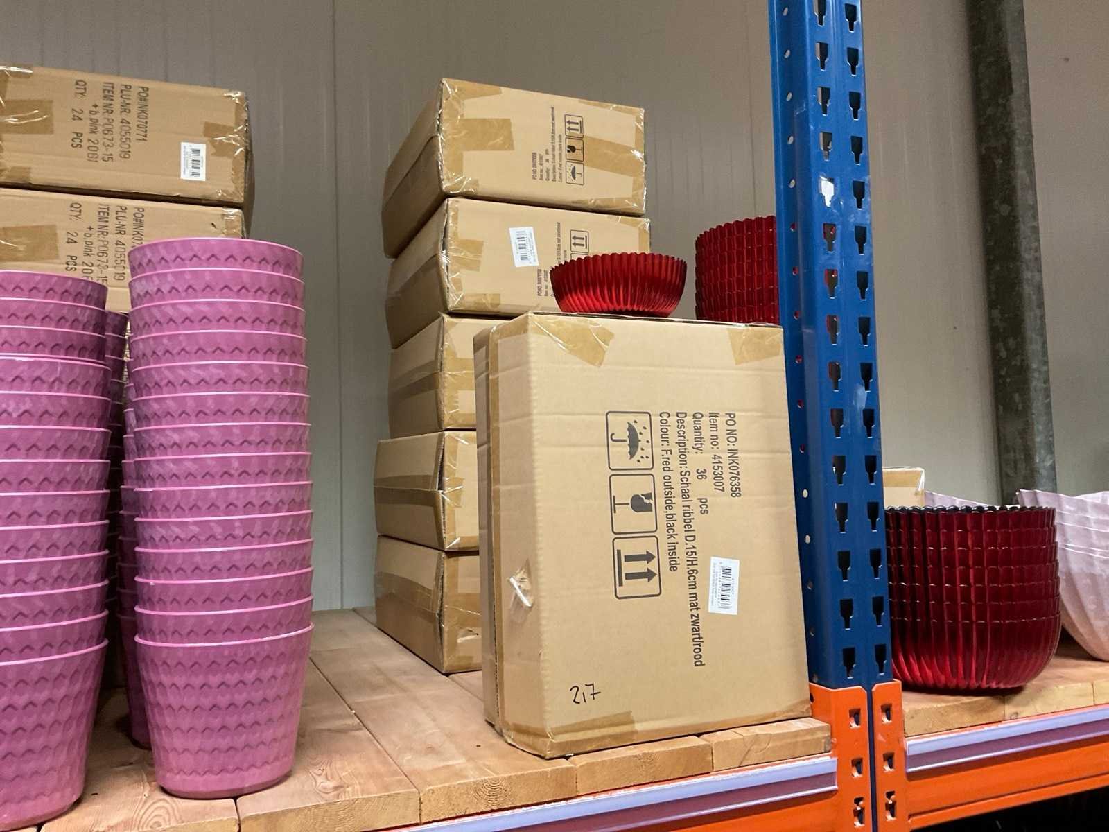 Bestaat uit inhoud van 1 stelling-sectie waaronder verschillende soorten/kleuren kunststof potten, kommen en schalen. Inclusief 3 pallets. Exclusief stelling
