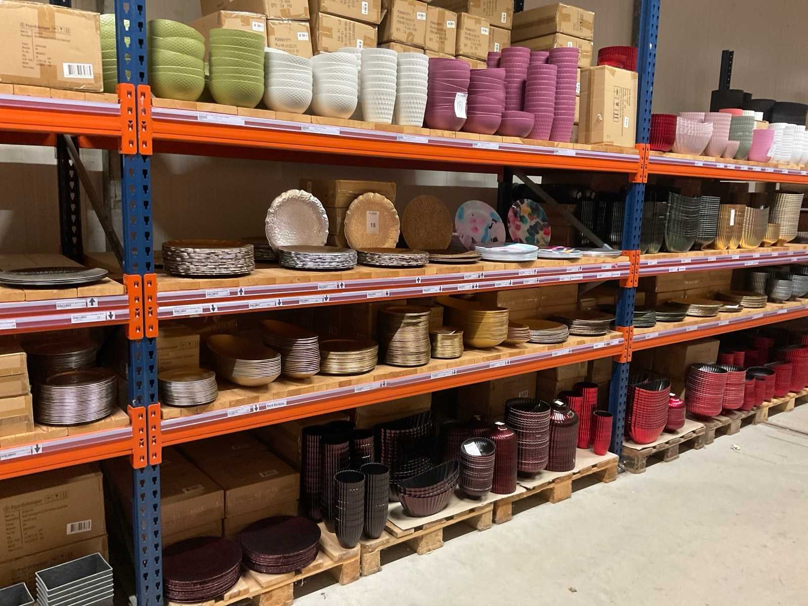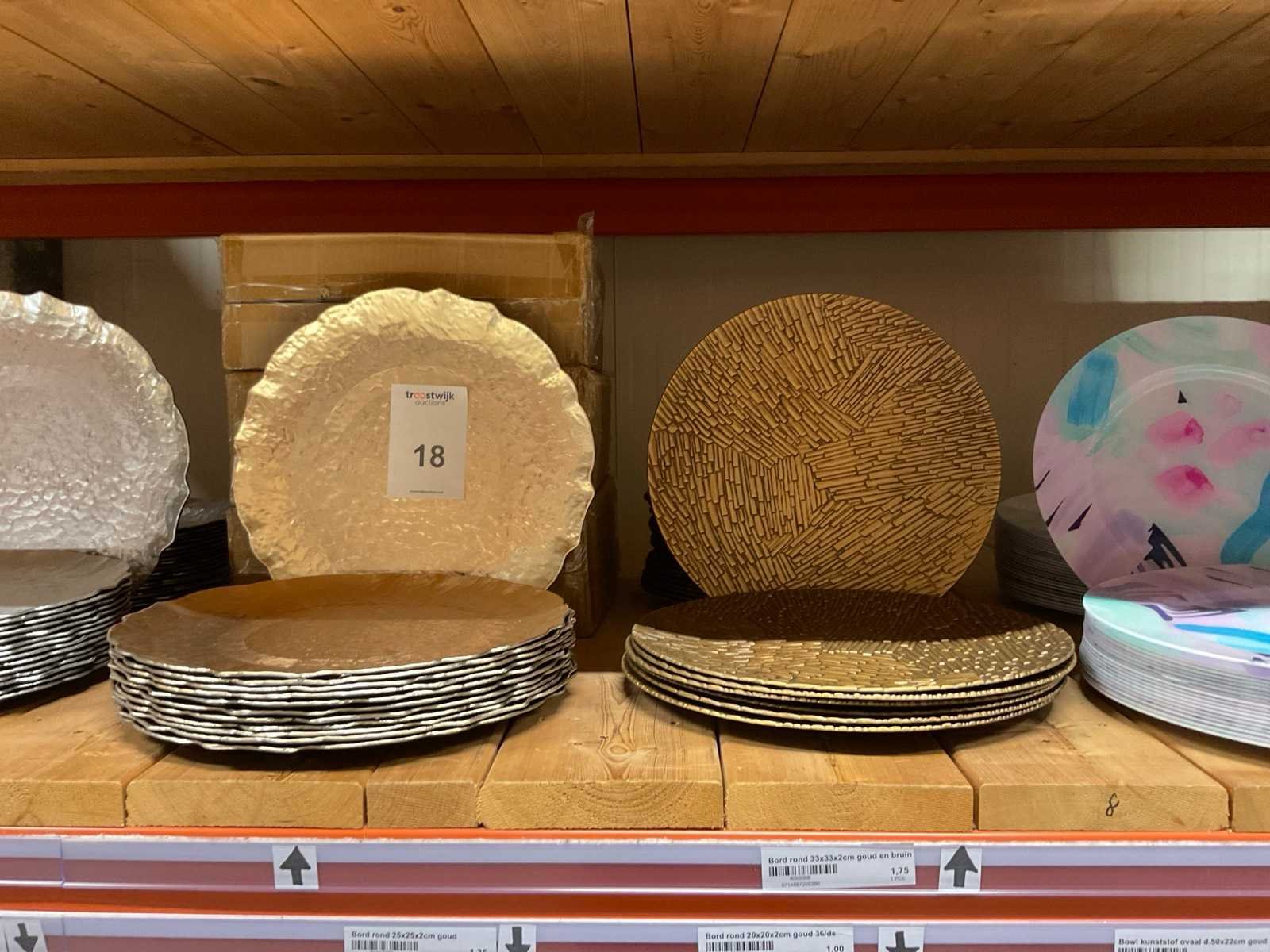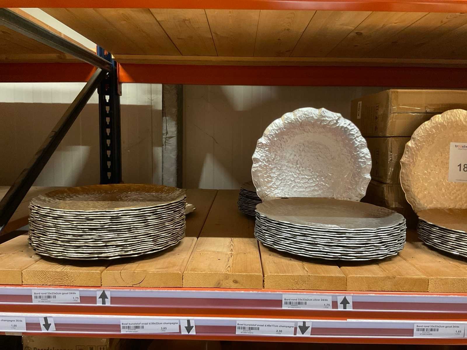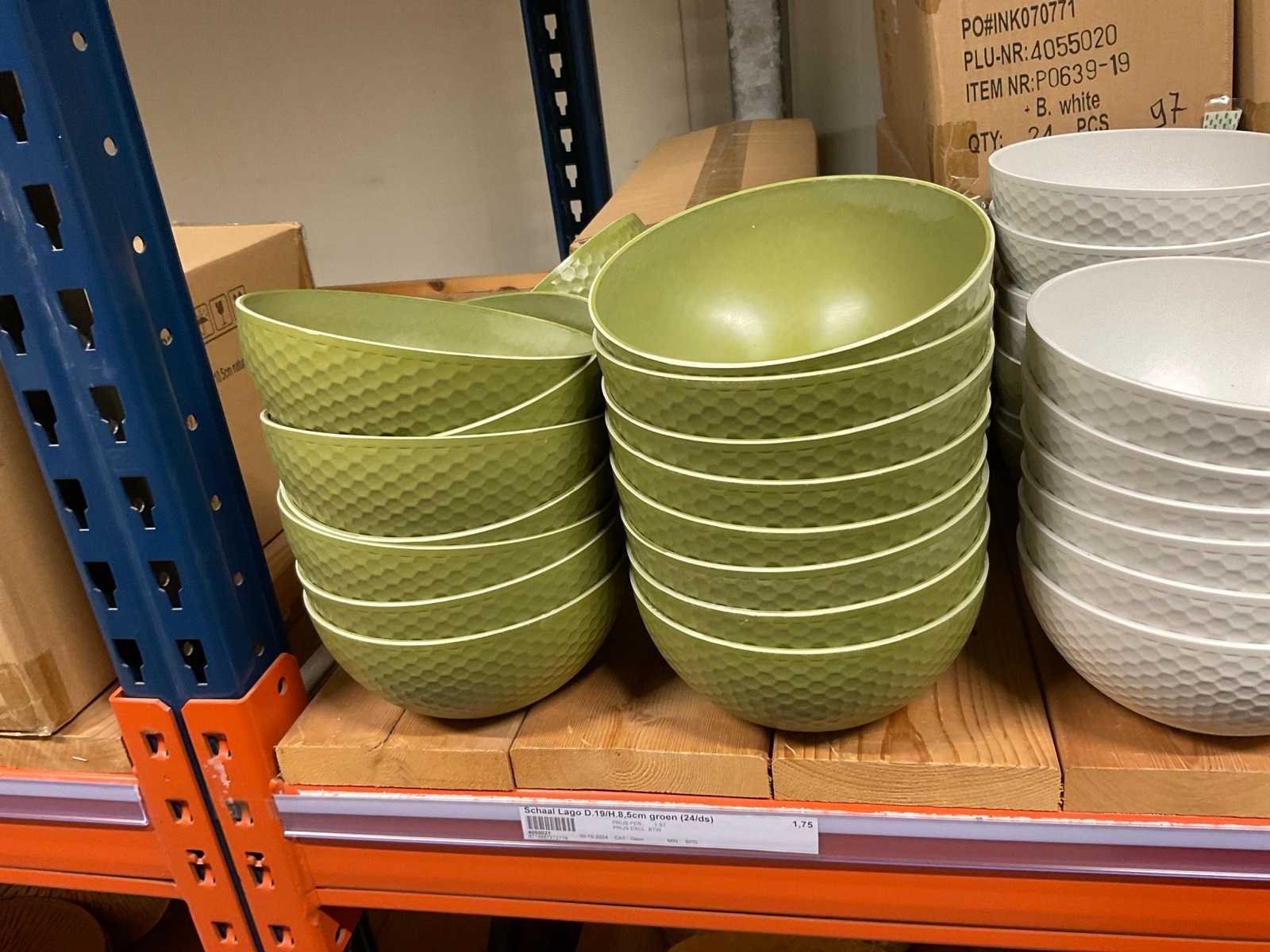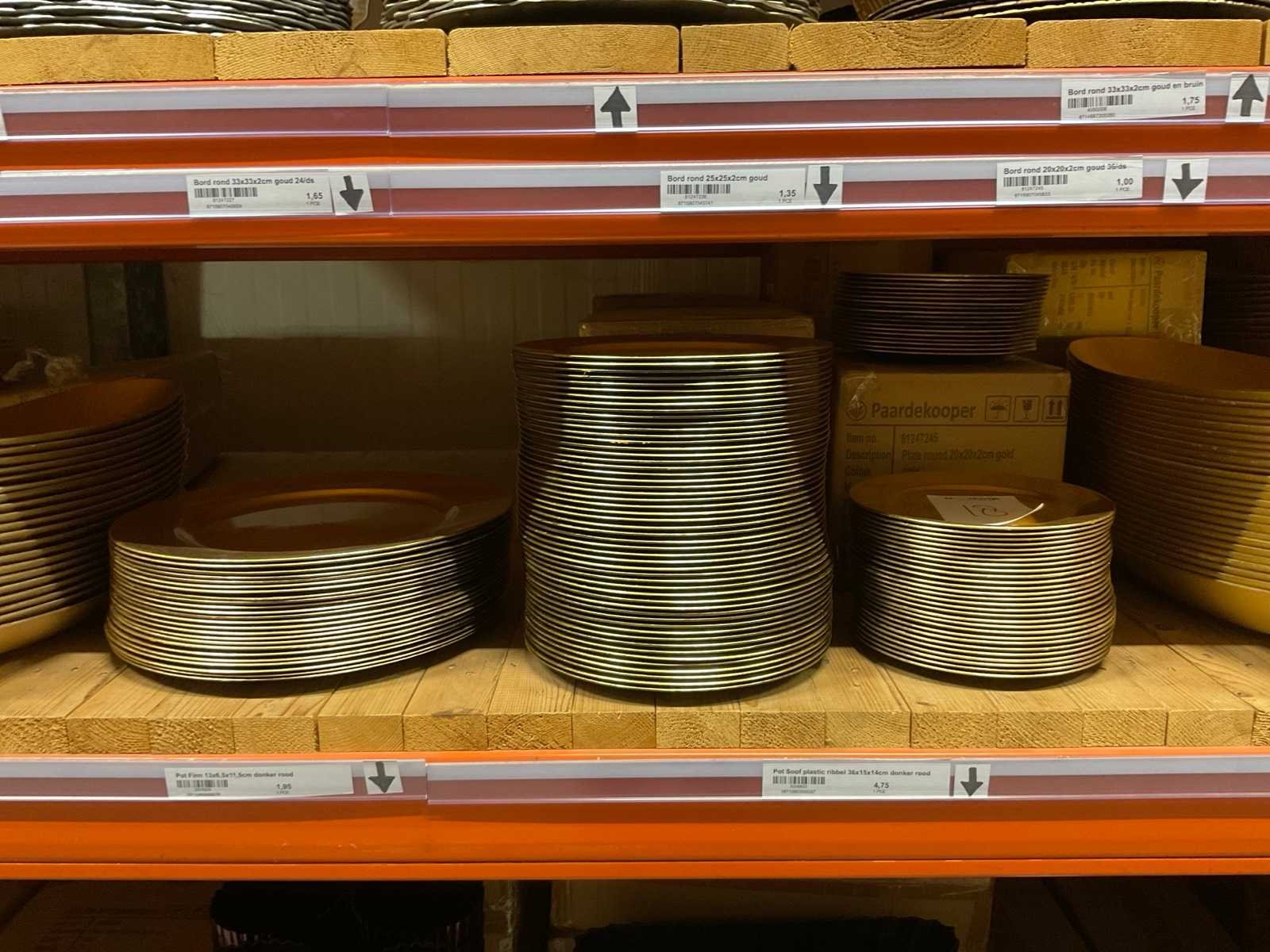 Bestaat uit inhoud van 1 stelling-sectie waaronder verschillende soorten/kleuren kunststof potten, kommen en schalen. Inclusief 3 pallets. Exclusief stelling