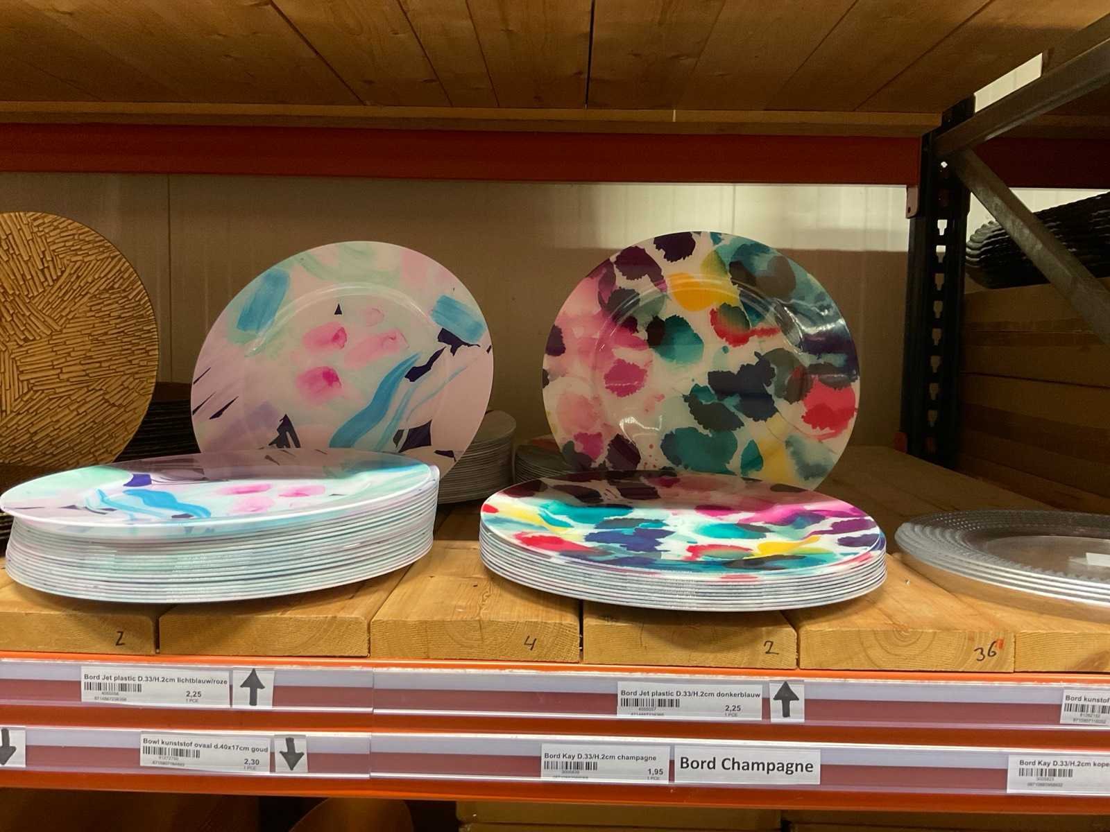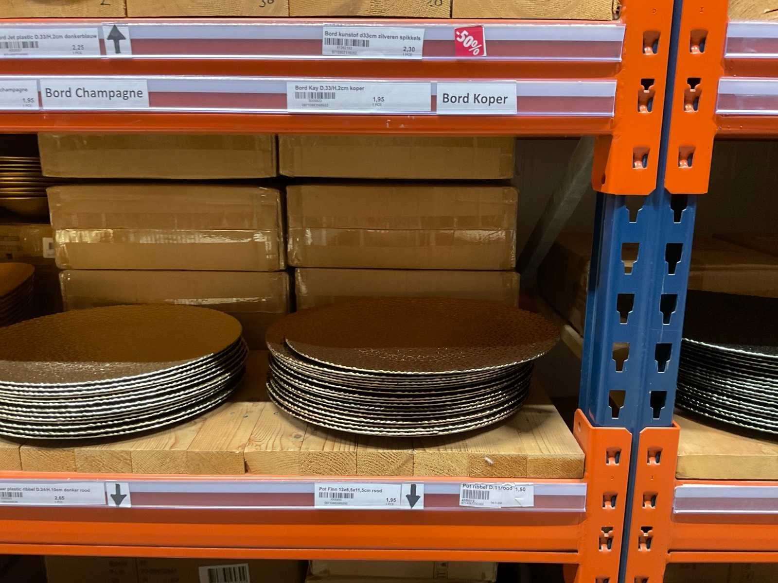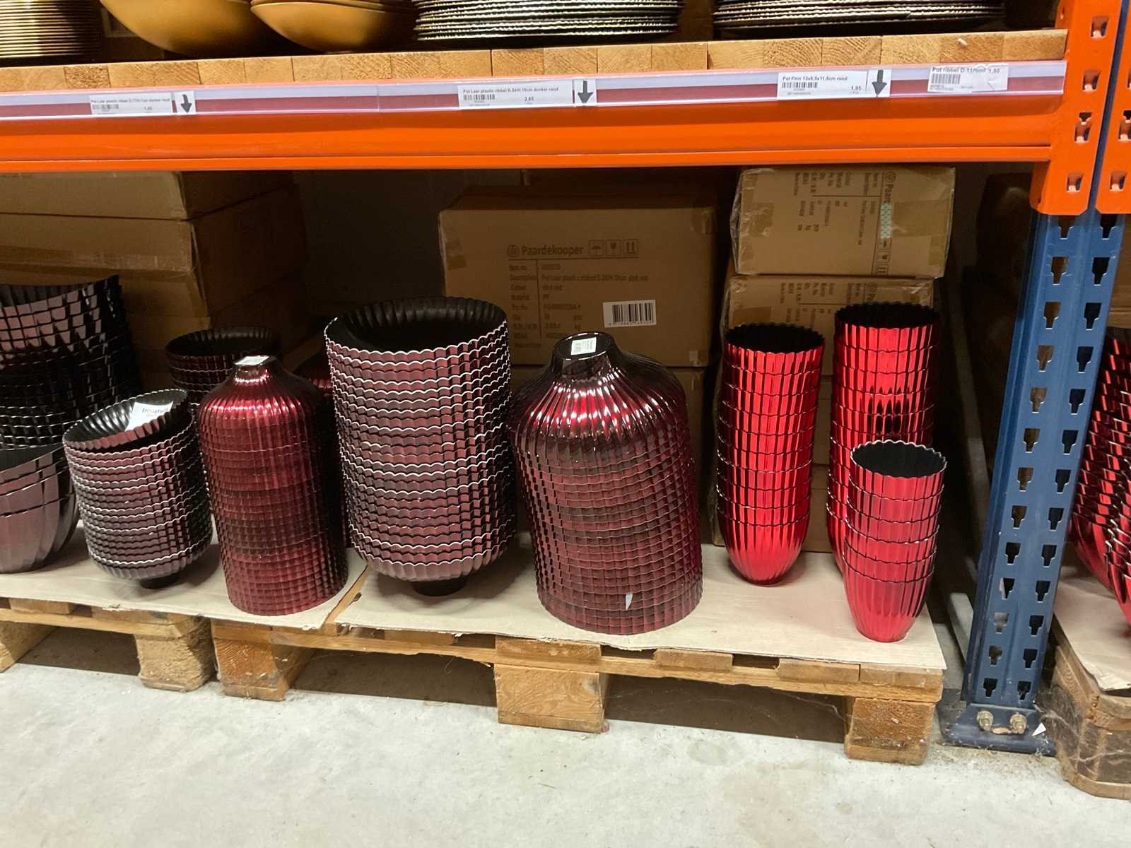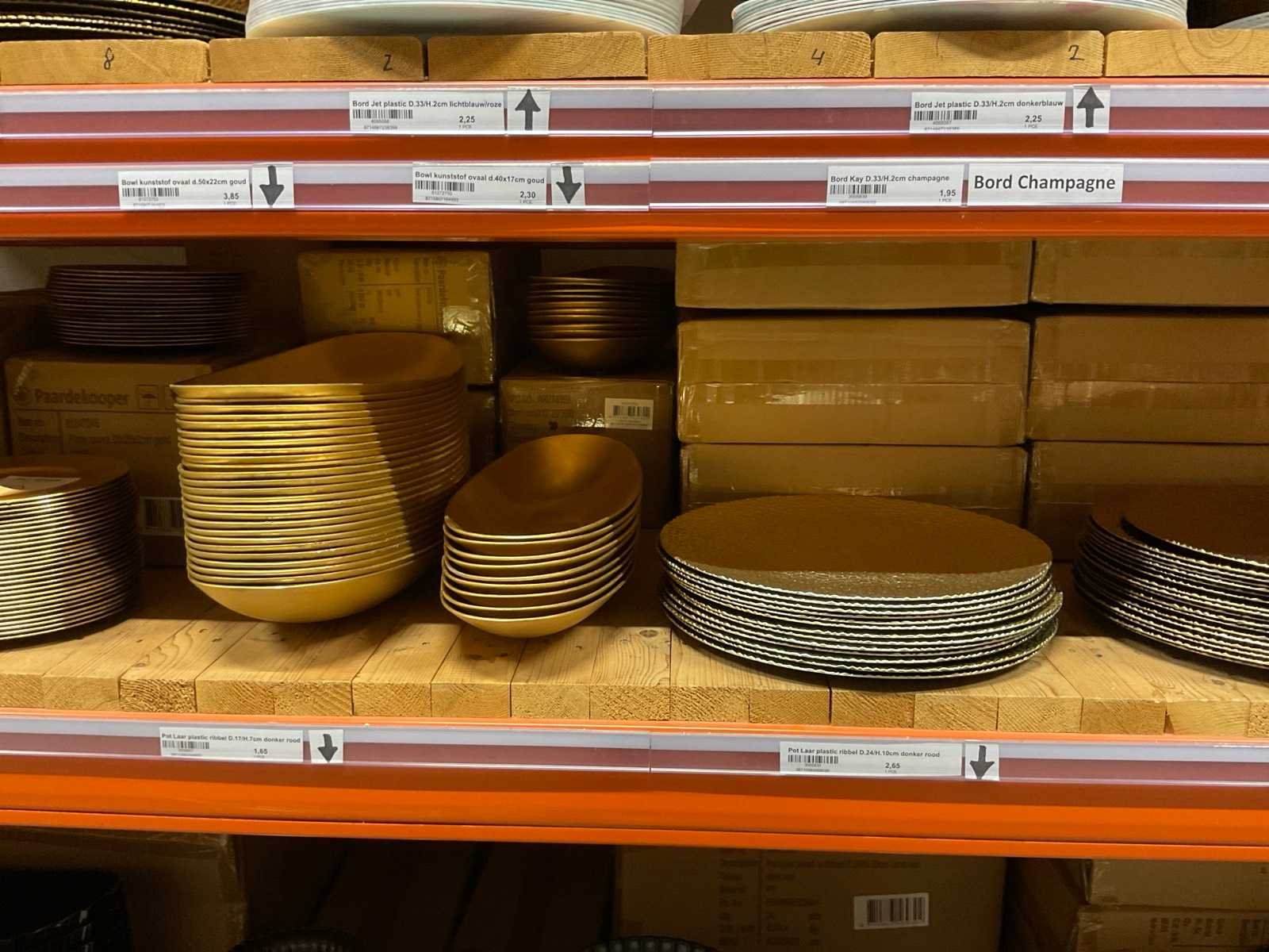 Bestaat uit inhoud van 1 stelling-sectie waaronder verschillende soorten/kleuren kunststof potten, kommen en schalen. Inclusief 3 pallets. Exclusief stelling