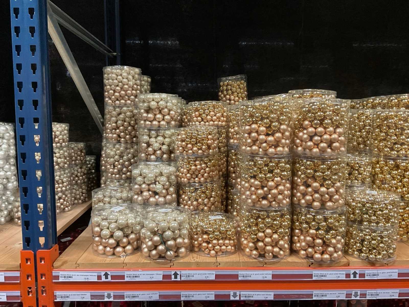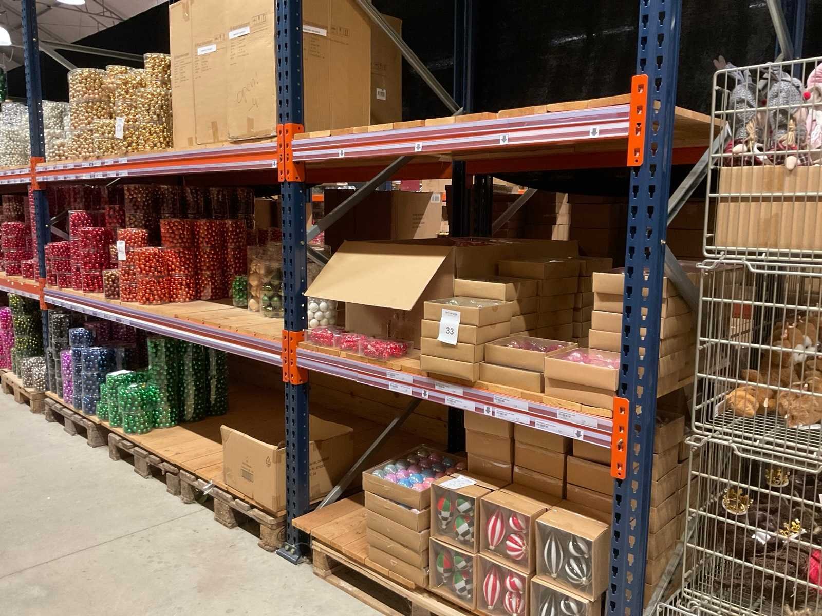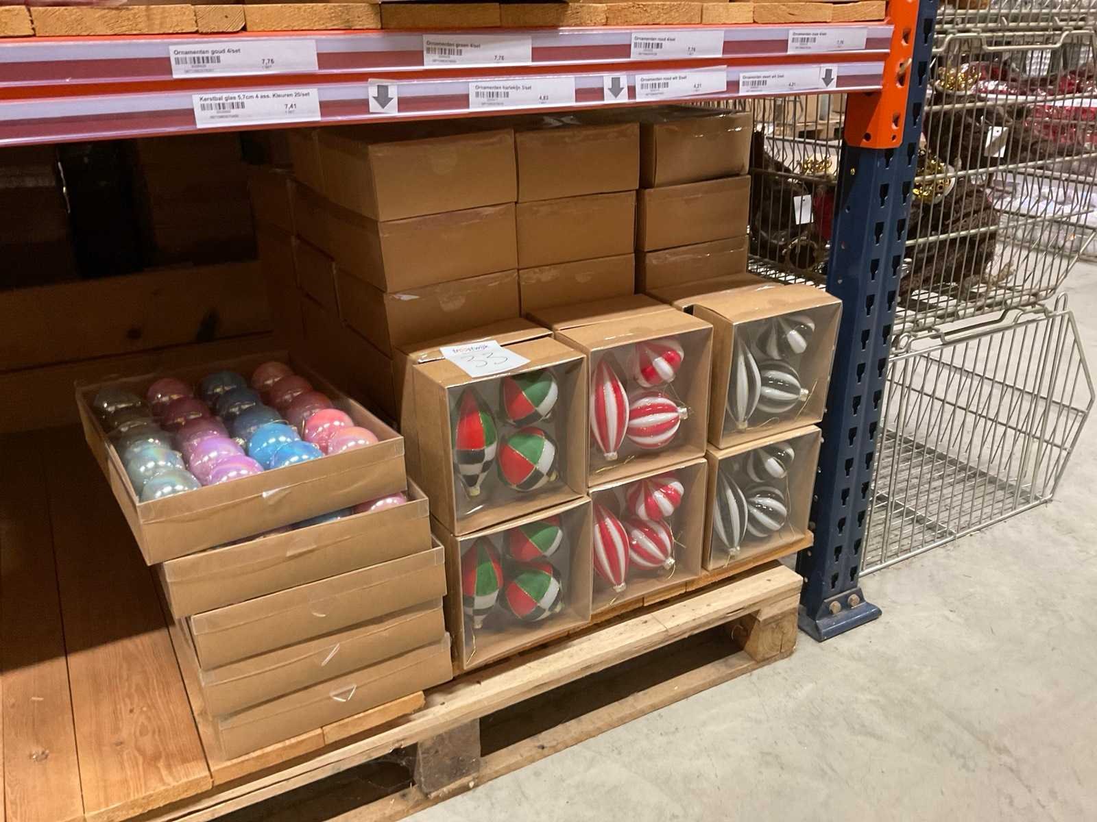 Verschillende soorten/kleuren kerstballen. Bestaat uit inhoud van 2 stelling-secties. Inclusief 4 pallets
