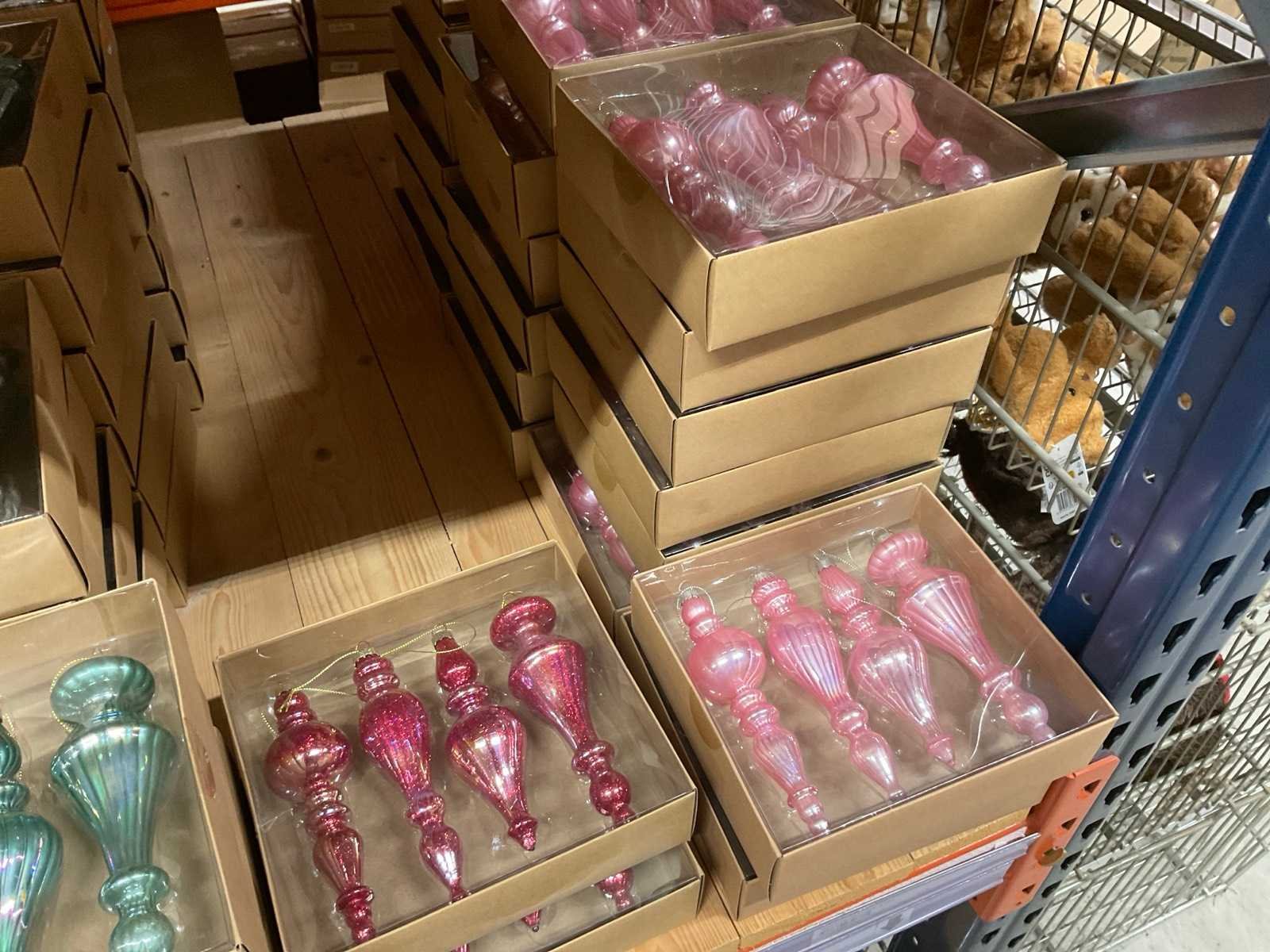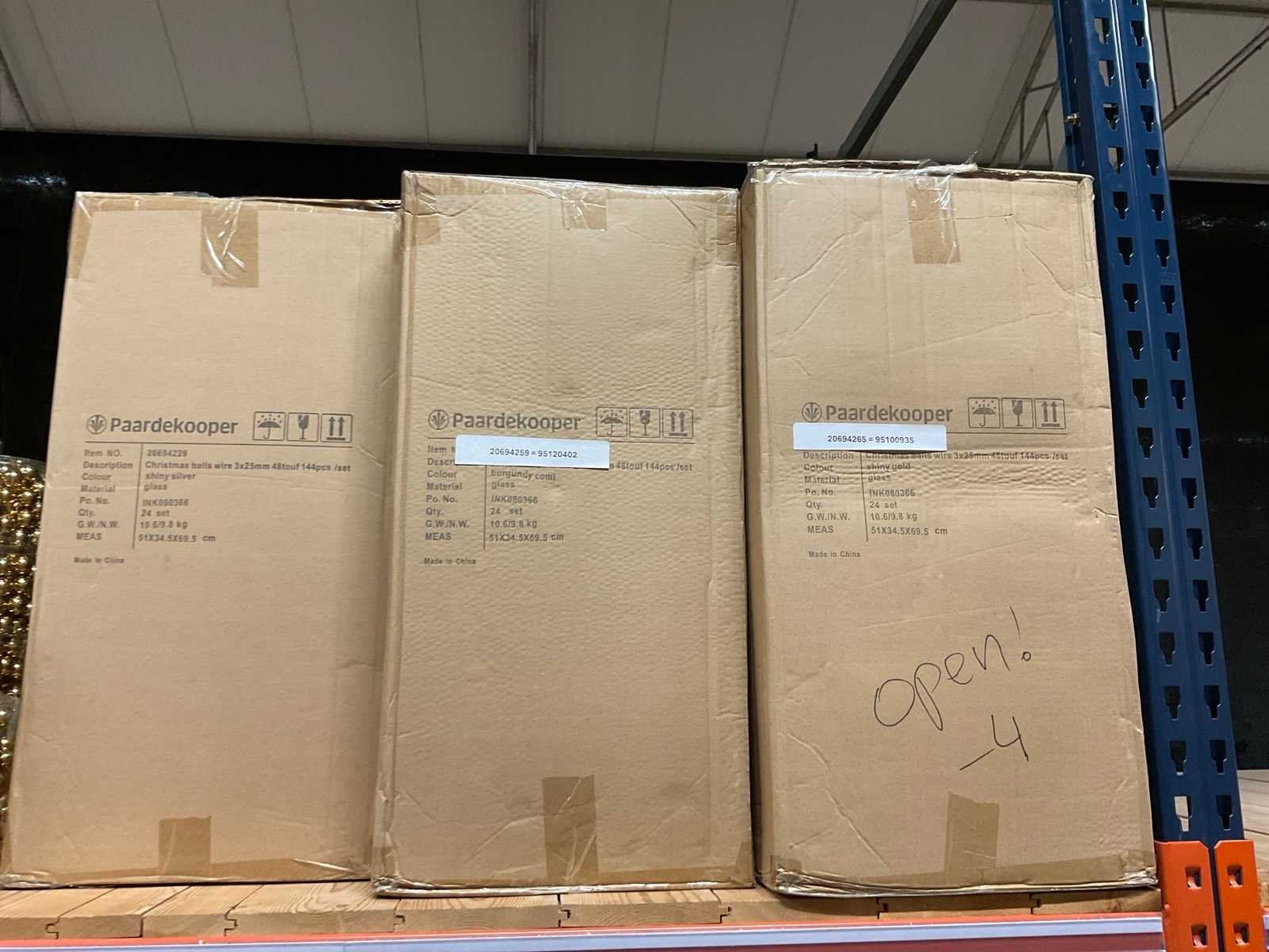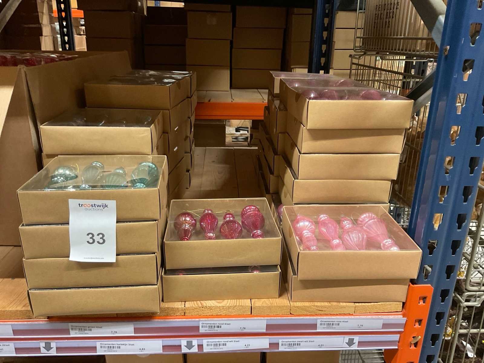 Verschillende soorten/kleuren kerstballen. Bestaat uit inhoud van 2 stelling-secties. Inclusief 4 pallets