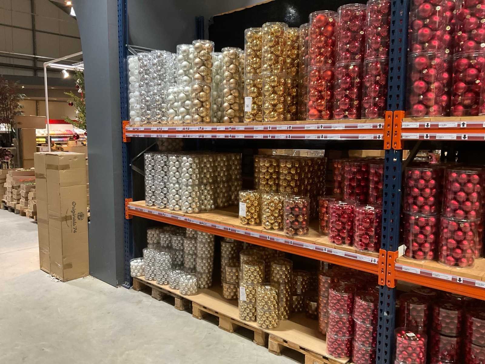 Verschillende soorten/kleuren kerstballen. Bestaat uit inhoud van 1 stelling-secties. Inclusief 3 pallets