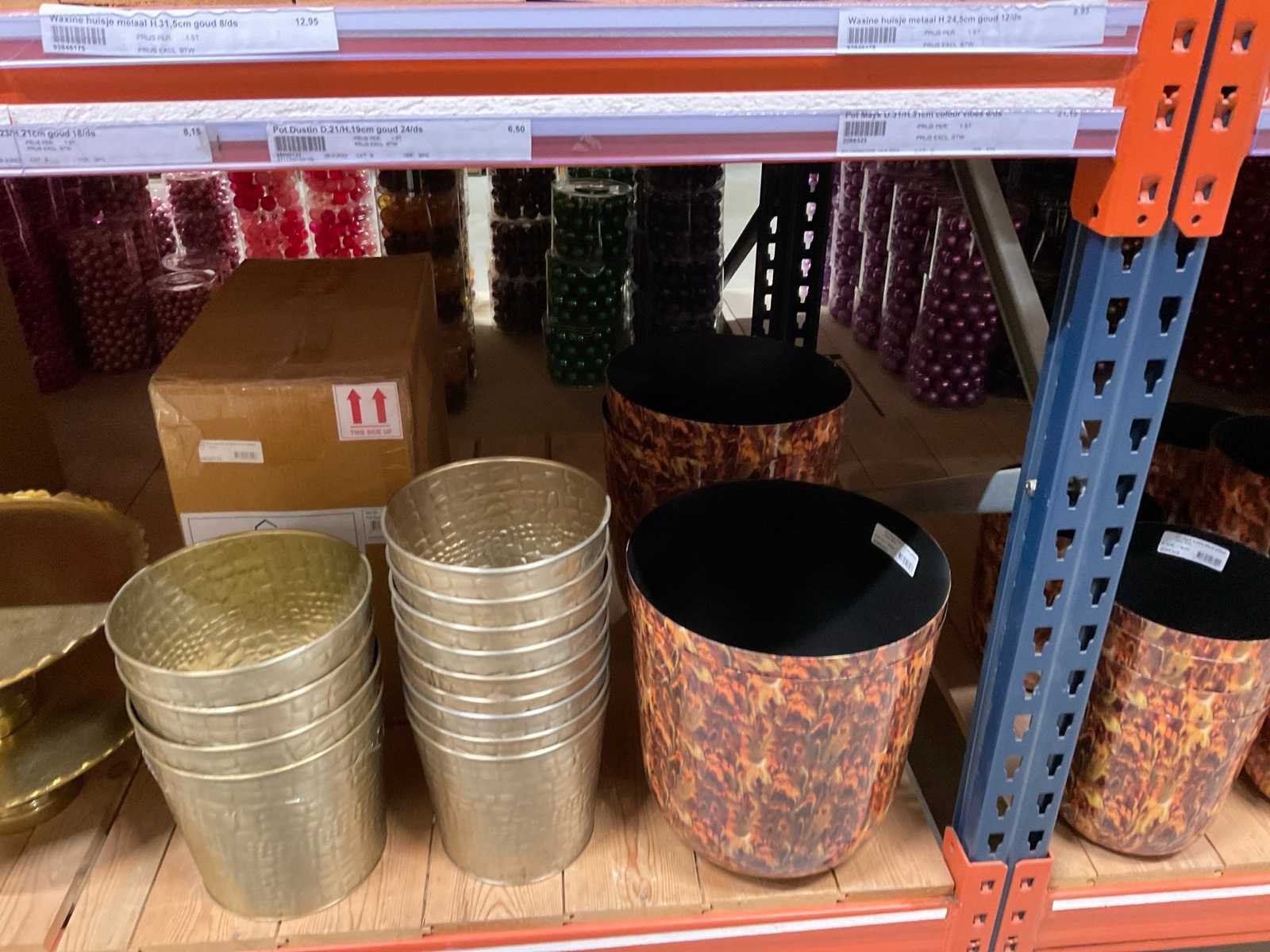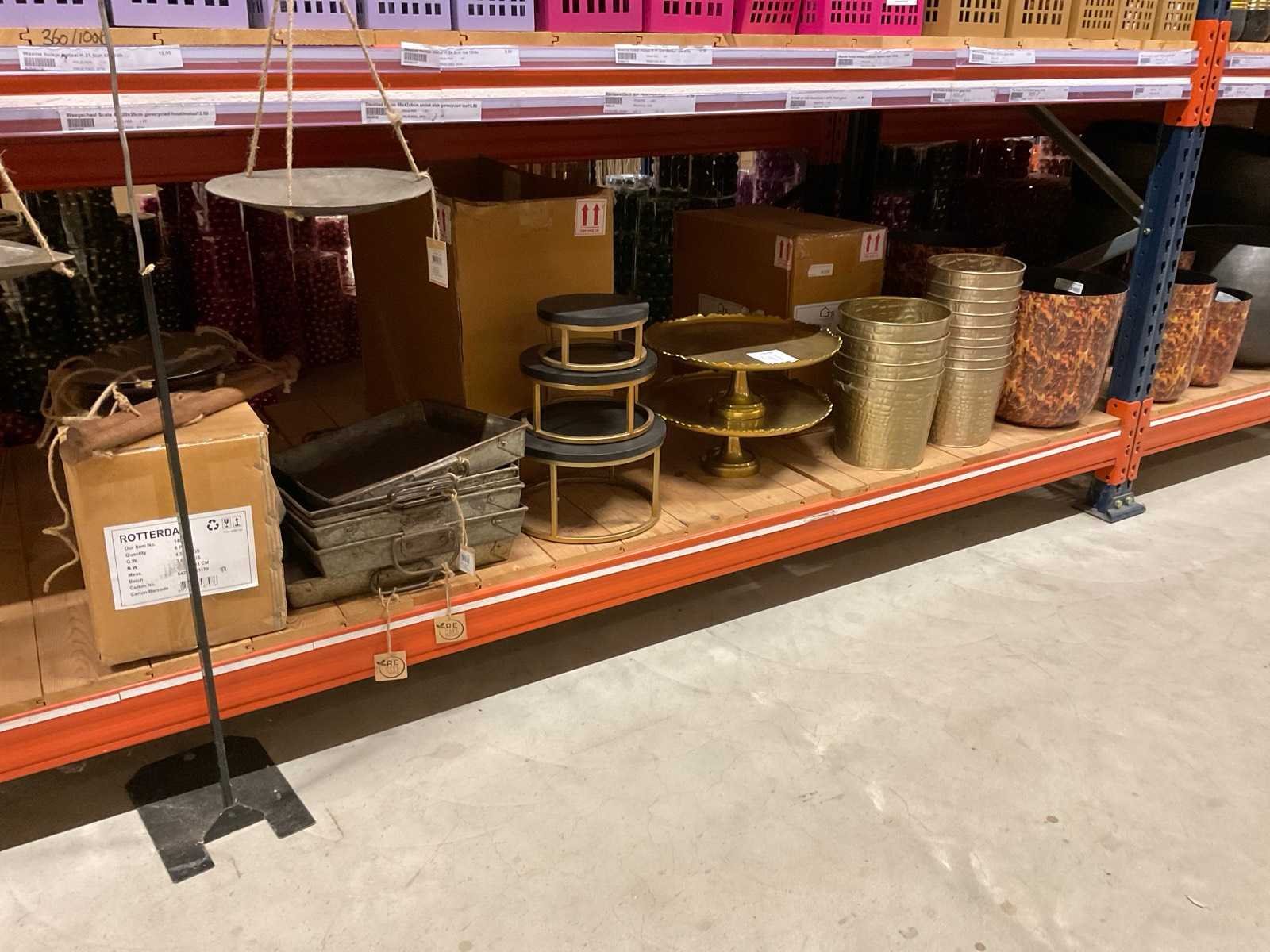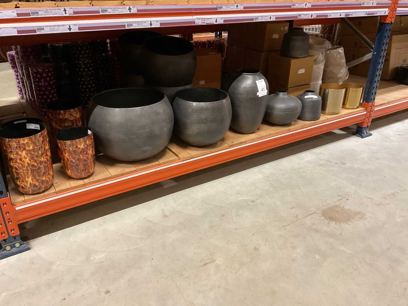 Diverse soorten potten, vazen en schalen. Bestaat uit onderste legplanken van 2 stelling-secties