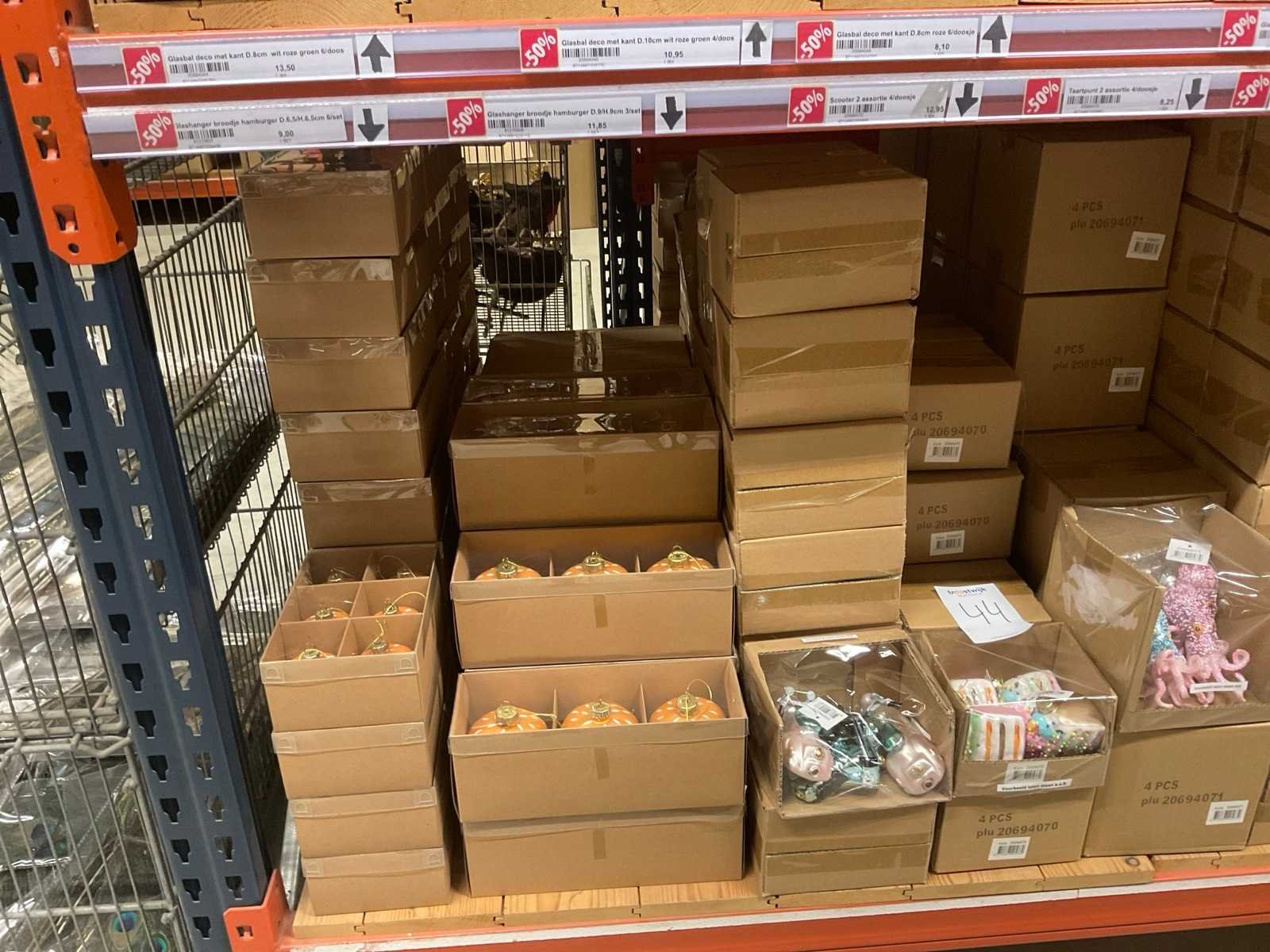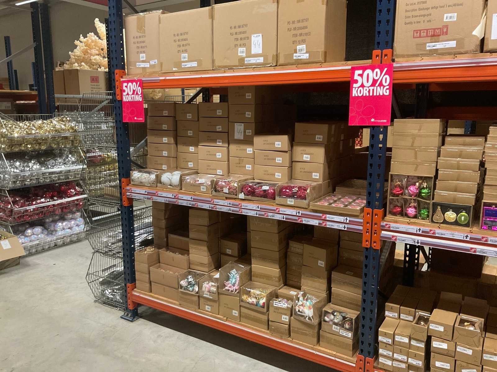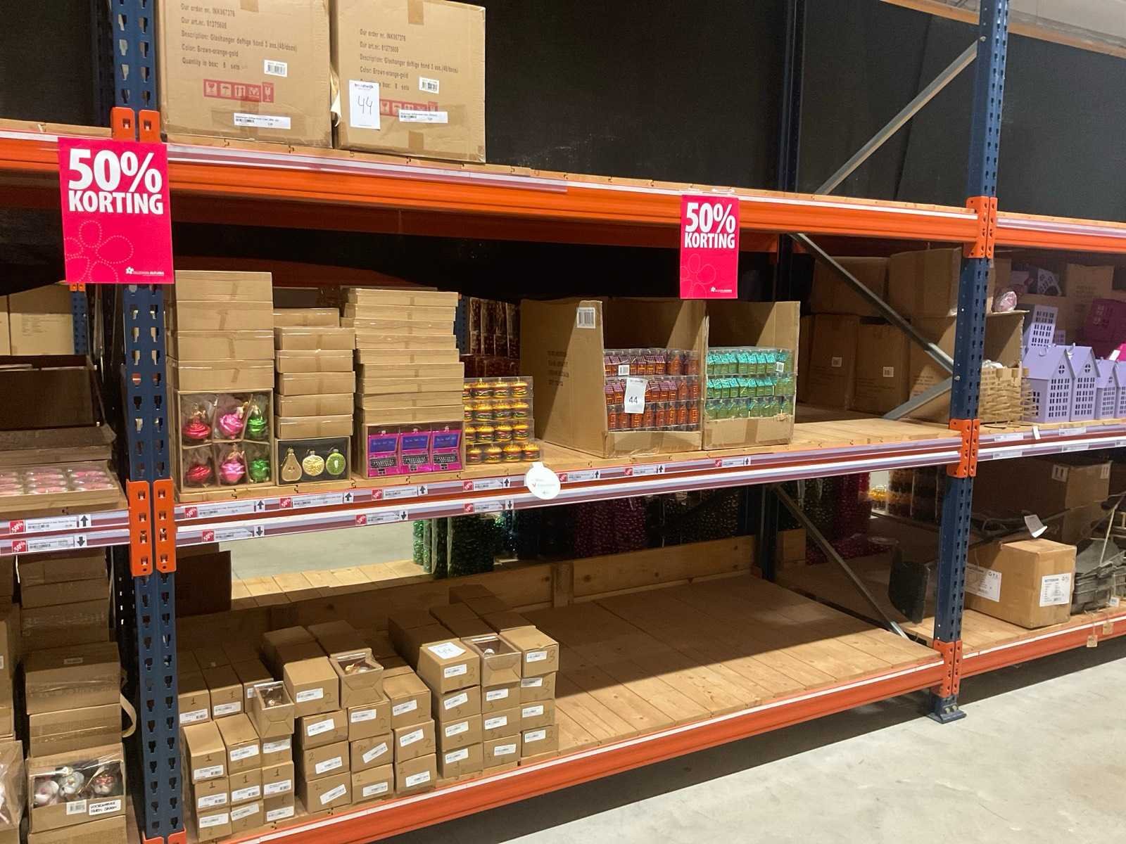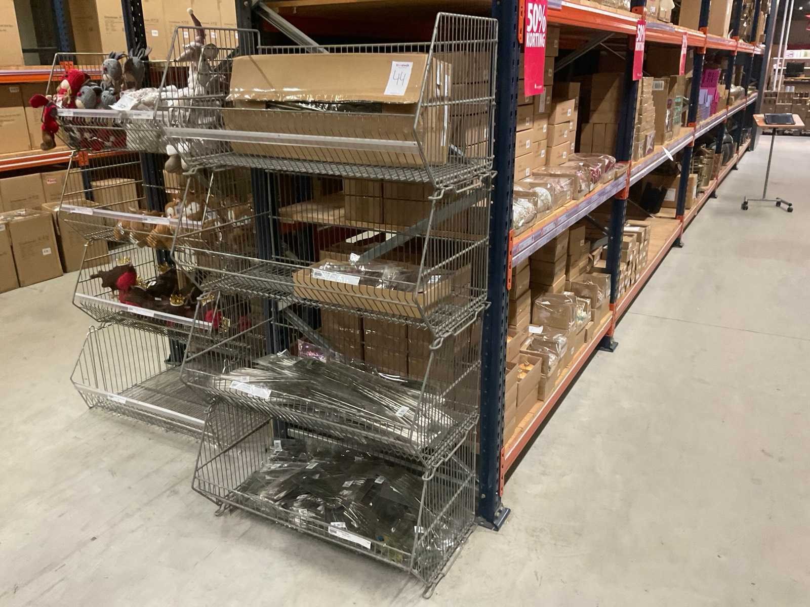 Verschillende soorten kerst-ornamenten. Bestaande uit inhoud van 2 stelling-secties en inhoud metalen rek.