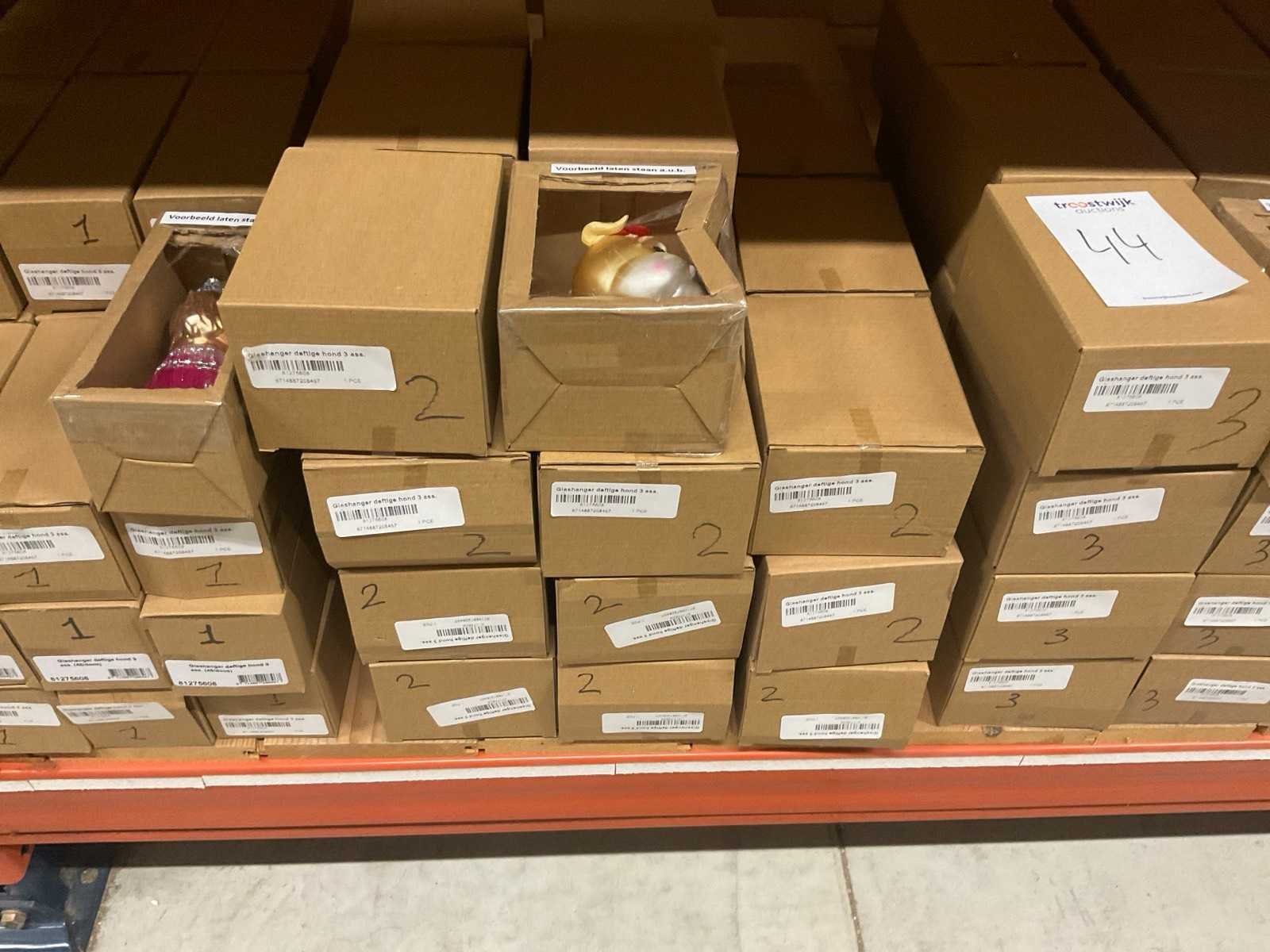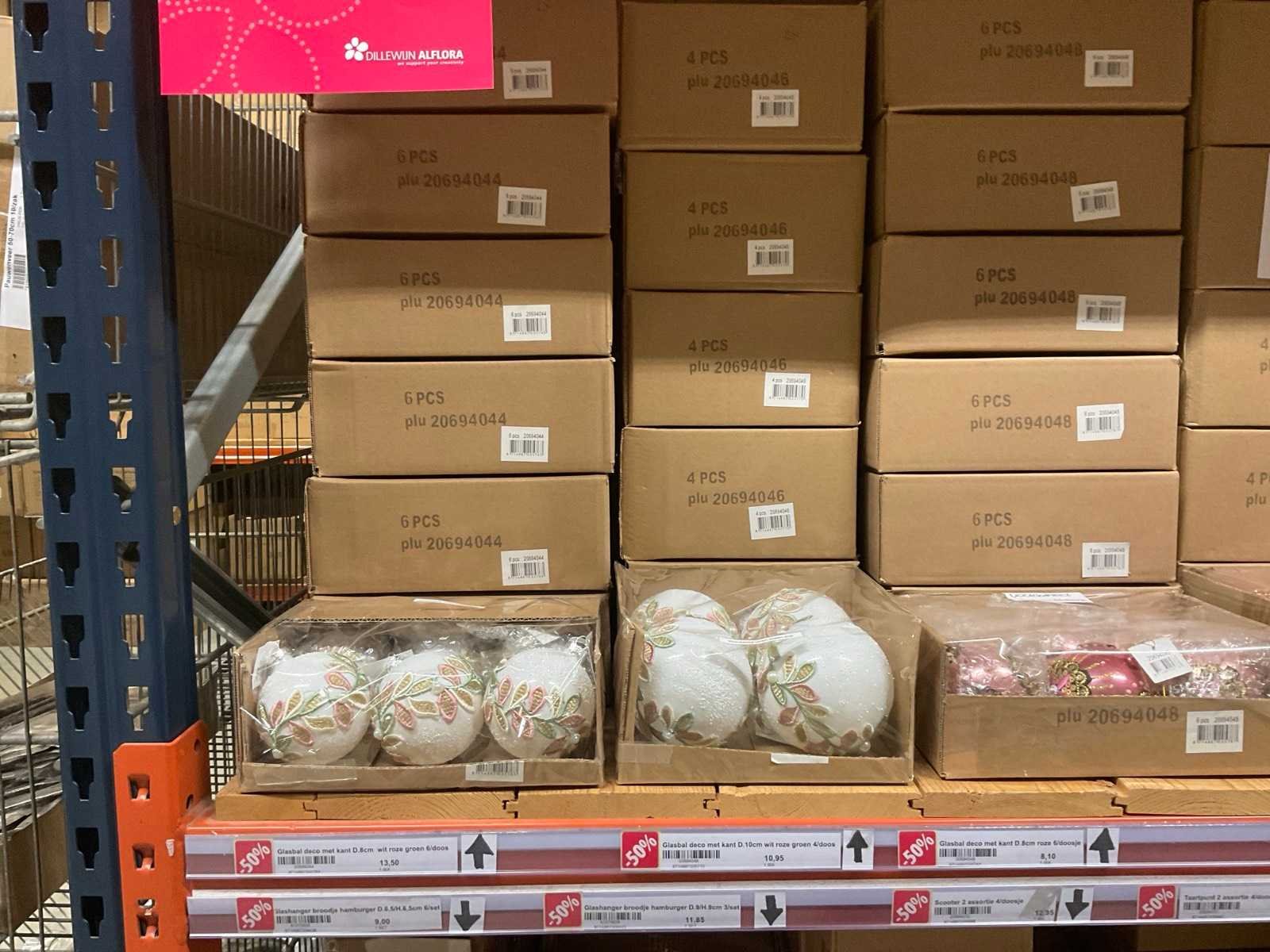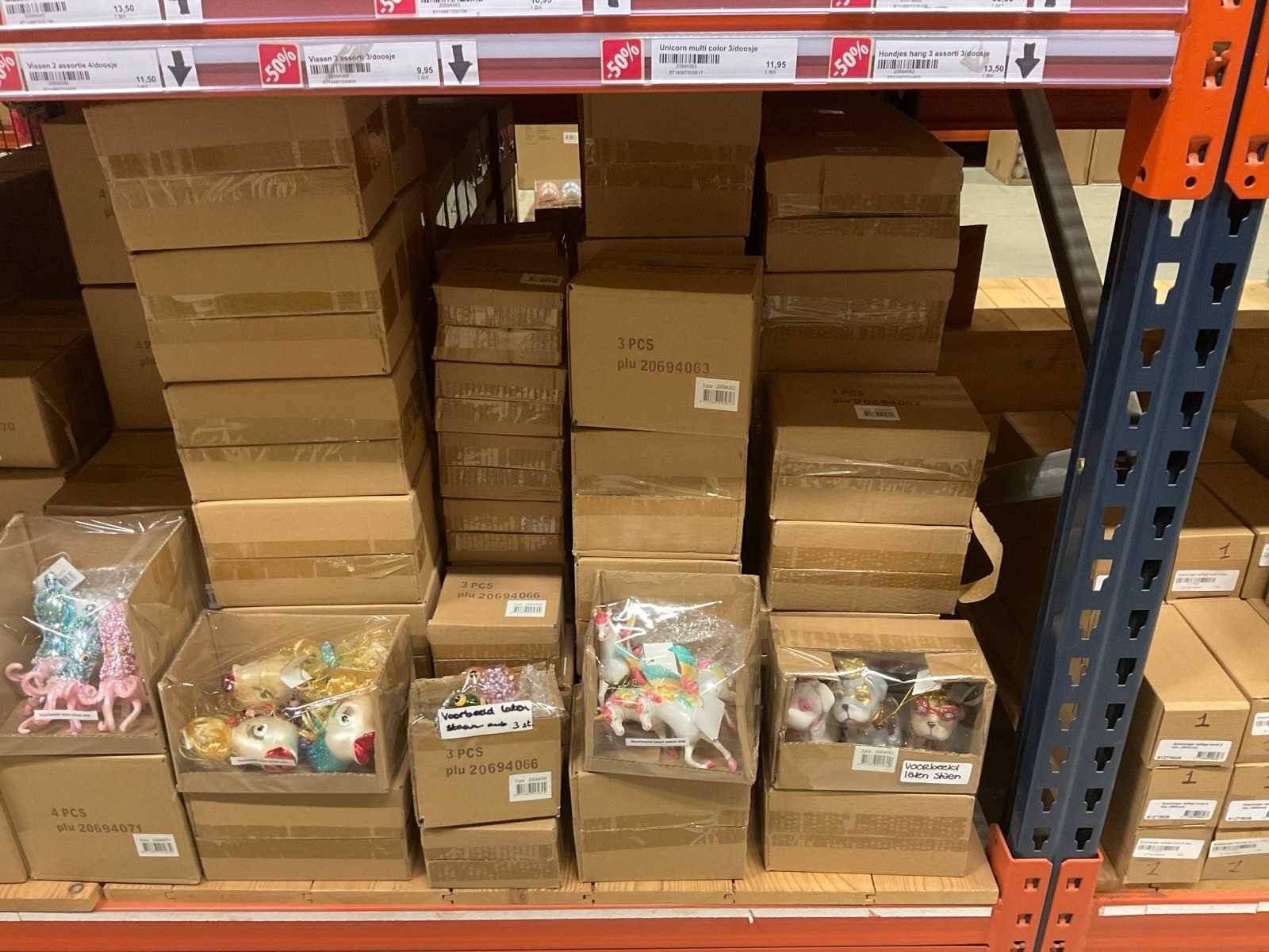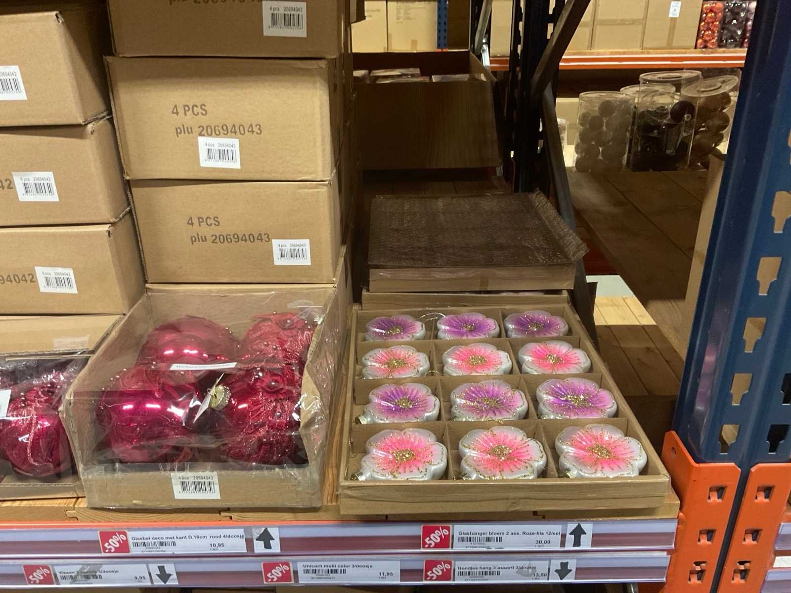 Verschillende soorten kerst-ornamenten. Bestaande uit inhoud van 2 stelling-secties en inhoud metalen rek.