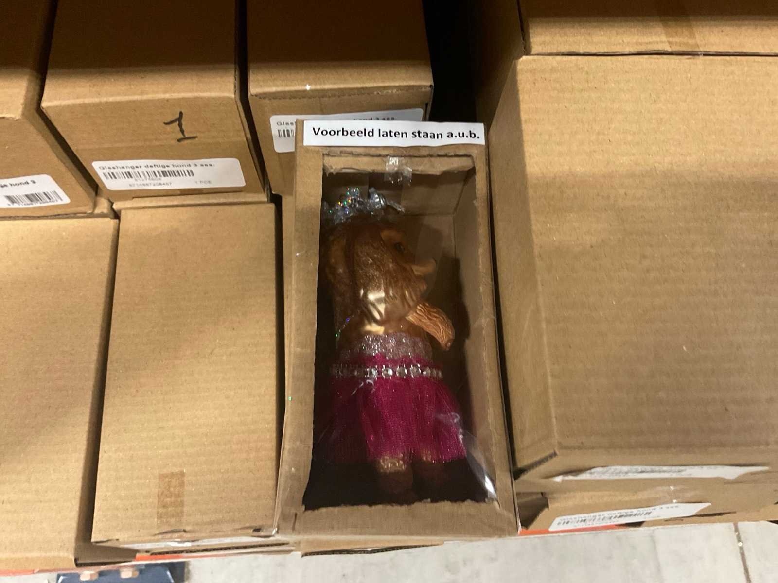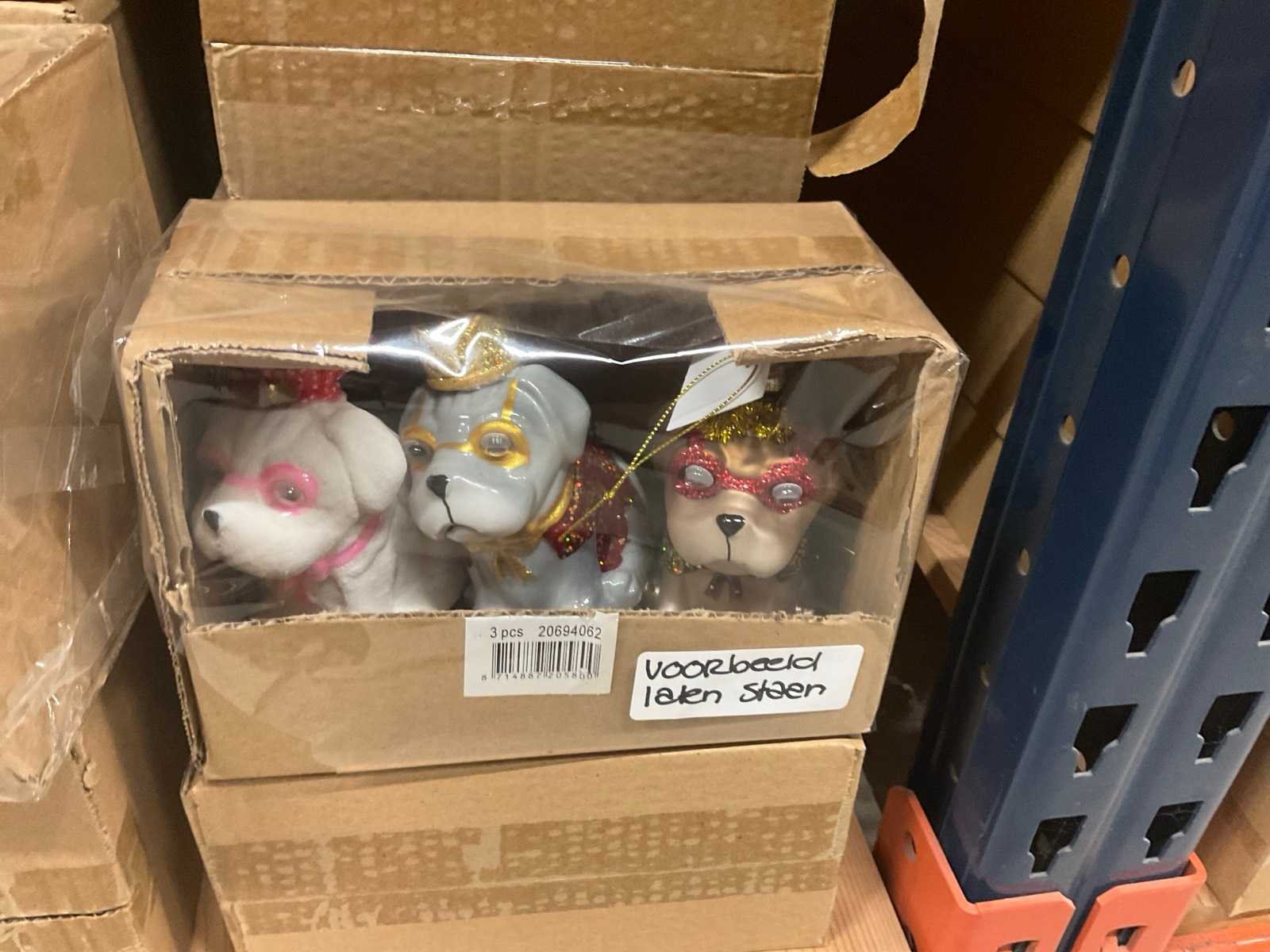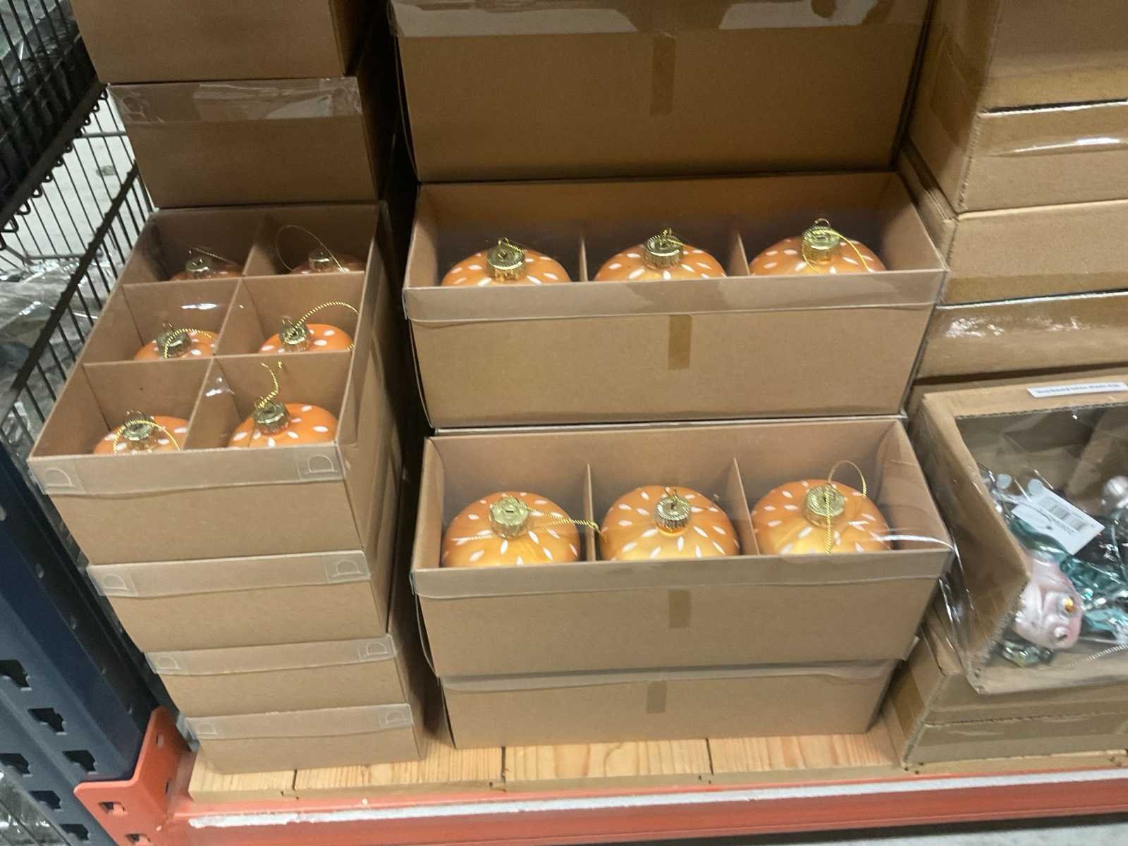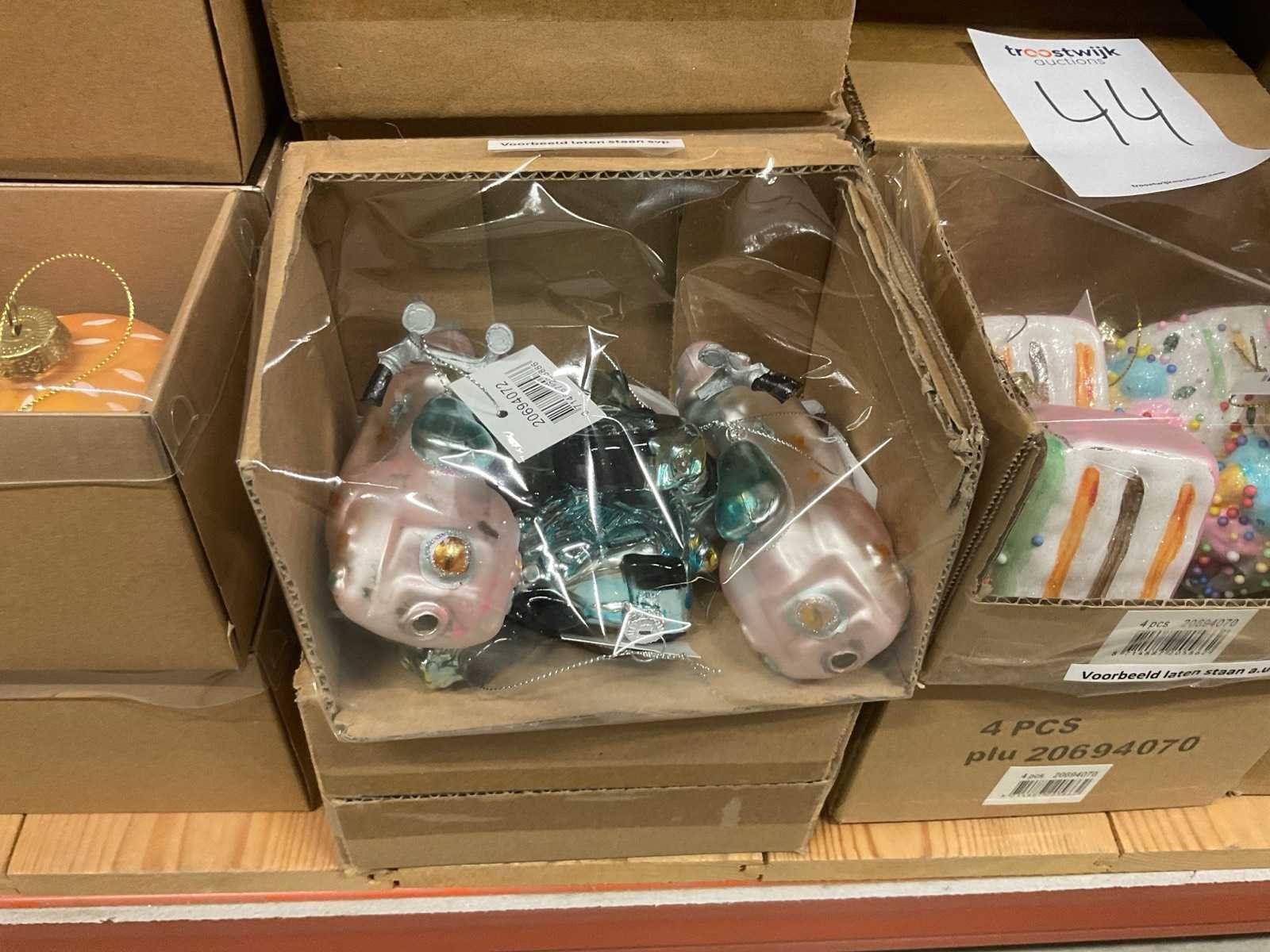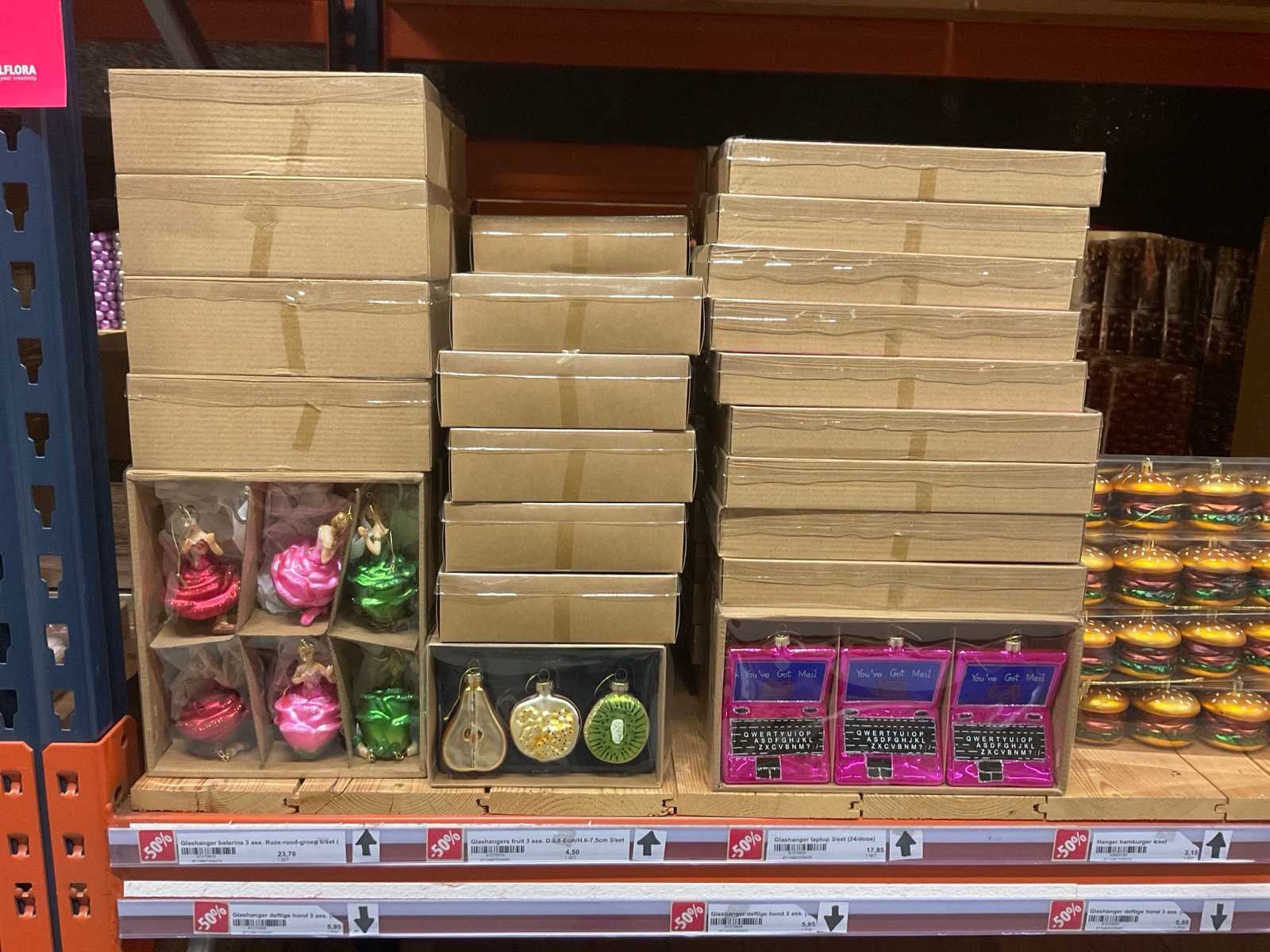 Verschillende soorten kerst-ornamenten. Bestaande uit inhoud van 2 stelling-secties en inhoud metalen rek.