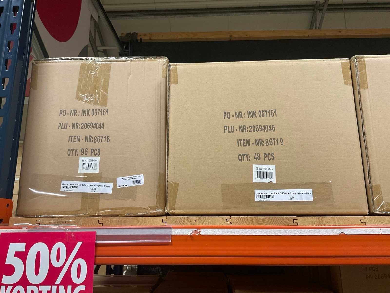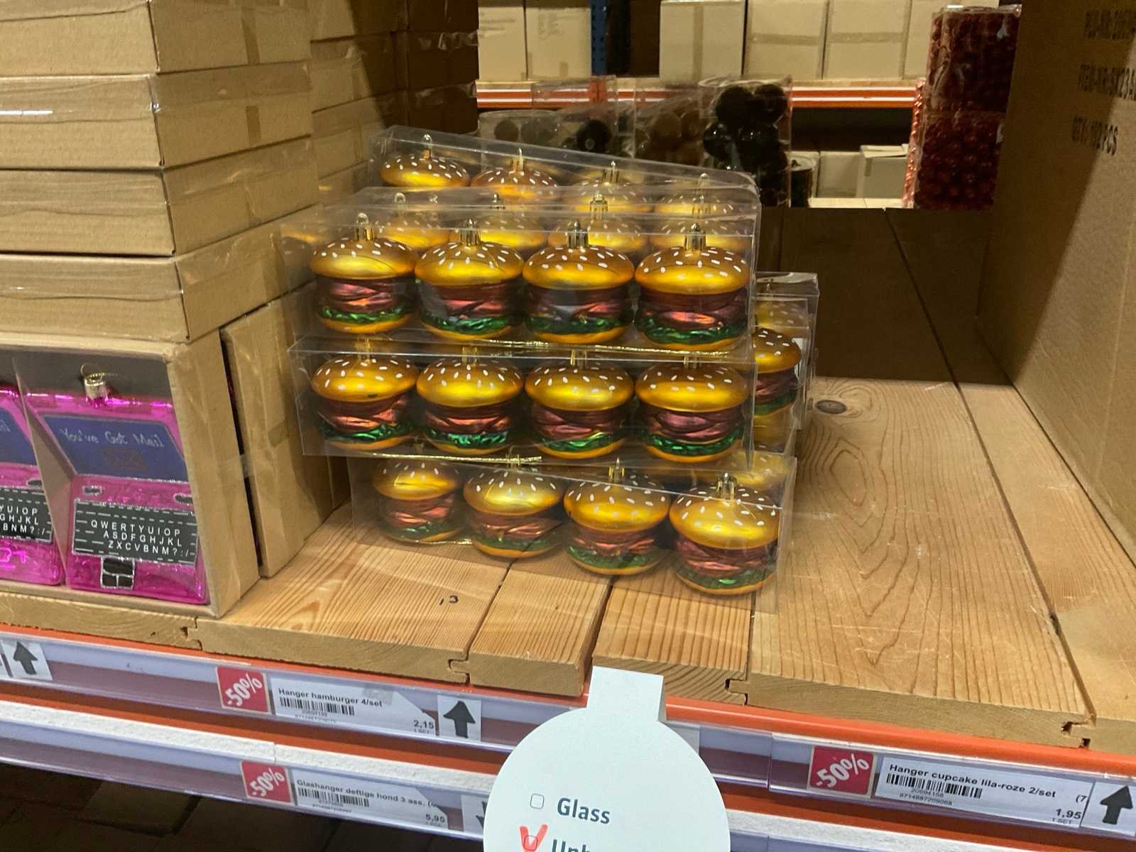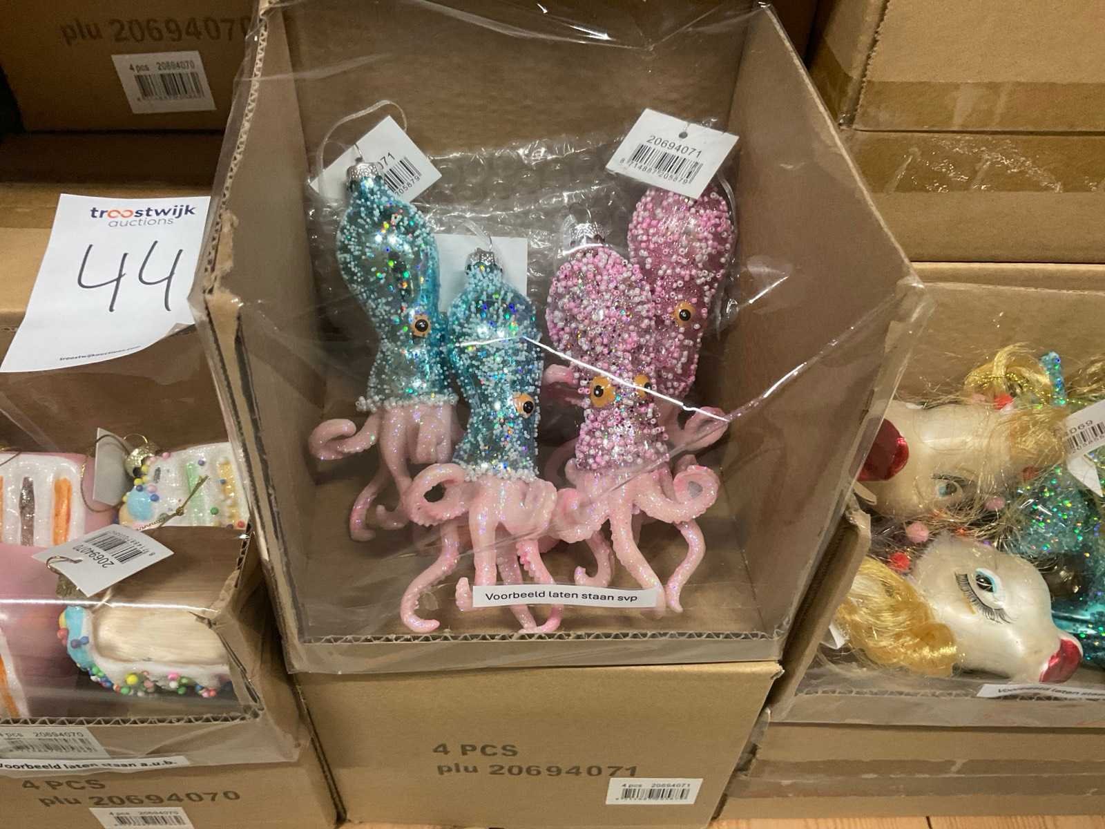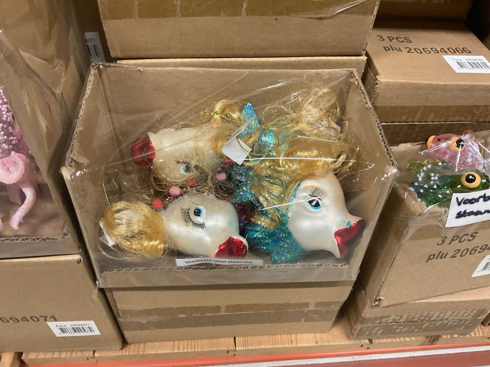 Verschillende soorten kerst-ornamenten. Bestaande uit inhoud van 2 stelling-secties en inhoud metalen rek.