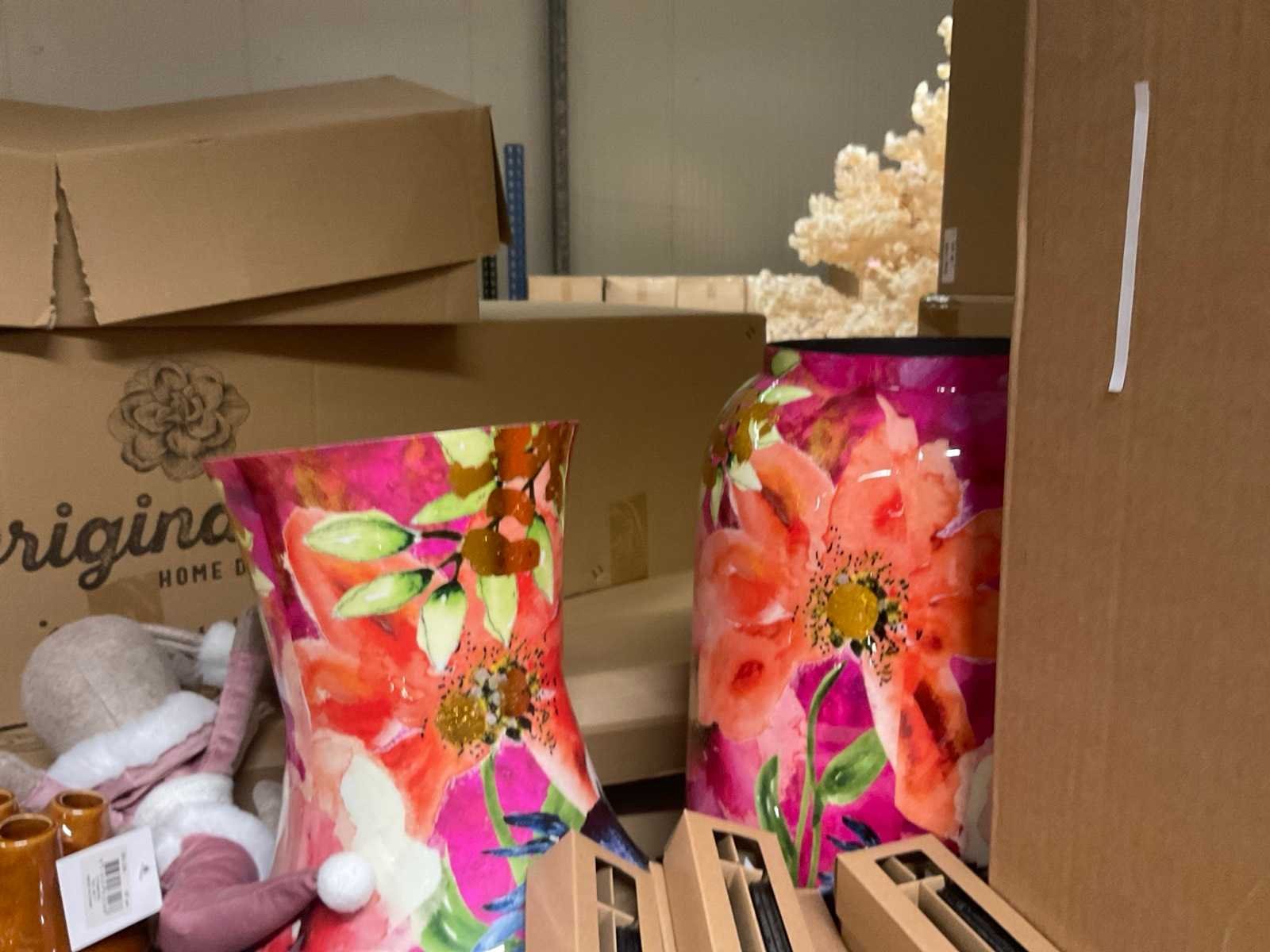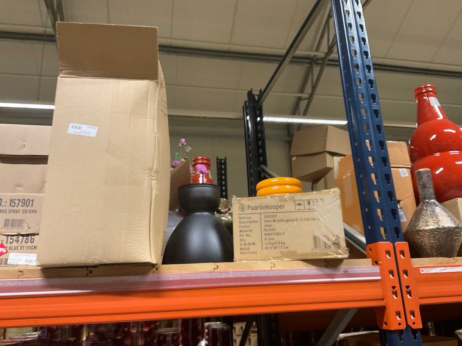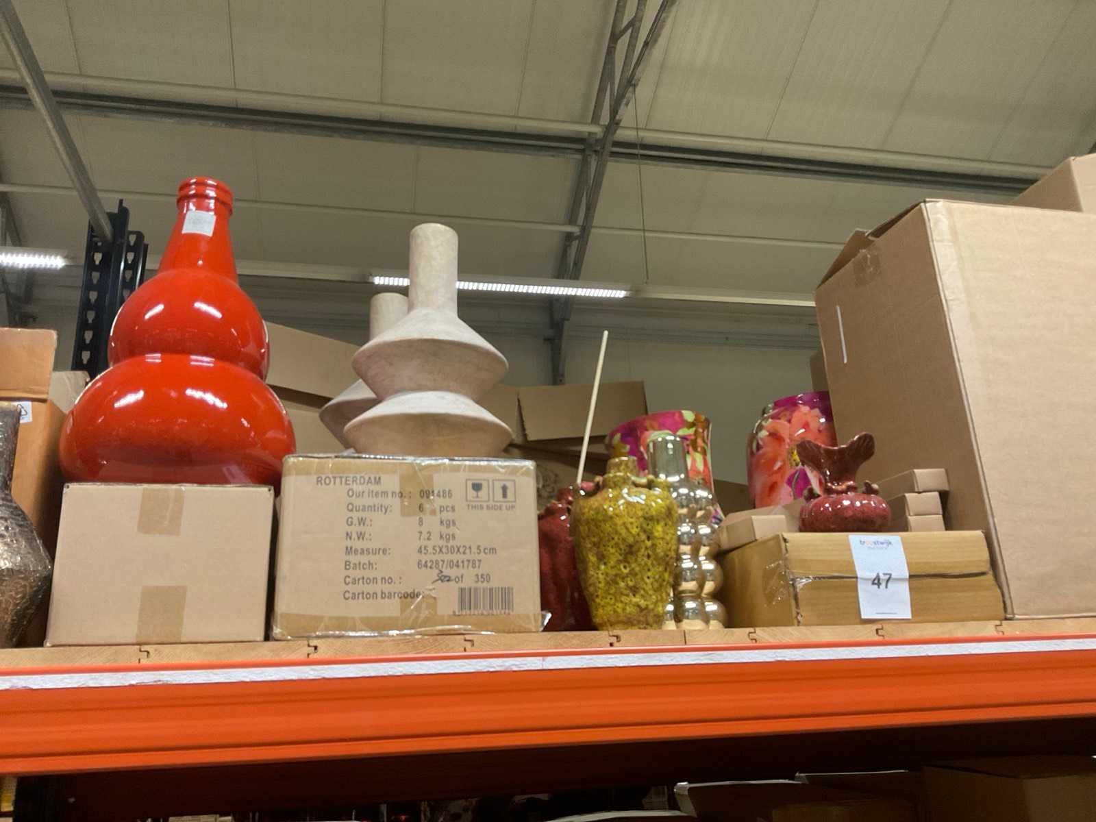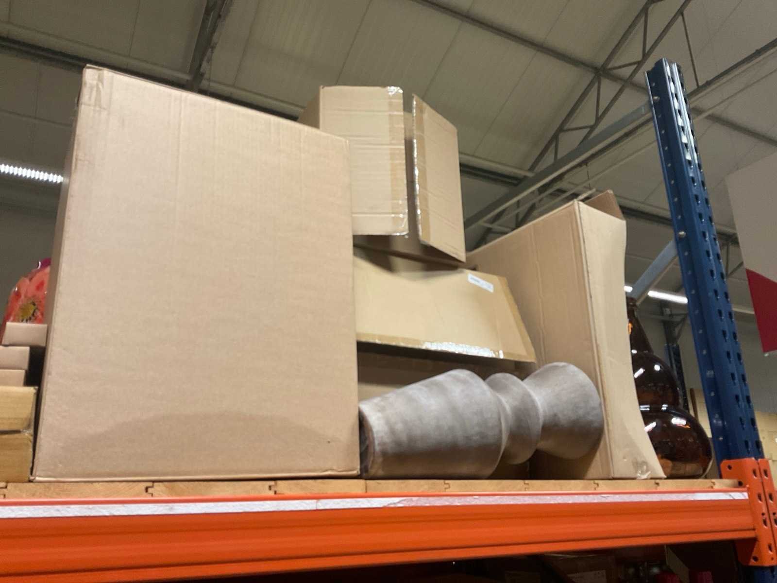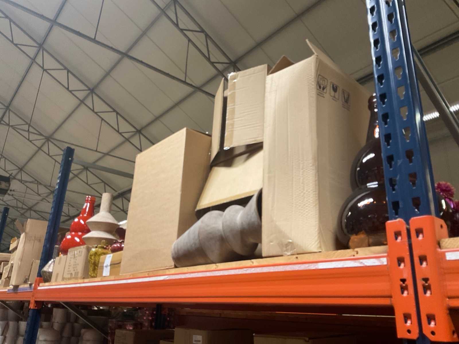 Inhoud van 2 secties van stelling bestaande o.a. uit diverse vazen, bloempotten en kunstbloemen. Stelling niet inbegrepen.