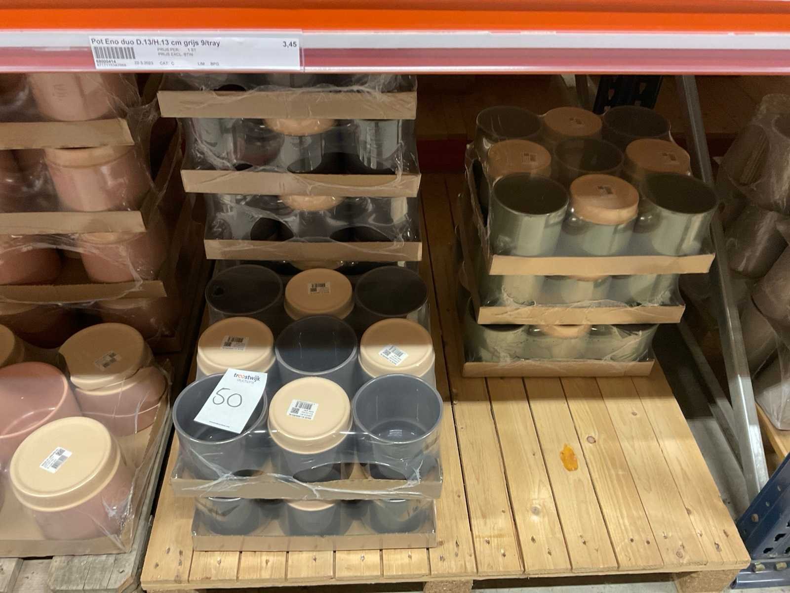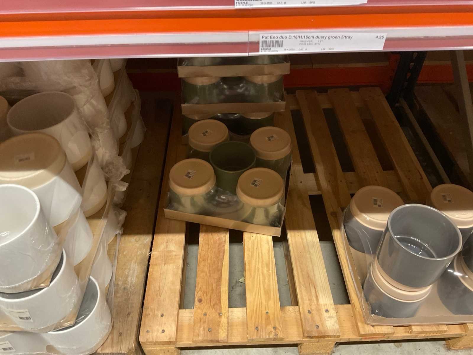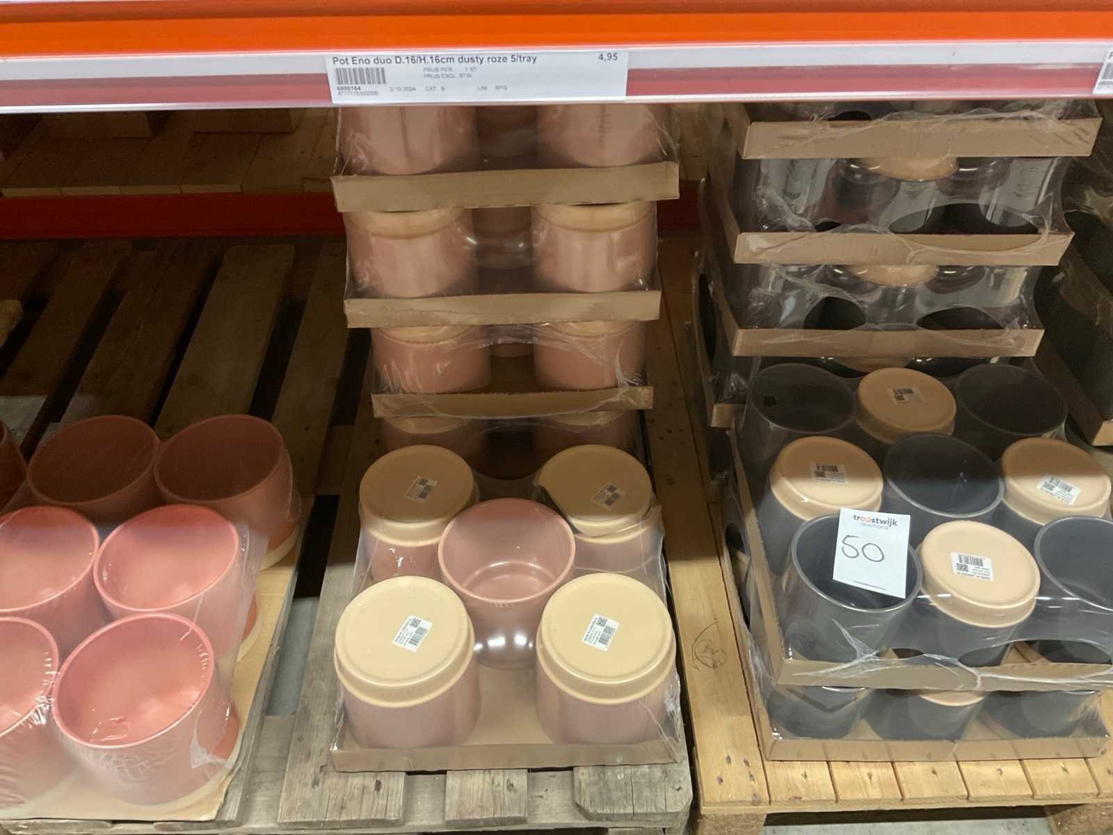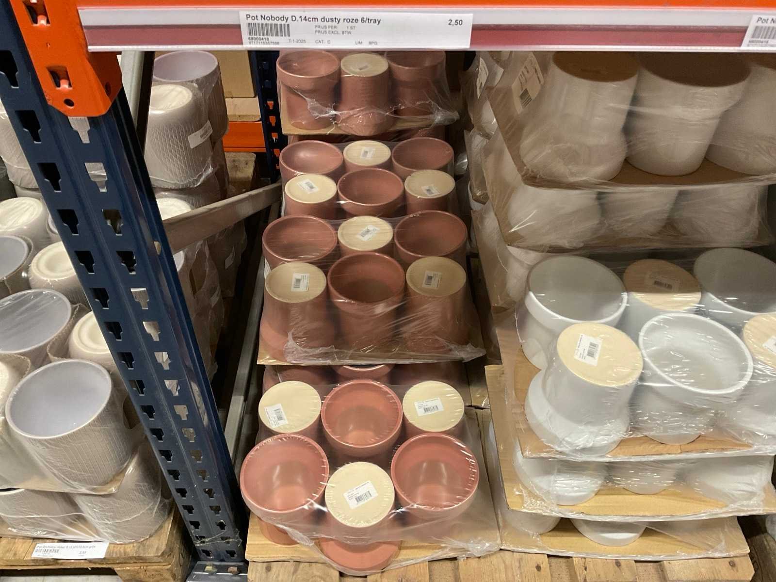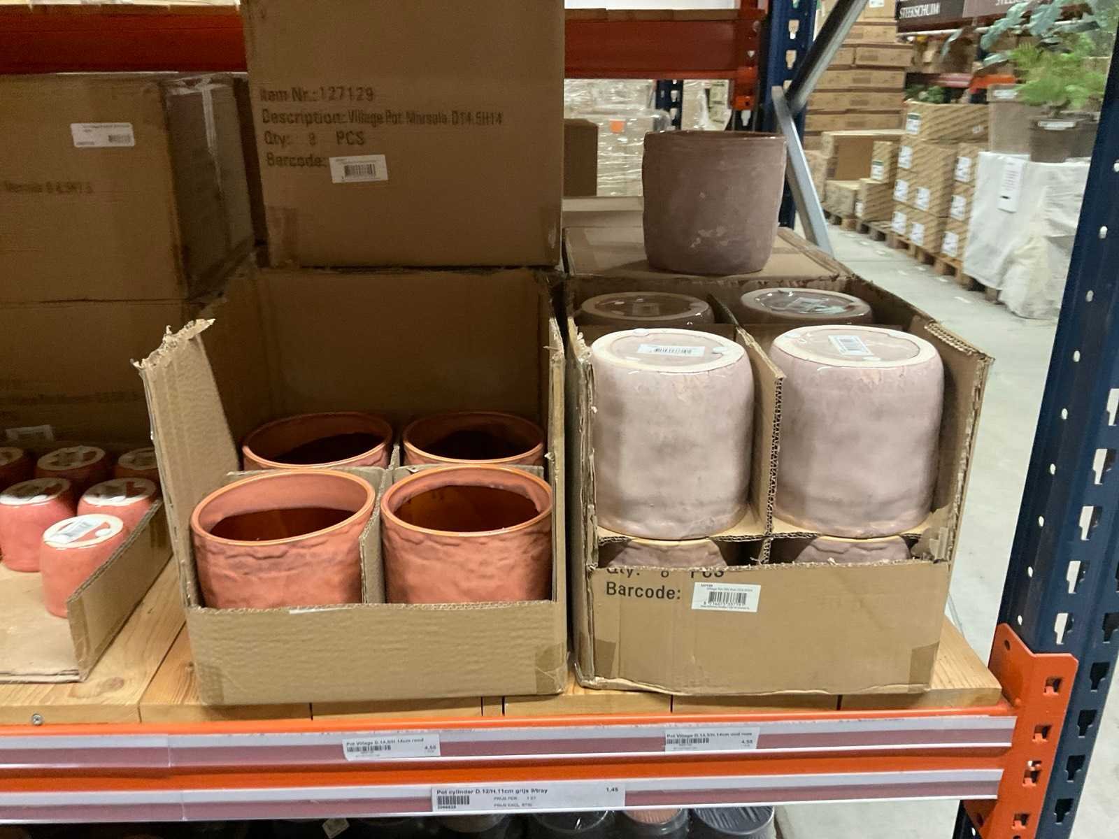 Bestaande uit bloempotten in diverse formaten, kleuren en stijlen in 3 secties en op 1 pallet, inclusief pallets, stelling niet inbegrepen.