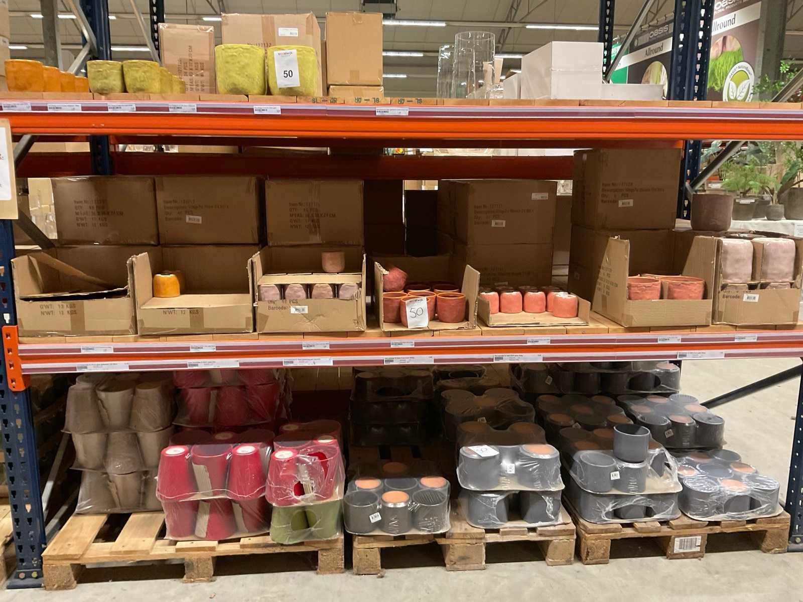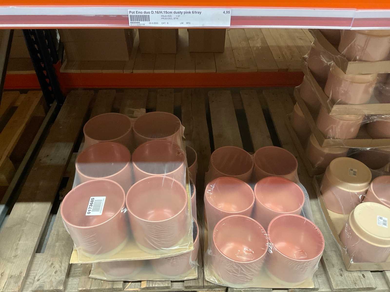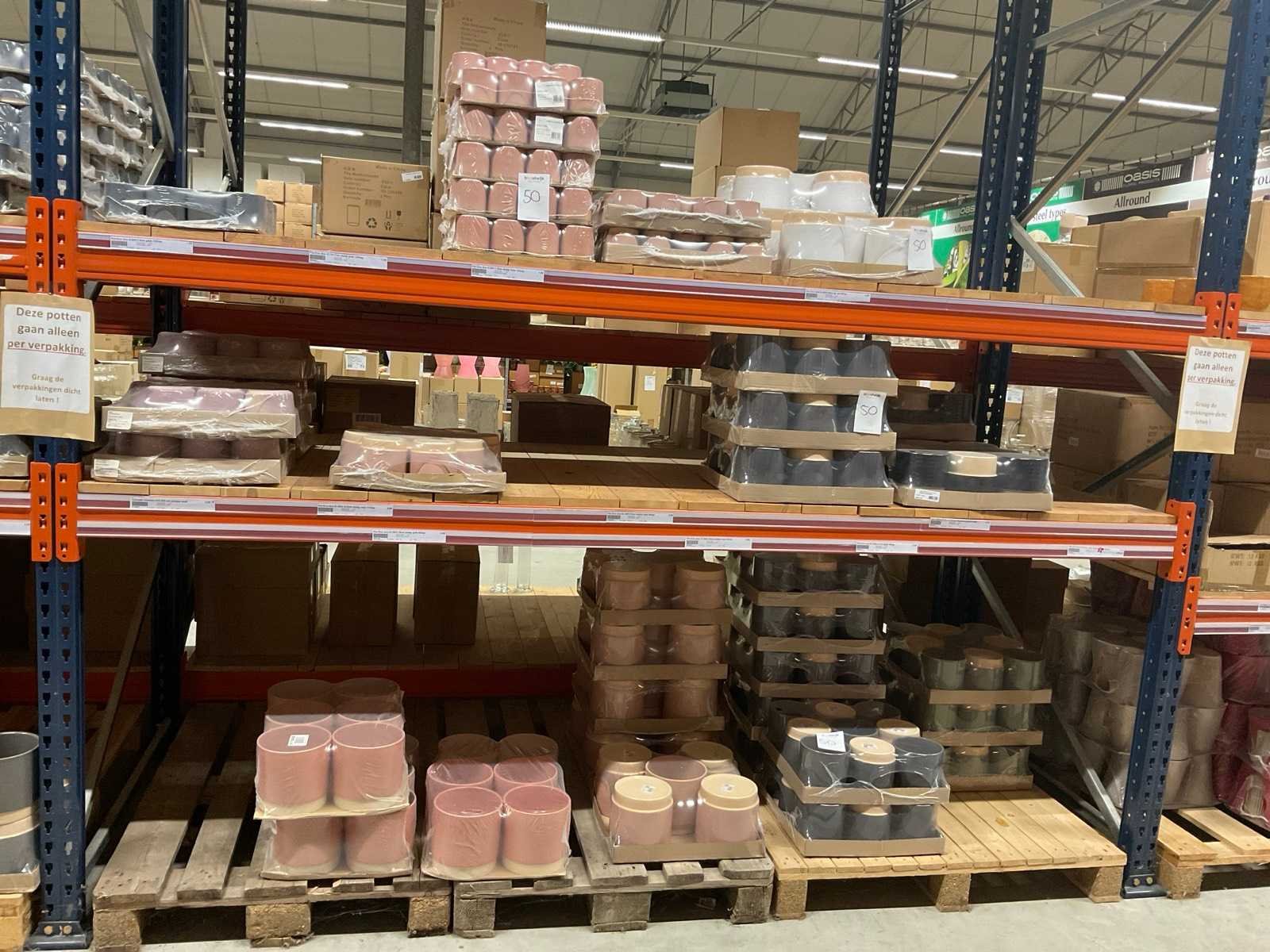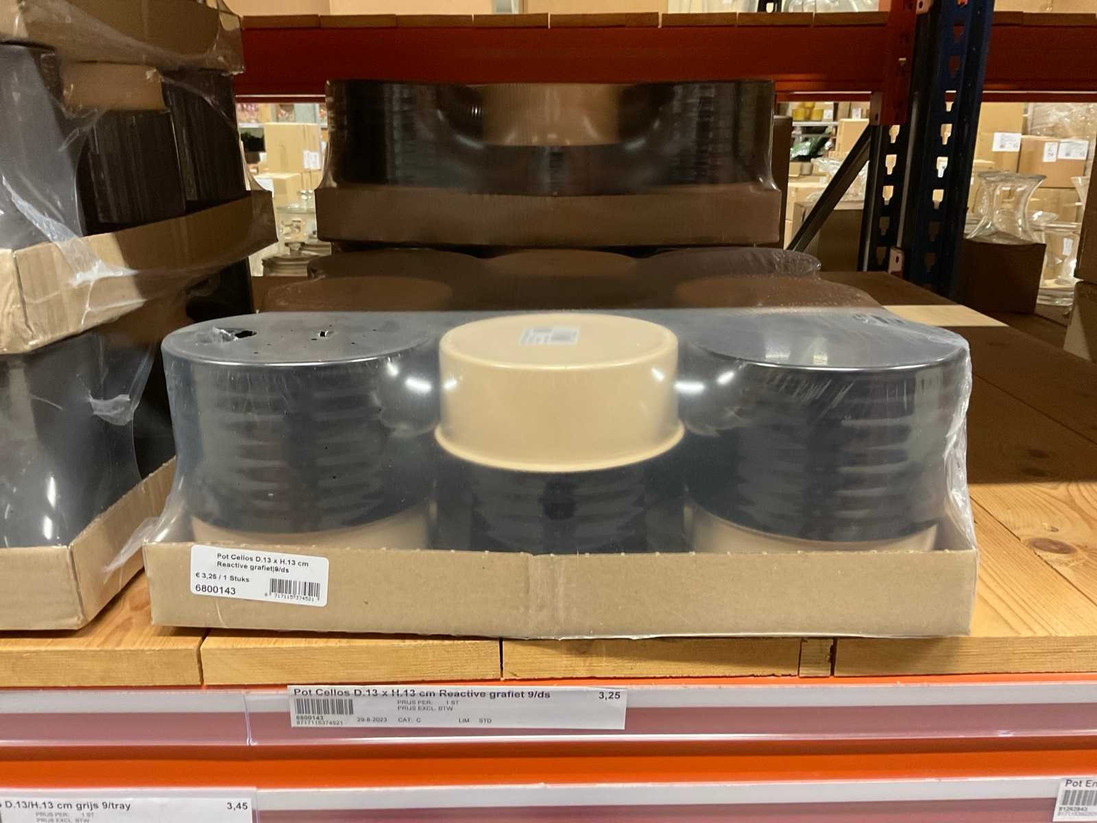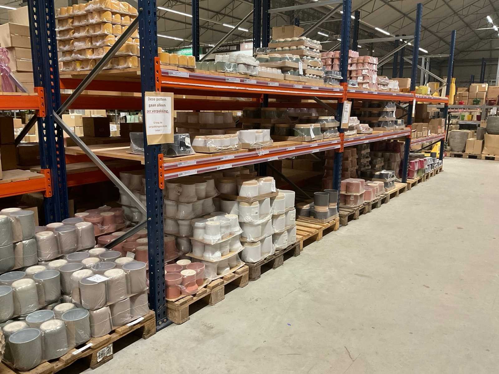 Bestaande uit bloempotten in diverse formaten, kleuren en stijlen in 3 secties en op 1 pallet, inclusief pallets, stelling niet inbegrepen.
