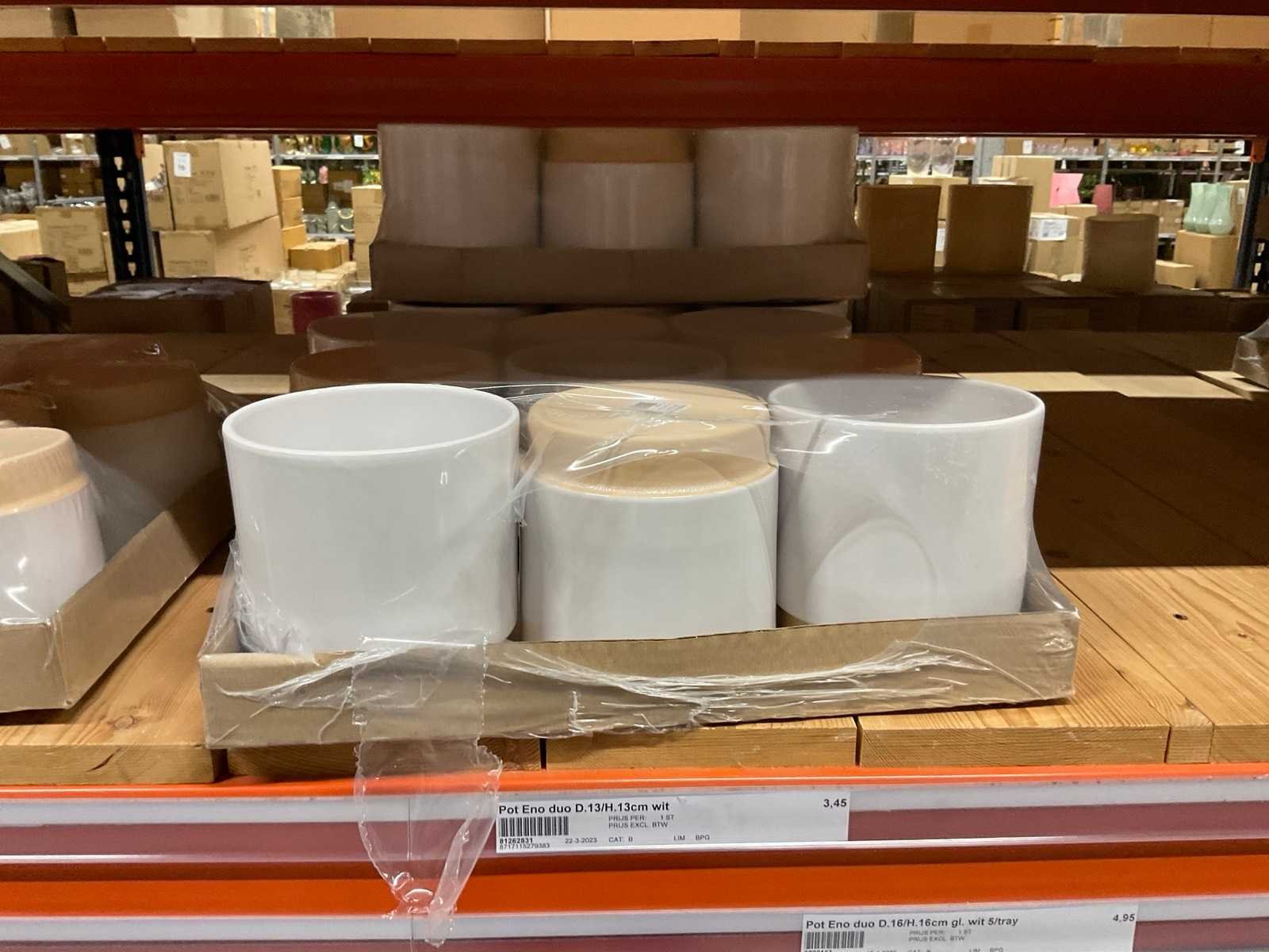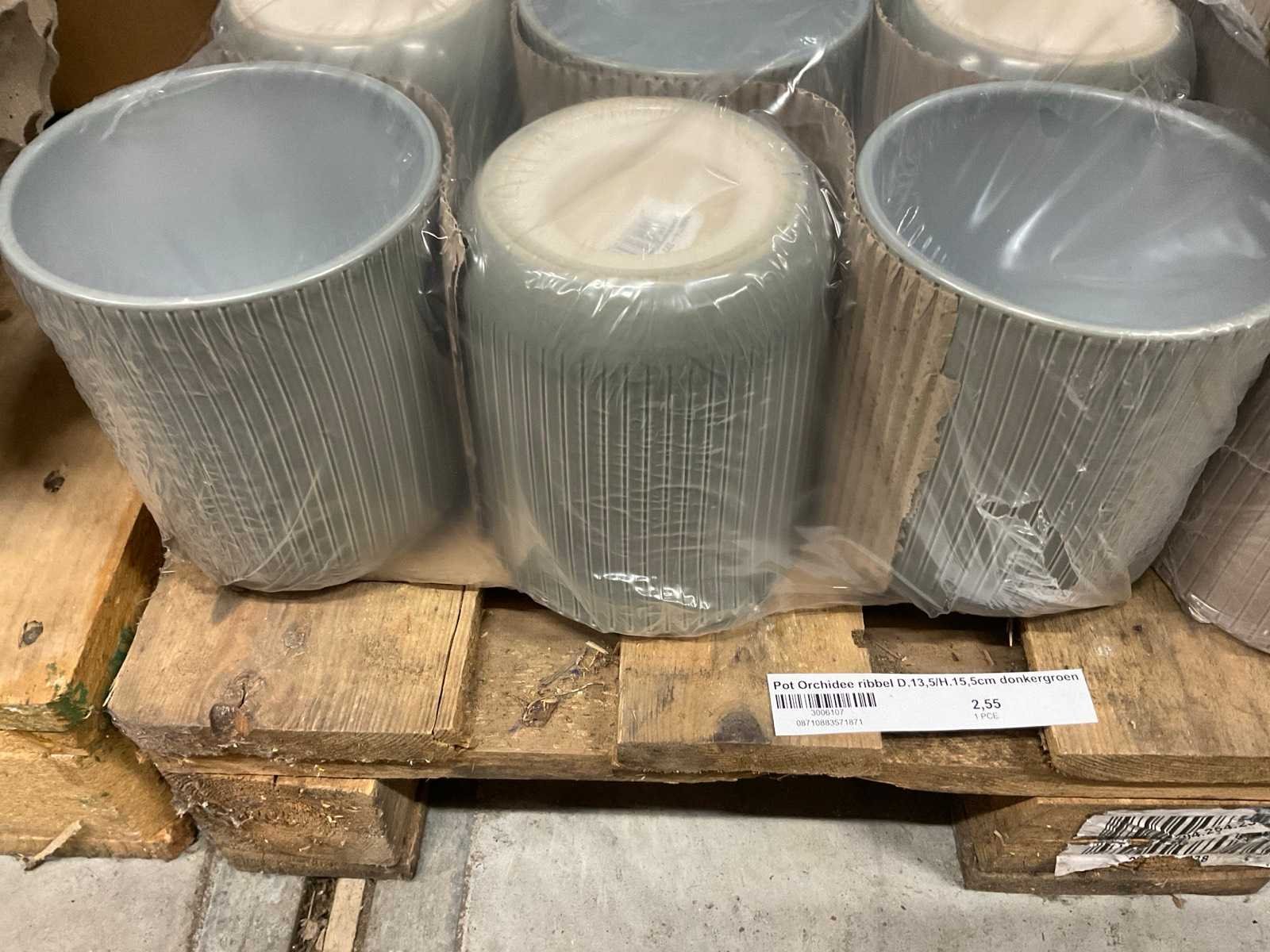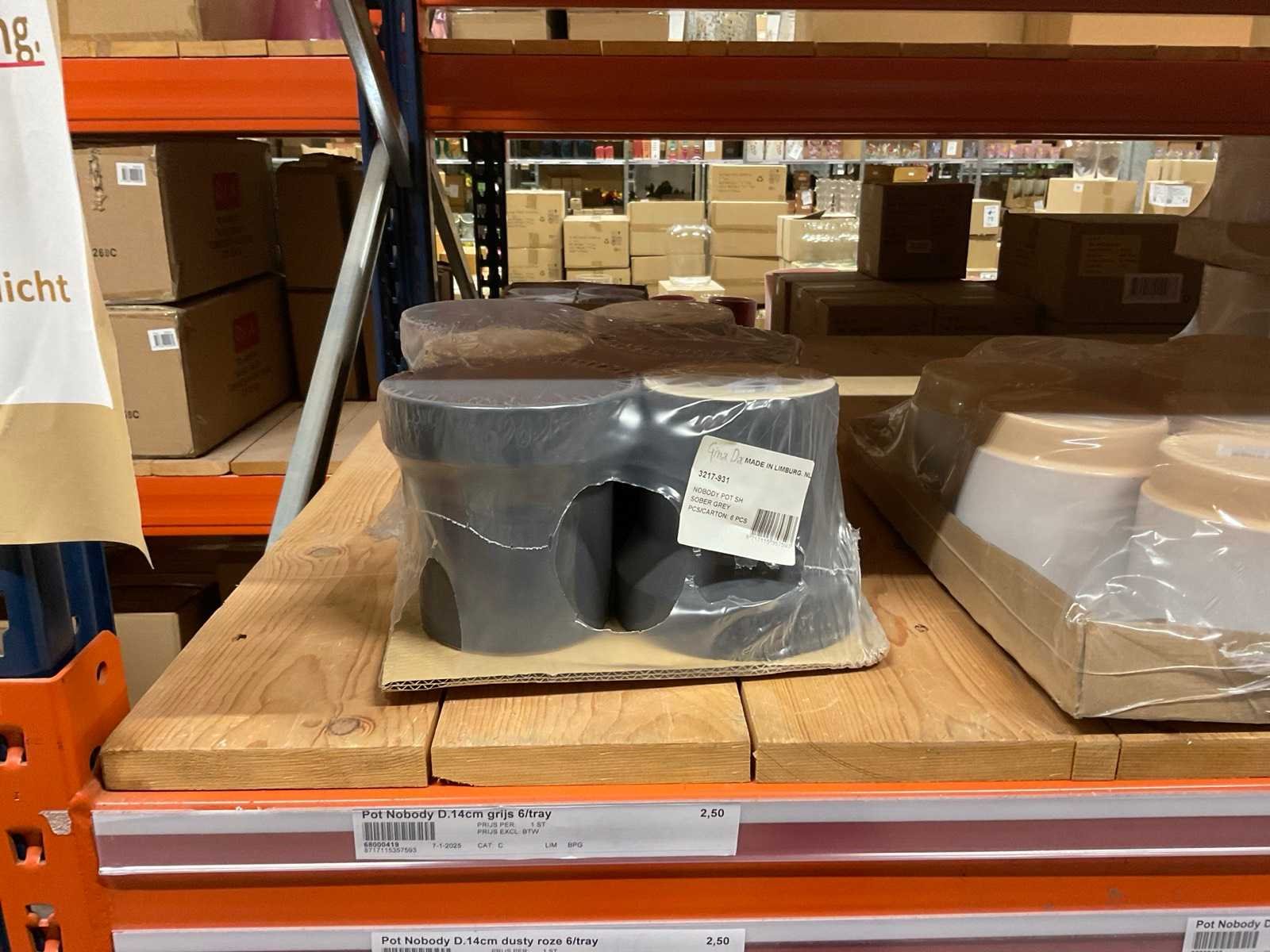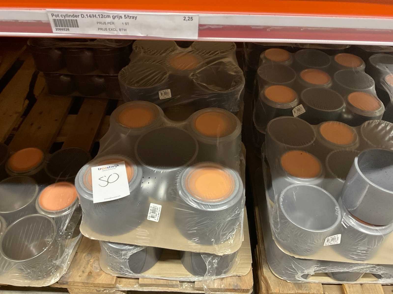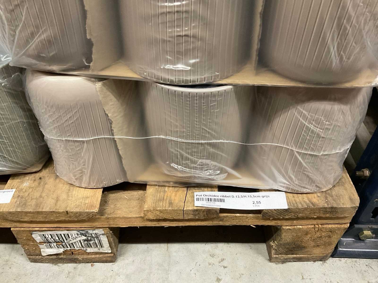 Bestaande uit bloempotten in diverse formaten, kleuren en stijlen in 3 secties en op 1 pallet, inclusief pallets, stelling niet inbegrepen.
